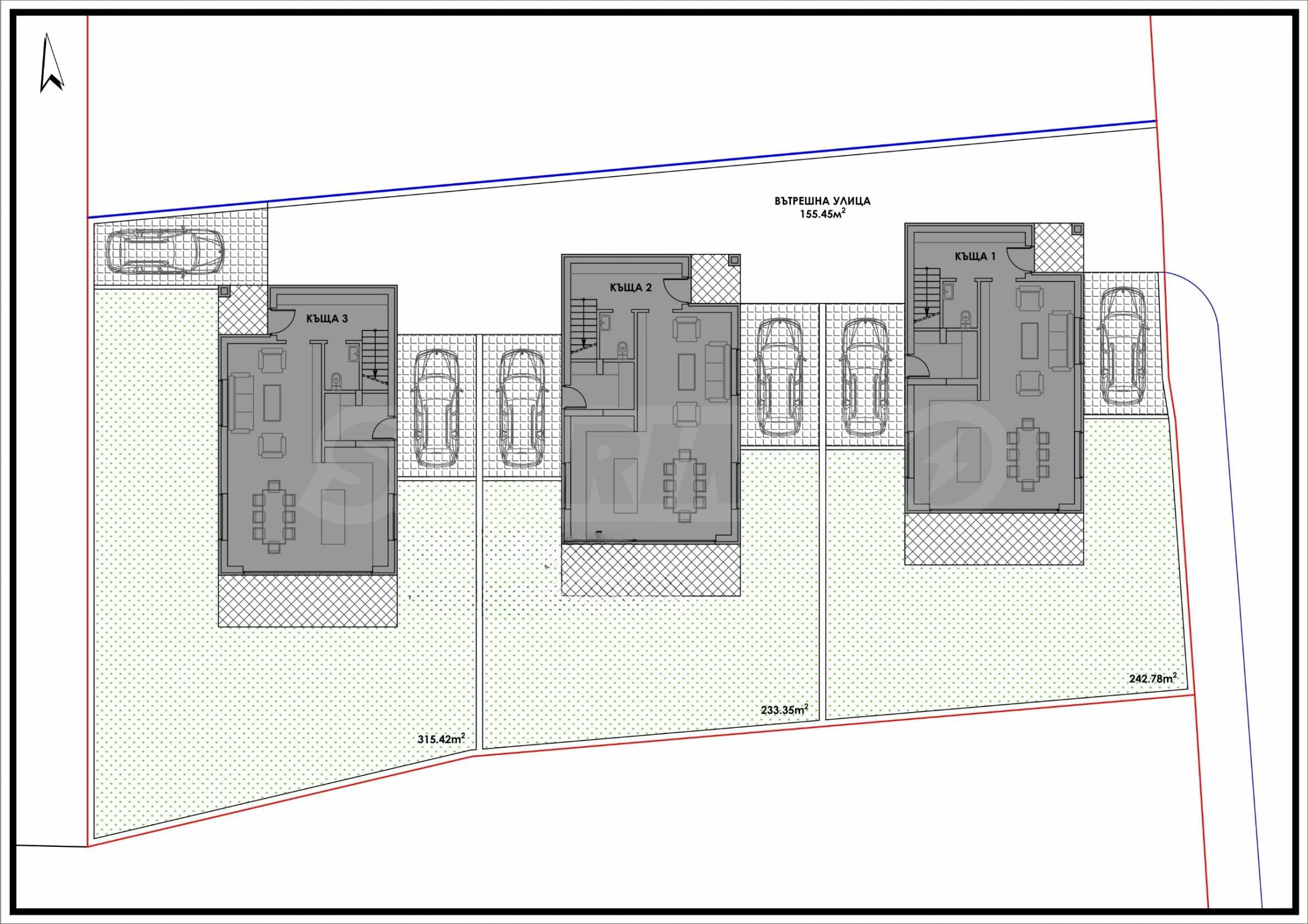 - площ на парцела: 947 кв.м. с проек за три самостоятелни еднофамилни къщи, всяка с обособен двор;