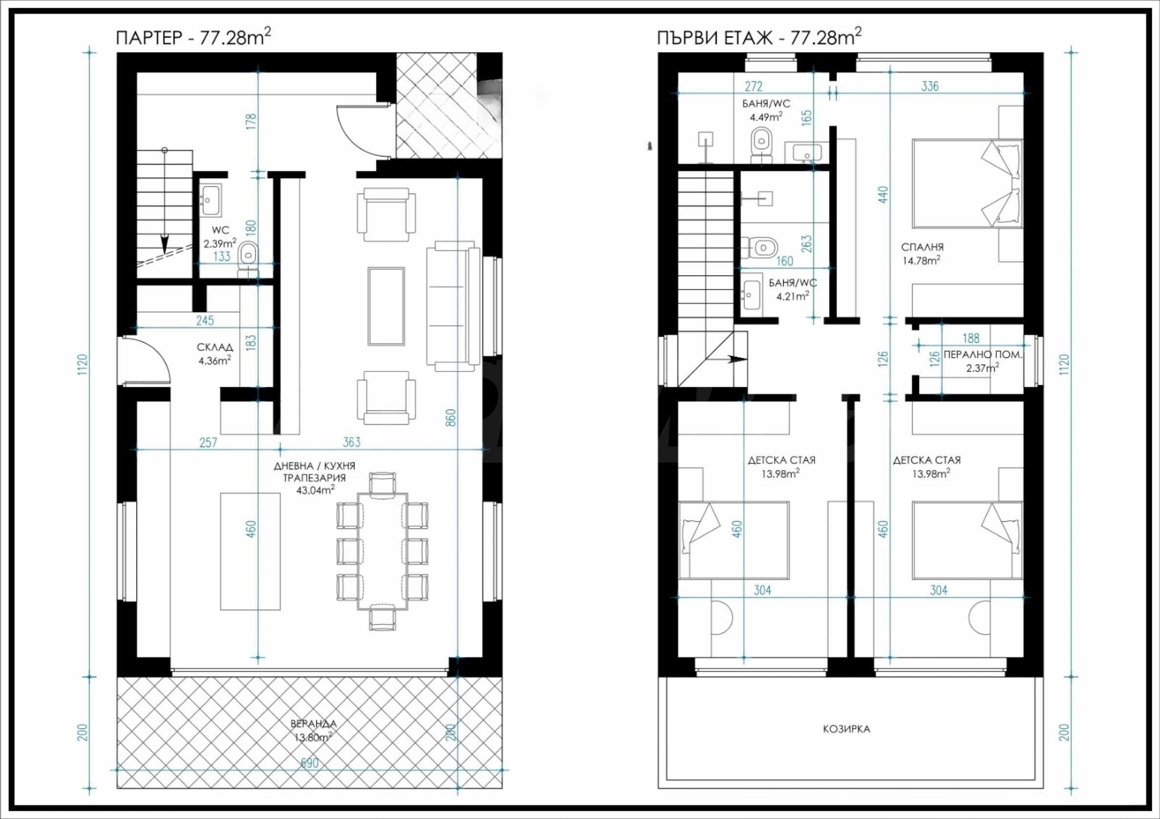 - етаж 1: антре, дневна с кухня и трапезария, санитарно помещение, склад;