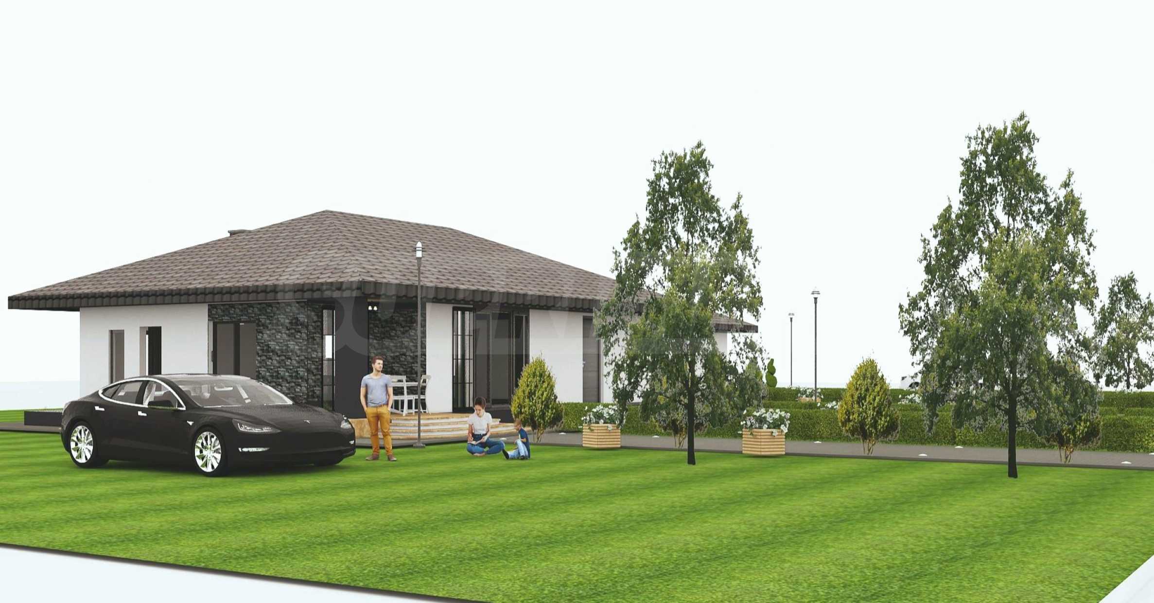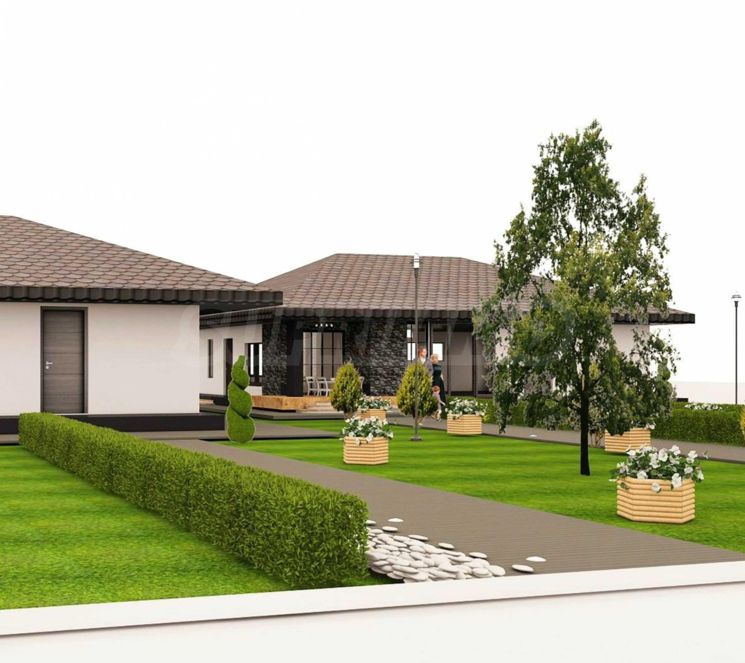 Към парцела има одобрен архитектурен проект за едноетажна къща с РЗП 150,5 кв.м, състояща се от кухня с трапезария, три спални, две бани, гардеробно, мокро помещение и склад. Визията е елегантна, с керамични керемиди, мазилка и цокъл от цепени камъни. В съседния парцел се предвижда изграждане на къща със същата архитектурна линия, ситуирана така, че да не закрива гледката или слънцето.