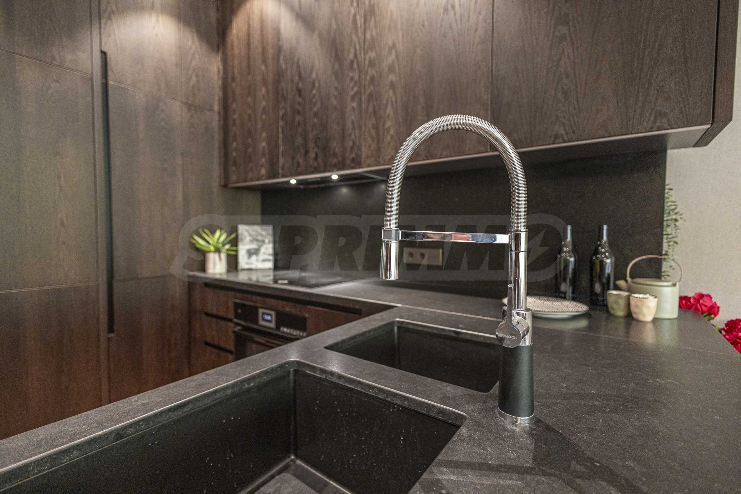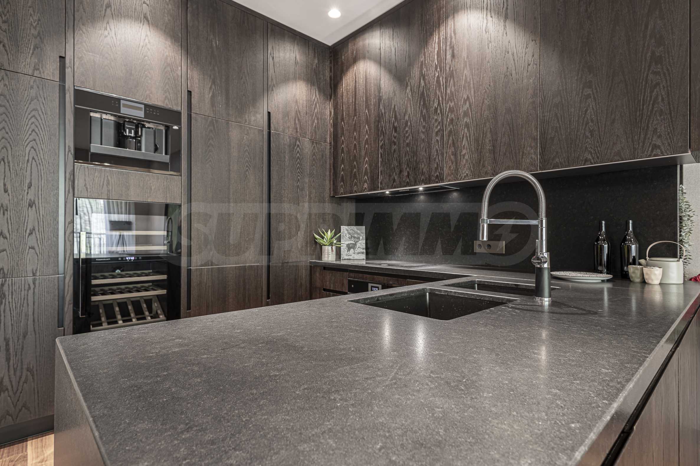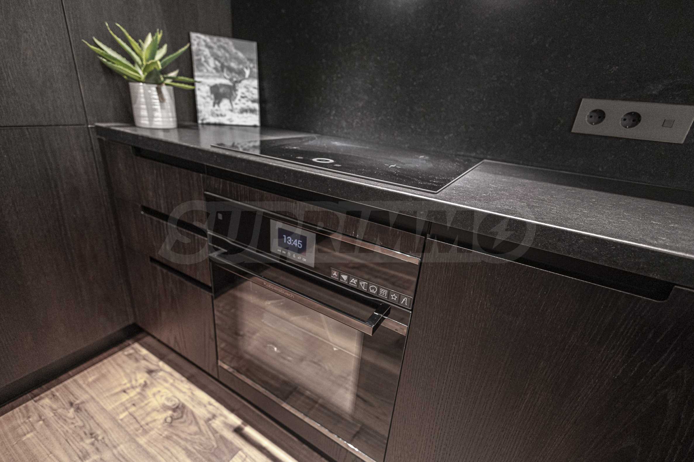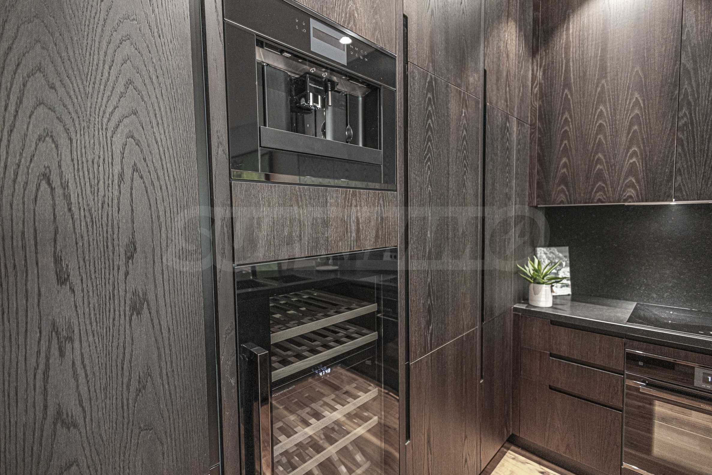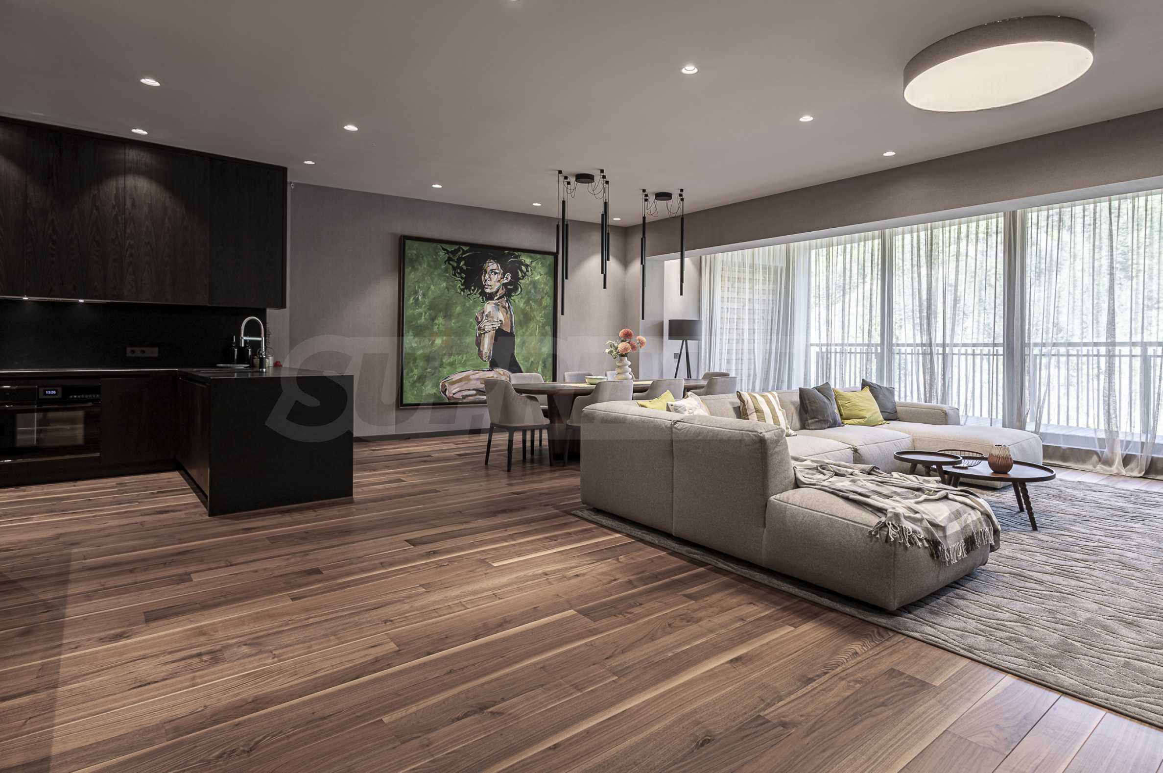Апартаментът е завършен и обзаведен с най-висок клас материали, мебели и уреди. В дневната е монтирана модерна и функционална кухня с вградени уреди Mielе. Всички помещения освен баните са завършени с подова настилка от естествен паркет.
