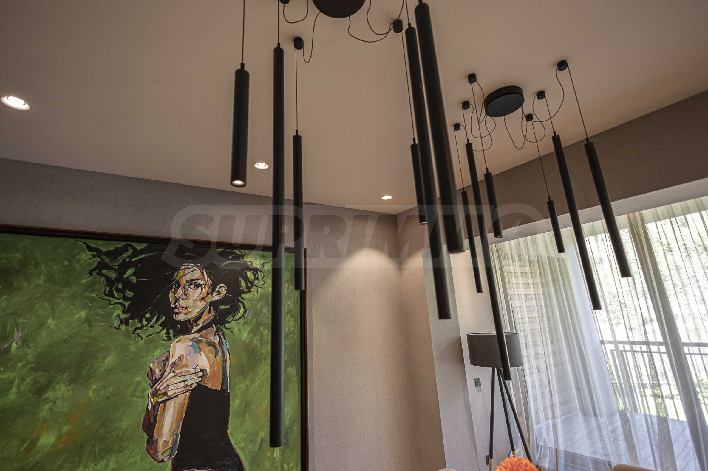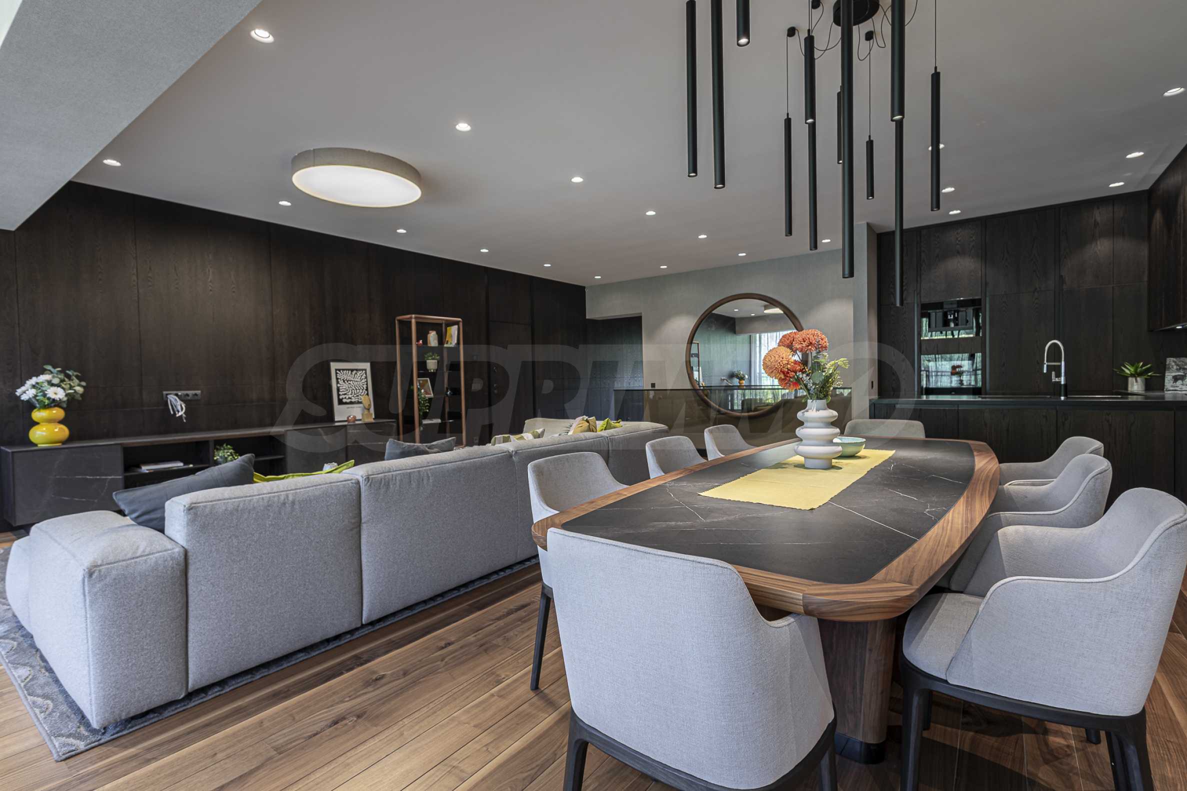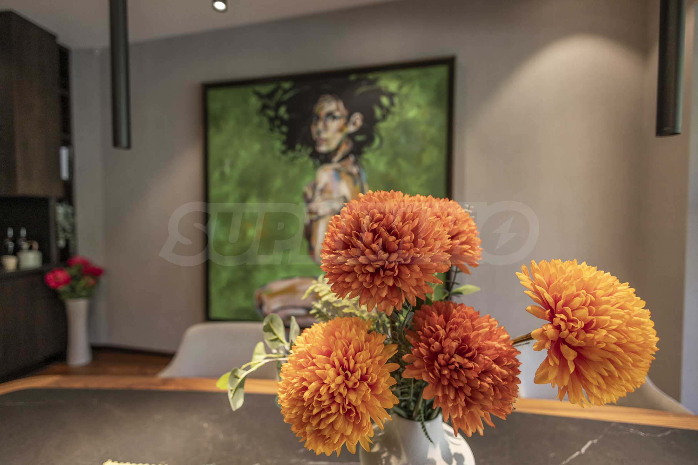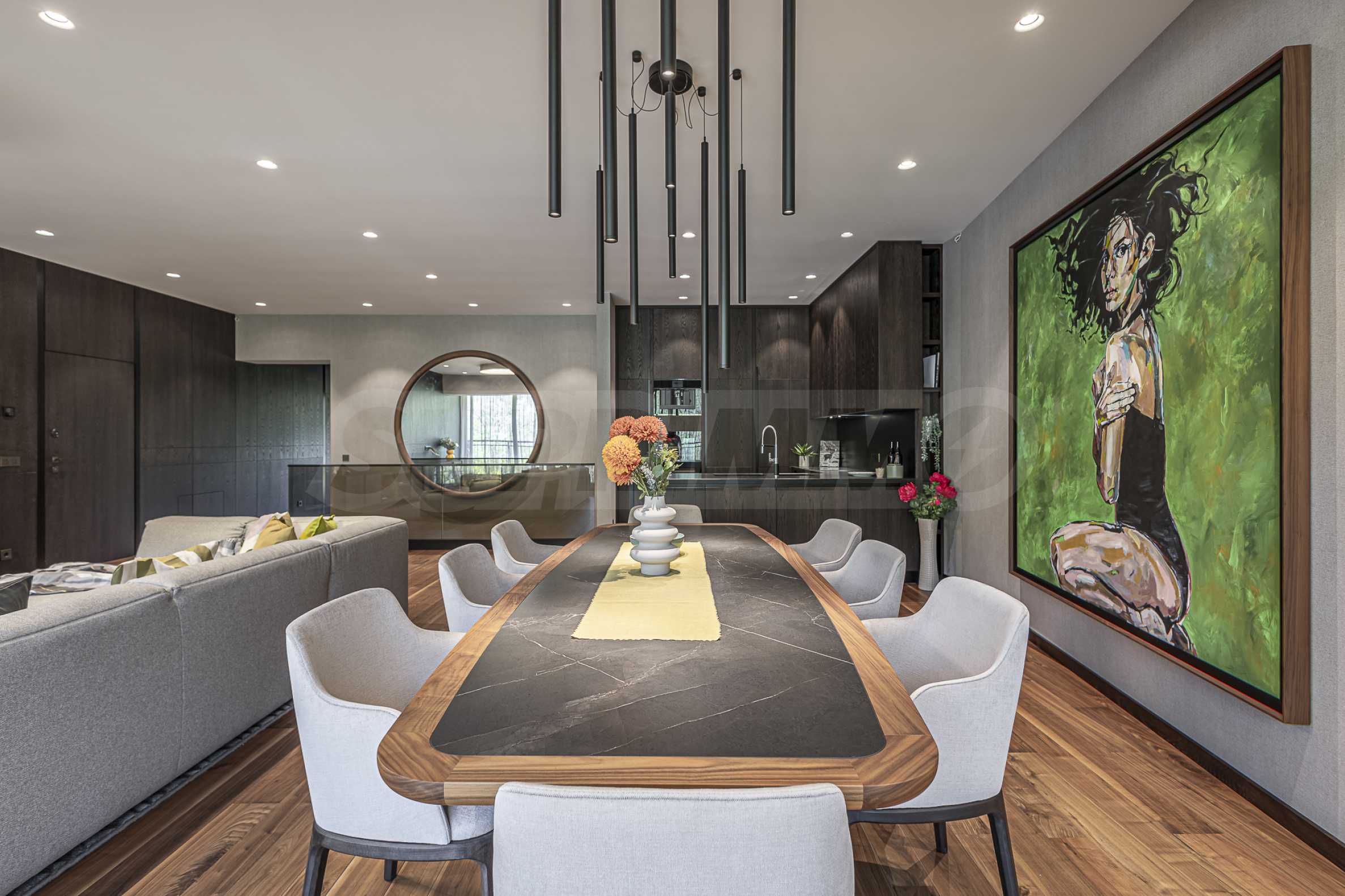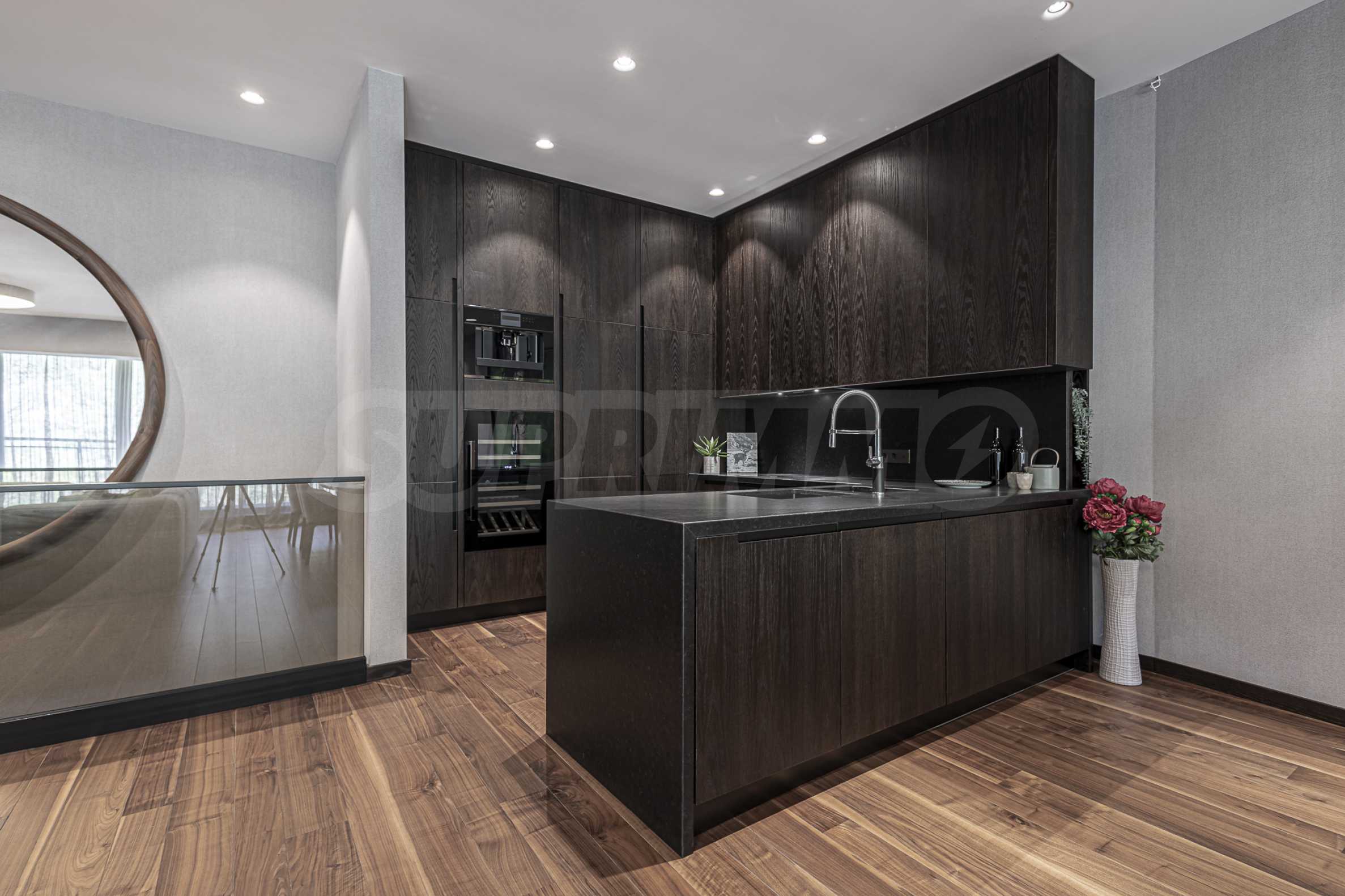 Апартаментът е завършен и обзаведен с най-висок клас материали, мебели и уреди. В дневната е монтирана модерна и функционална кухня с вградени уреди Mielе. Всички помещения освен баните са завършени с подова настилка от естествен паркет.