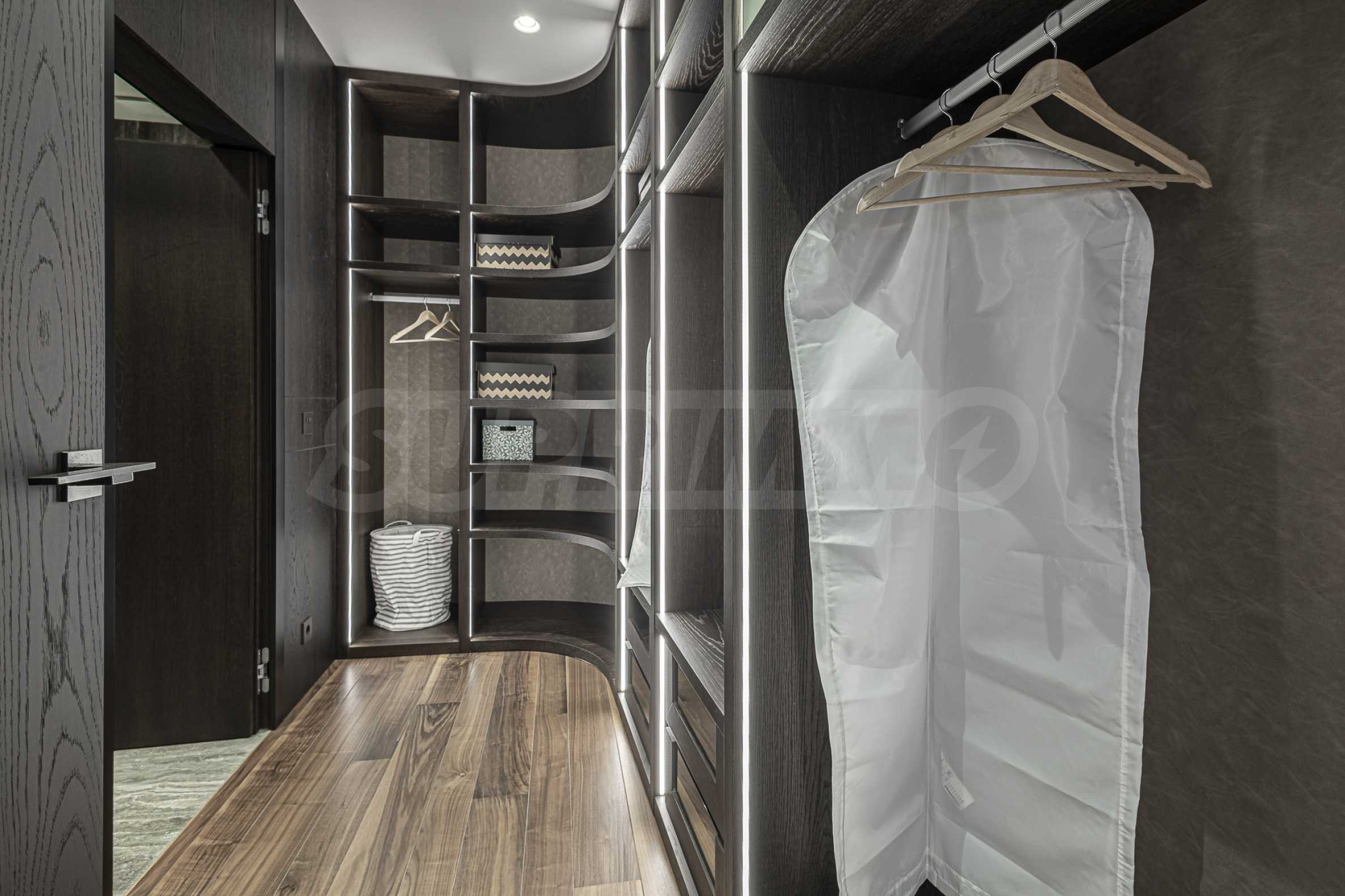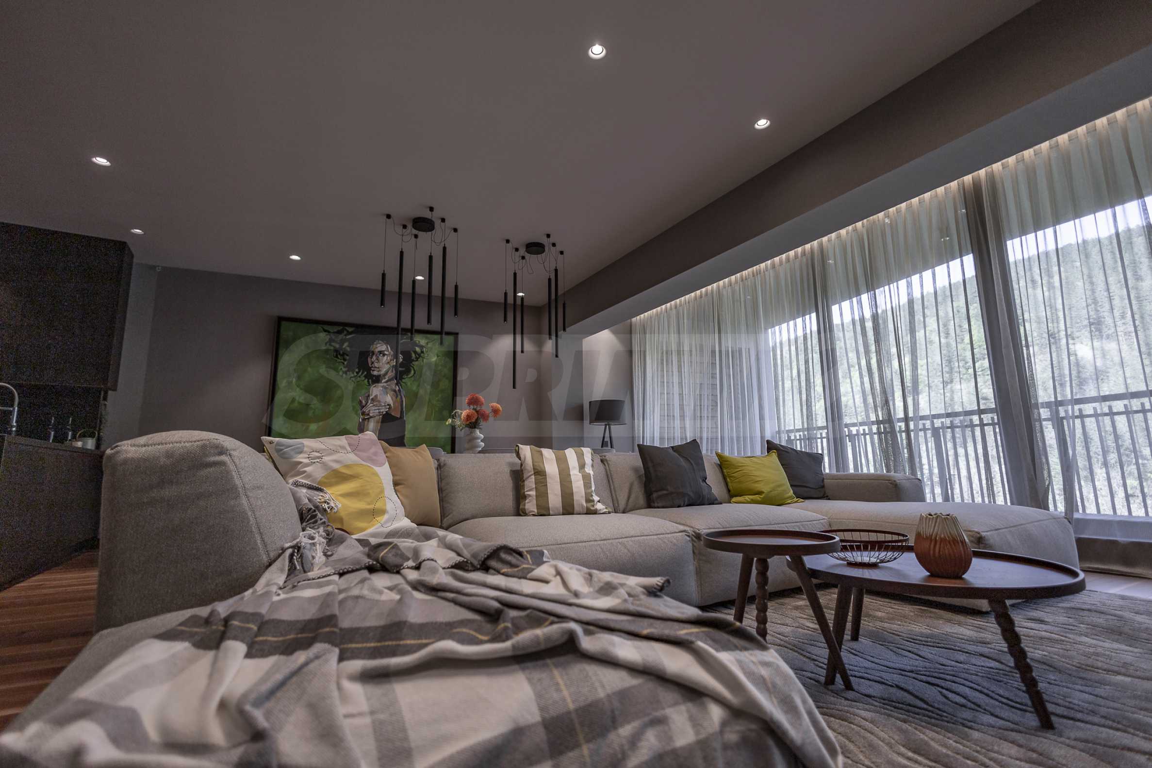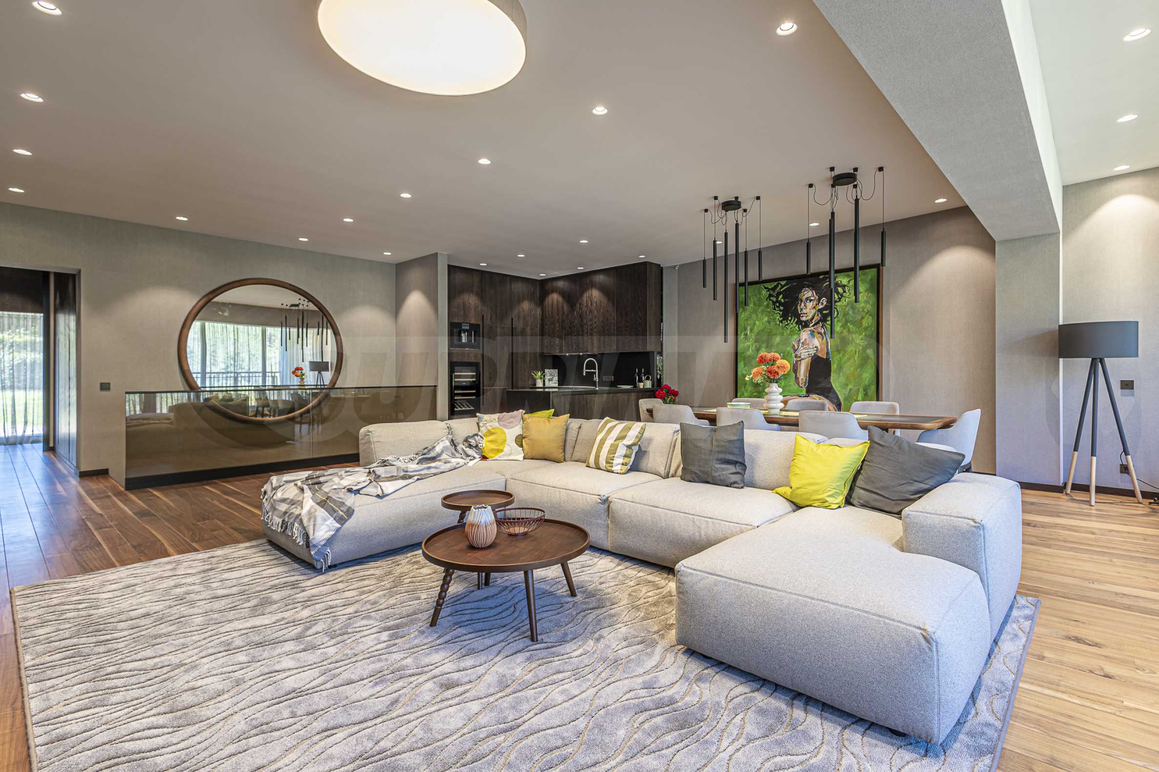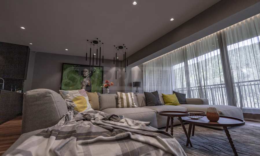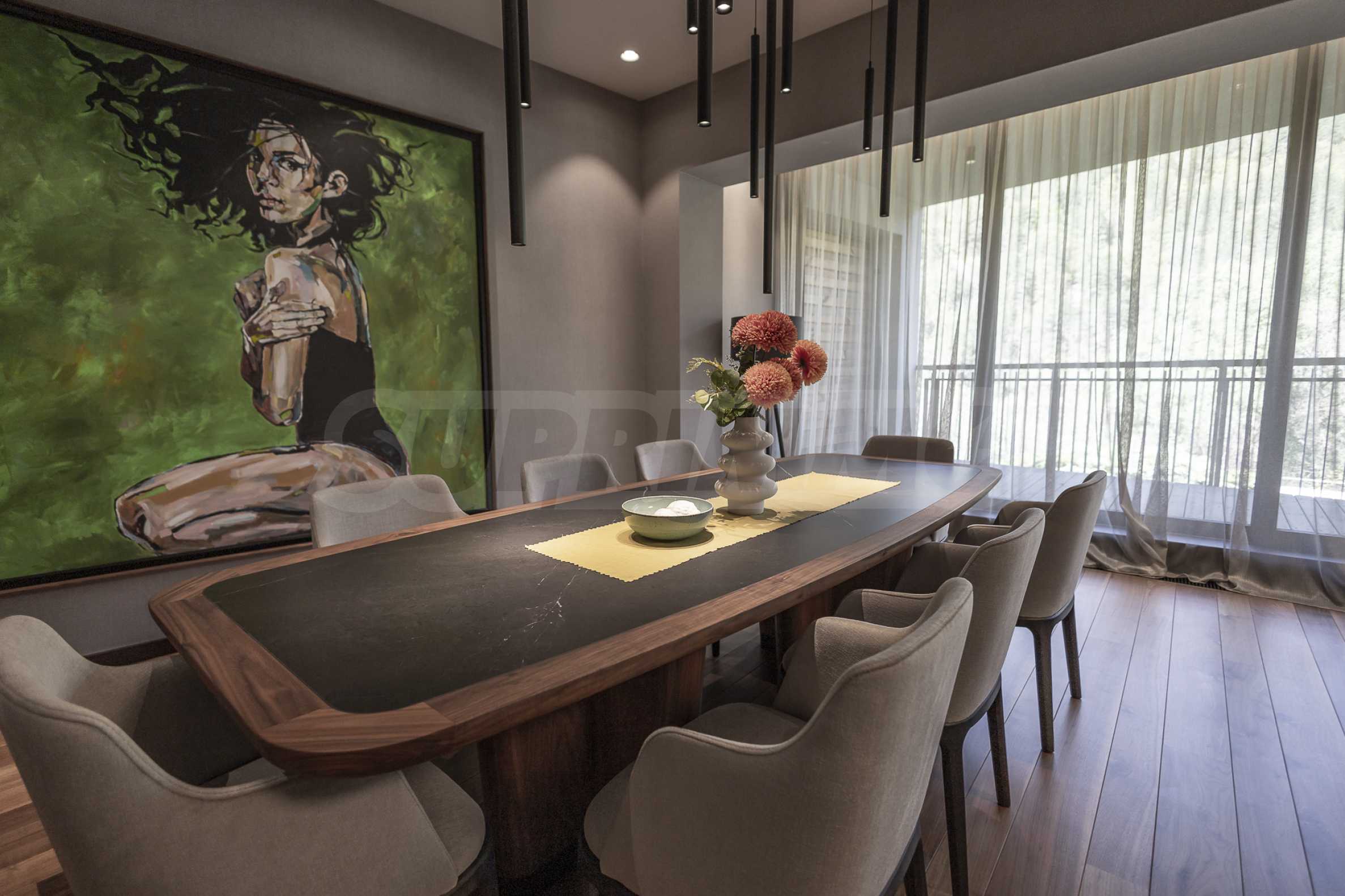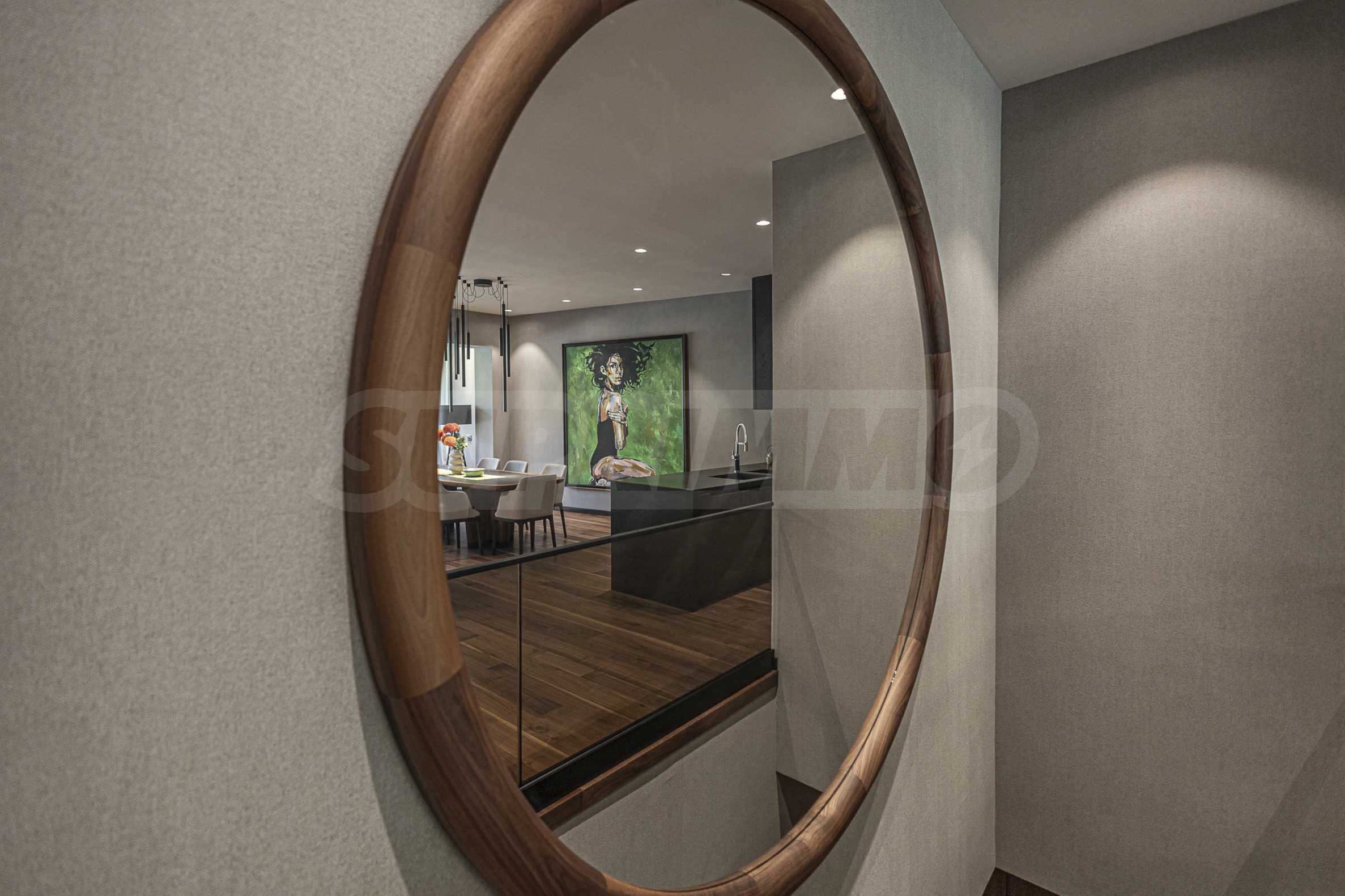 Апартаментът е завършен и обзаведен с най-висок клас материали, мебели и уреди. В дневната е монтирана модерна и функционална кухня с вградени уреди Mielе. Всички помещения освен баните са завършени с подова настилка от естествен паркет.