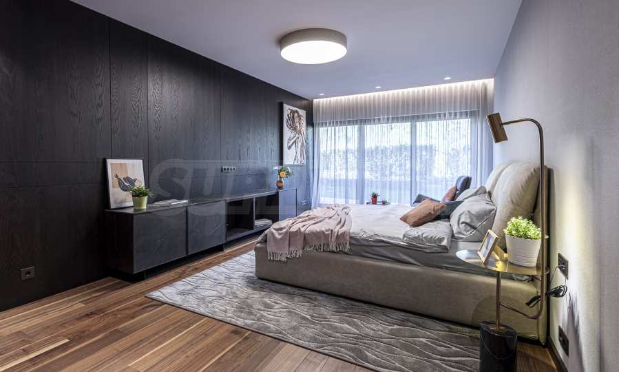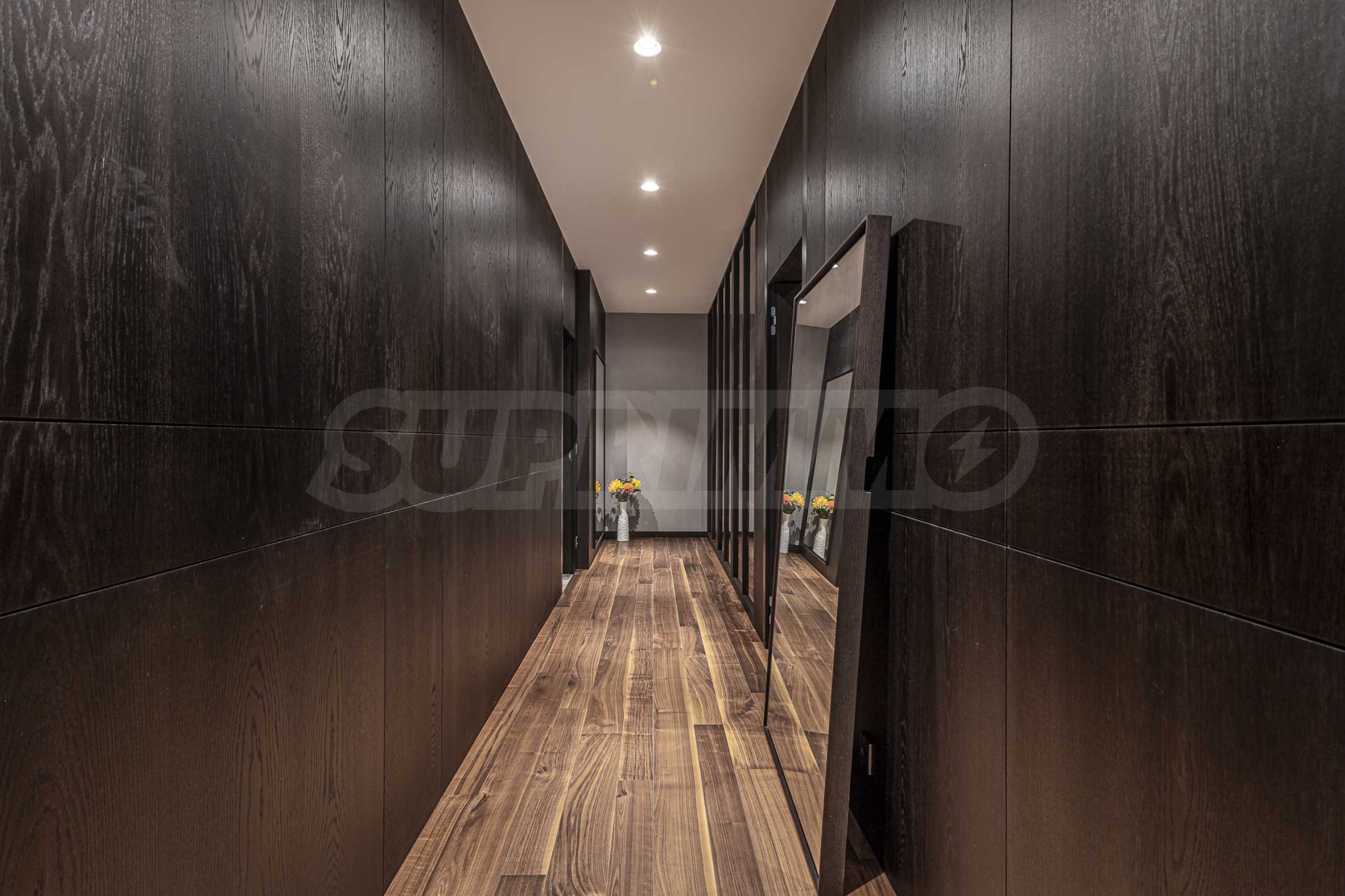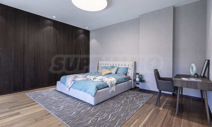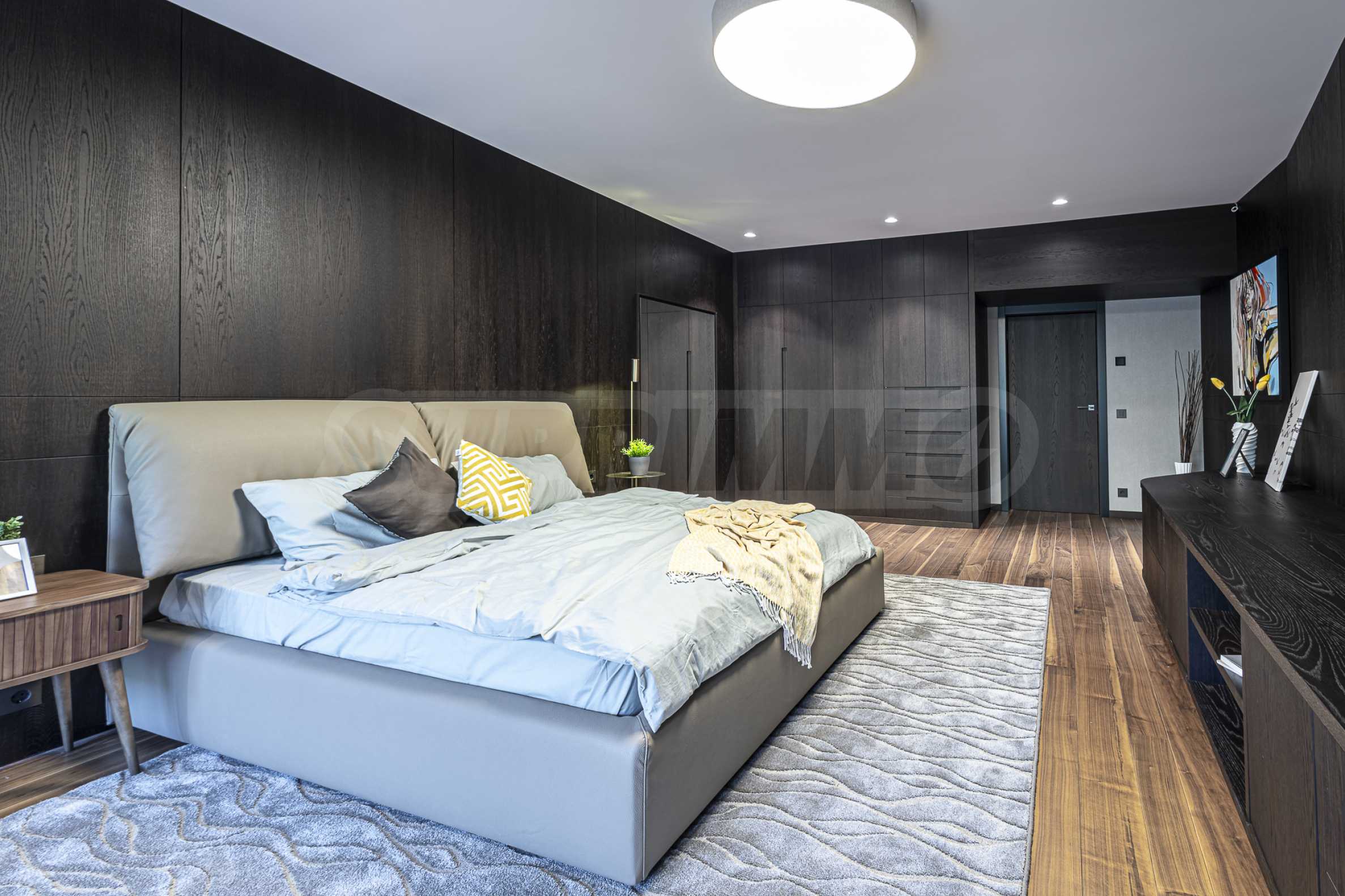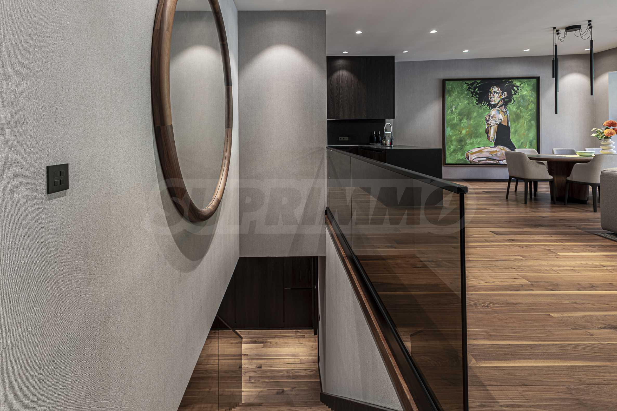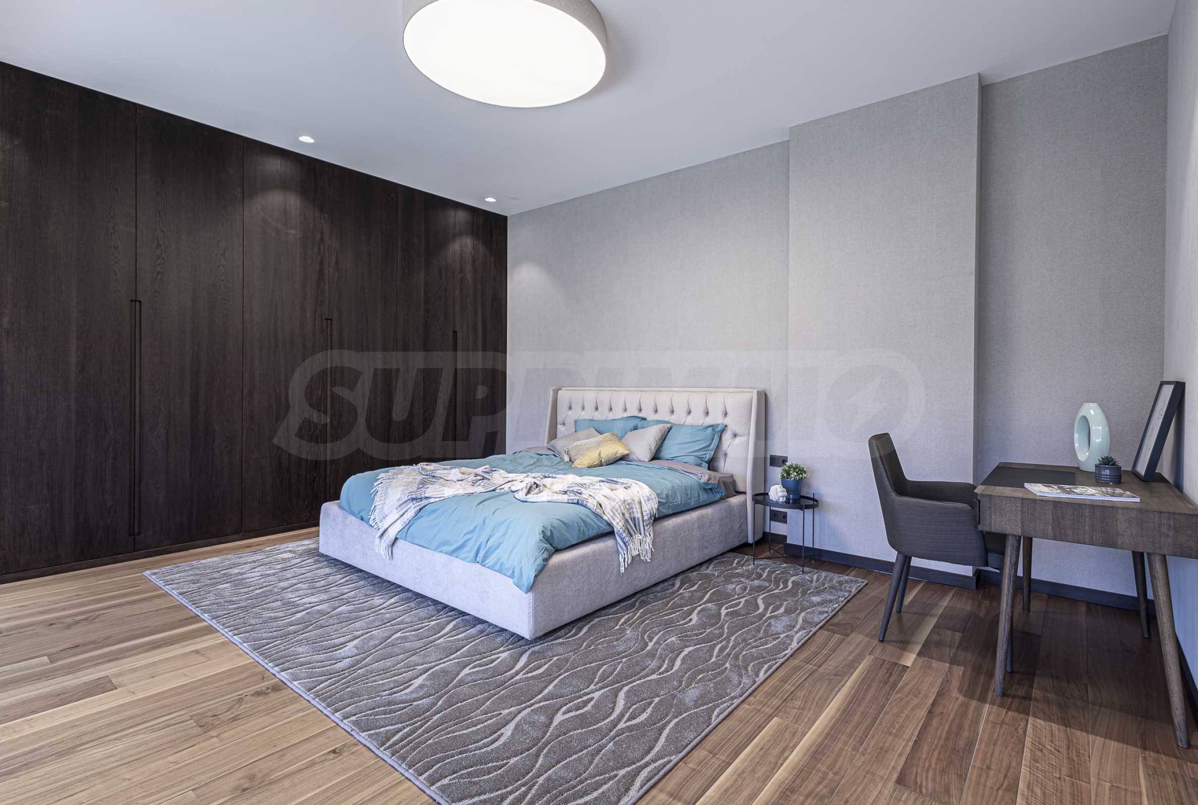 Апартаментът е завършен и обзаведен с най-висок клас материали, мебели и уреди. В дневната е монтирана модерна и функционална кухня с вградени уреди Mielе. Всички помещения освен баните са завършени с подова настилка от естествен паркет.