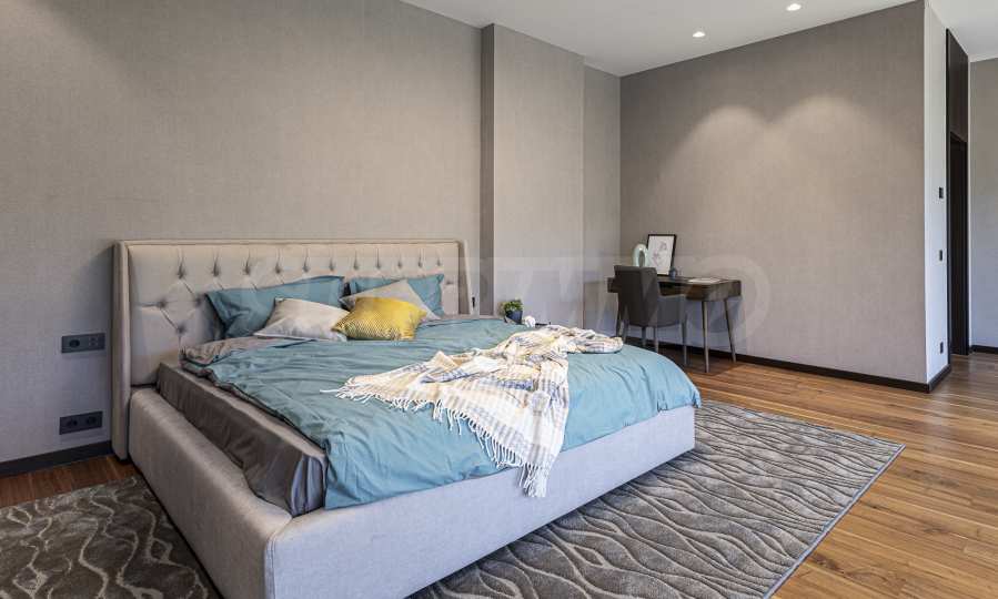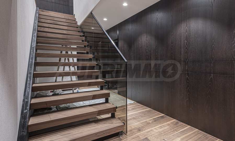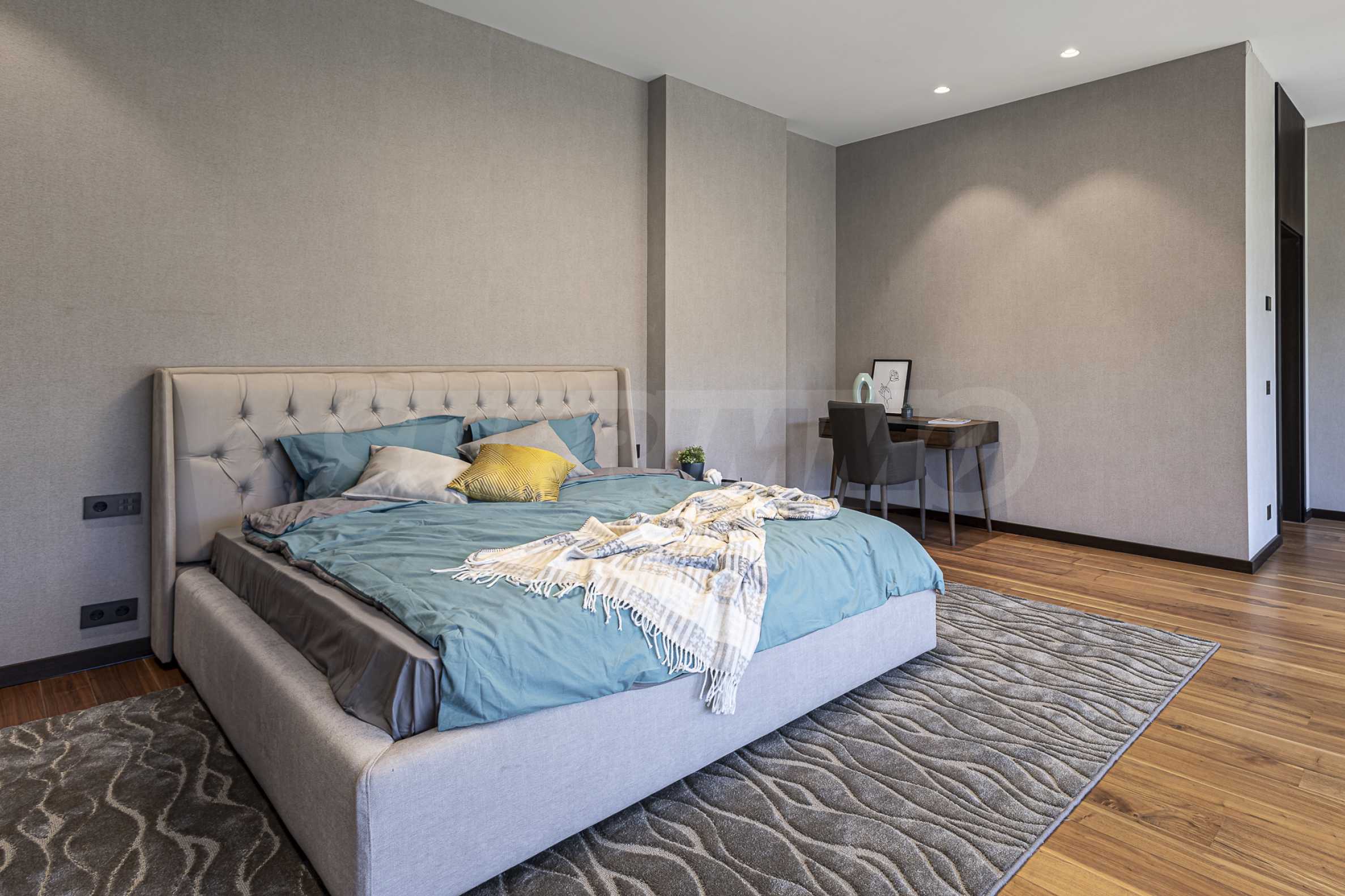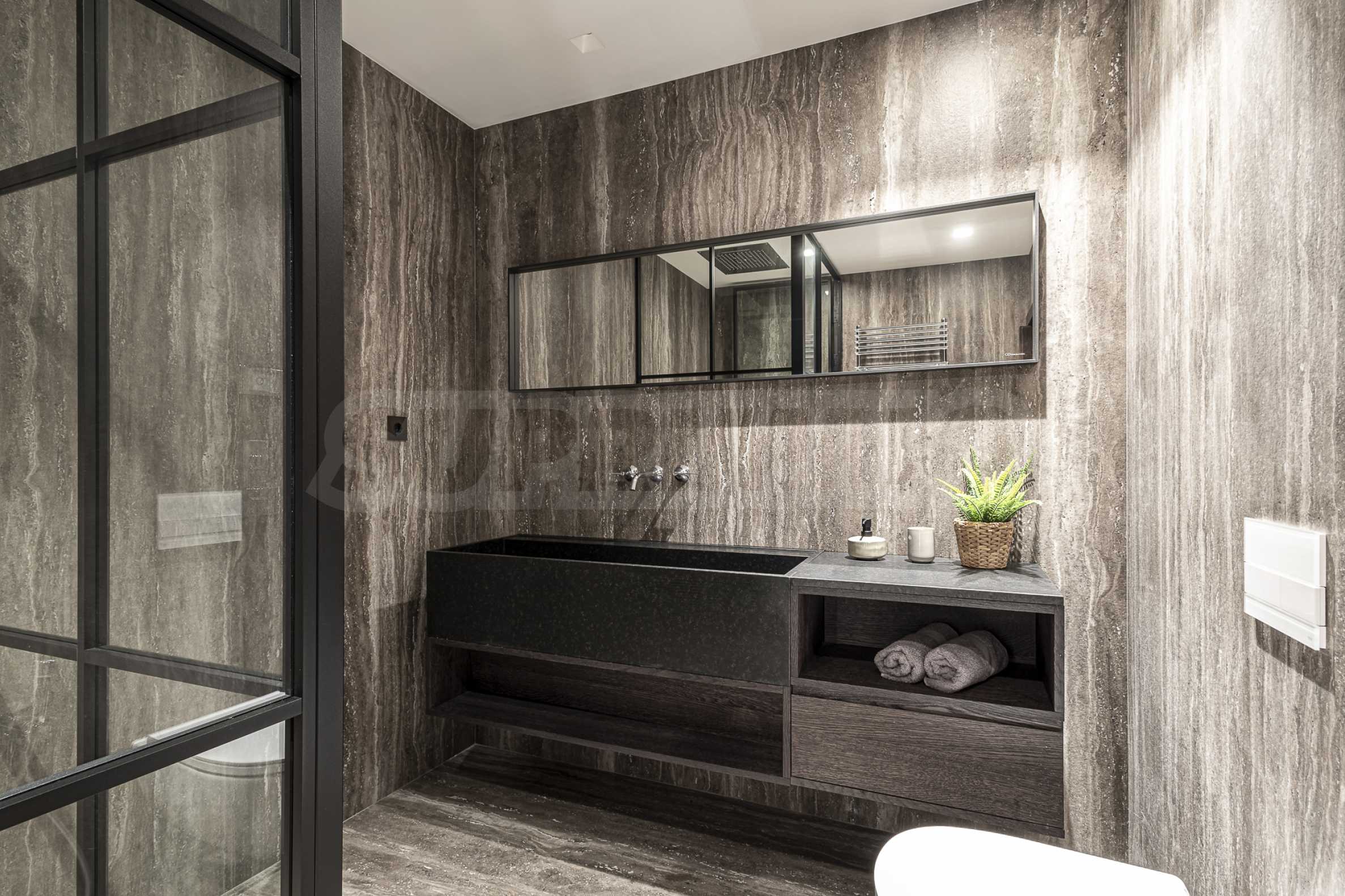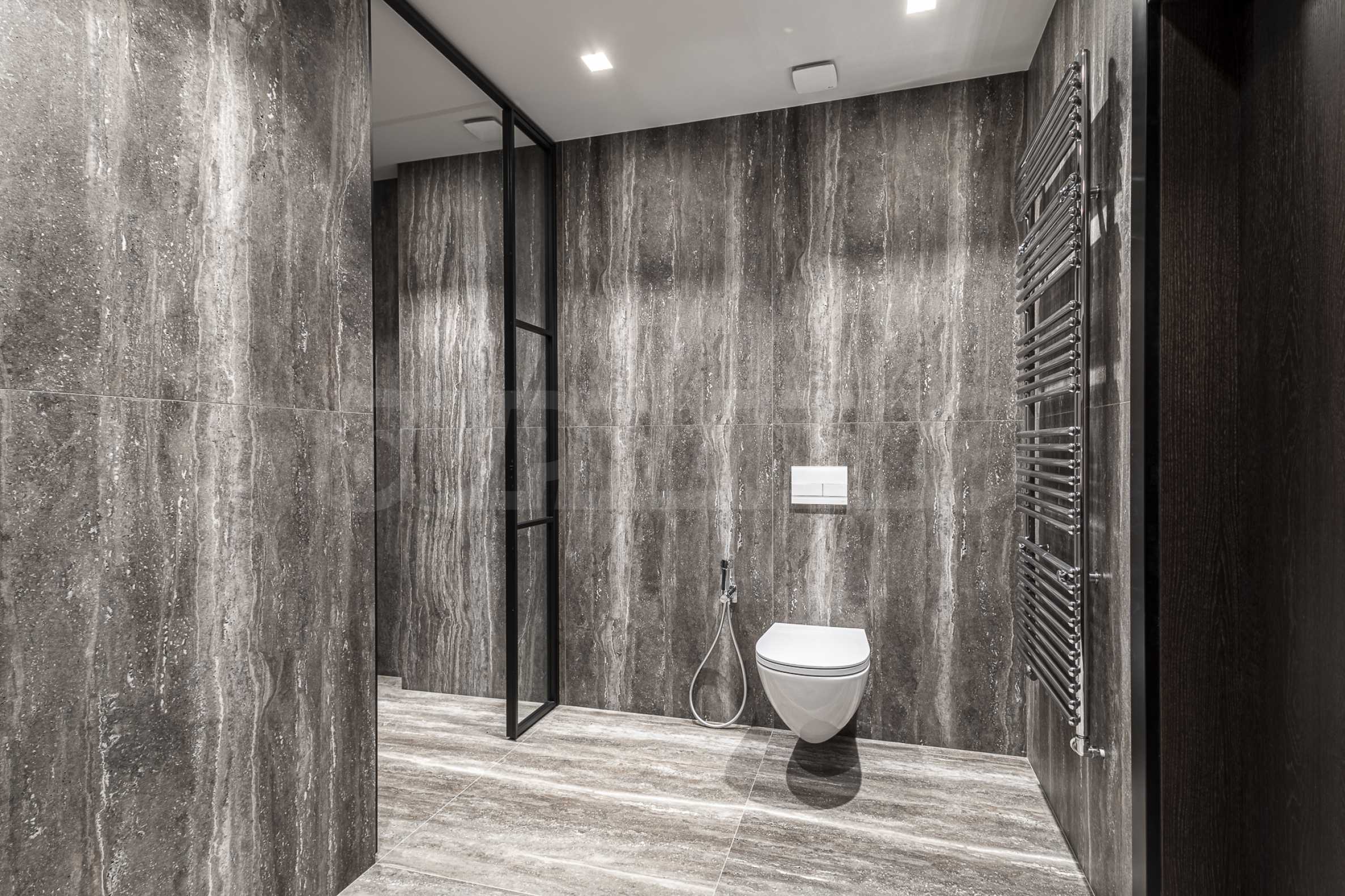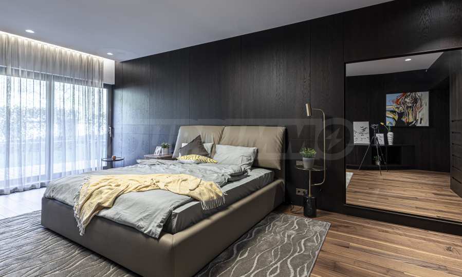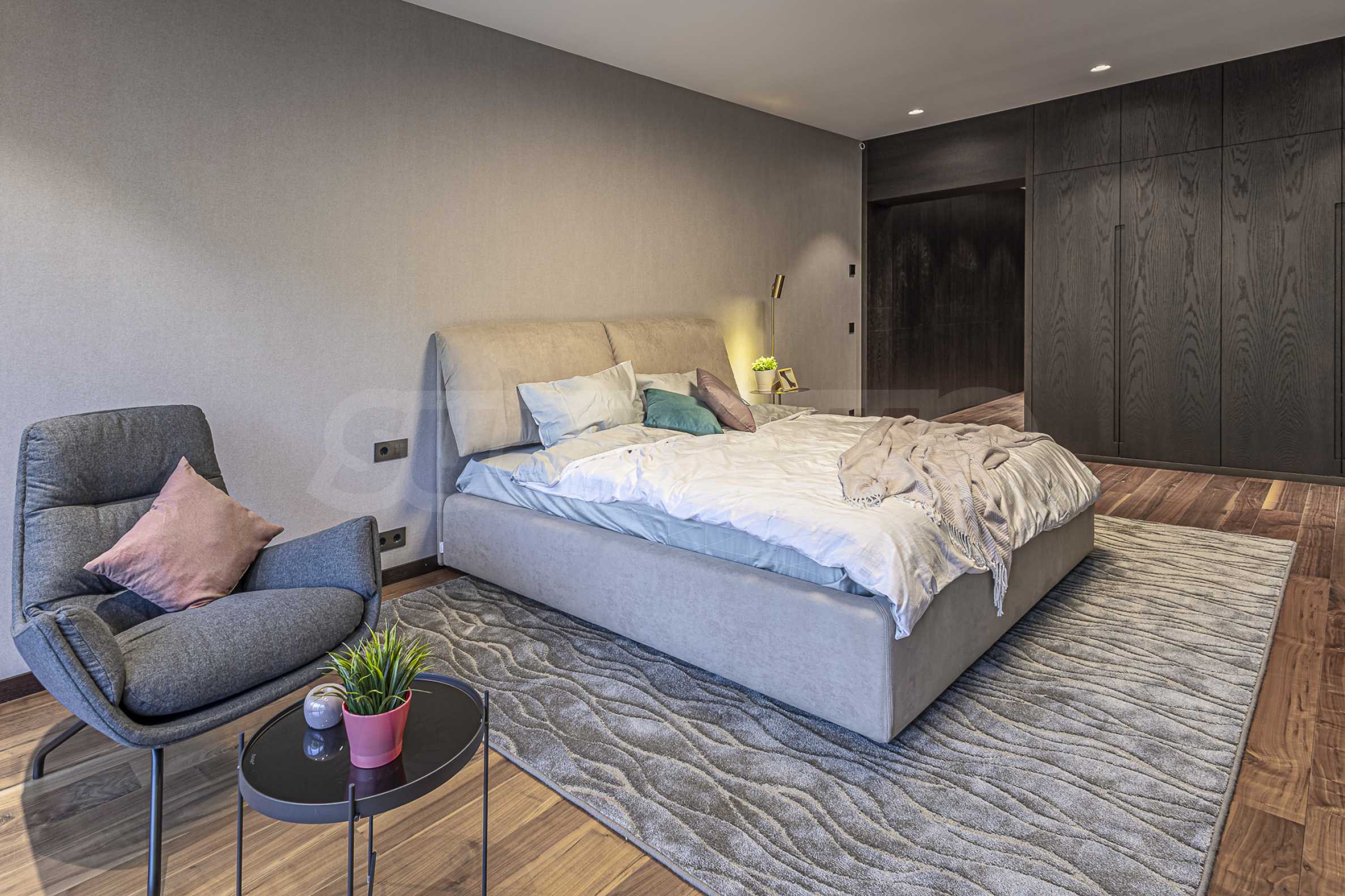 Апартаментът е завършен и обзаведен с най-висок клас материали, мебели и уреди. В дневната е монтирана модерна и функционална кухня с вградени уреди Mielе. Всички помещения освен баните са завършени с подова настилка от естествен паркет.