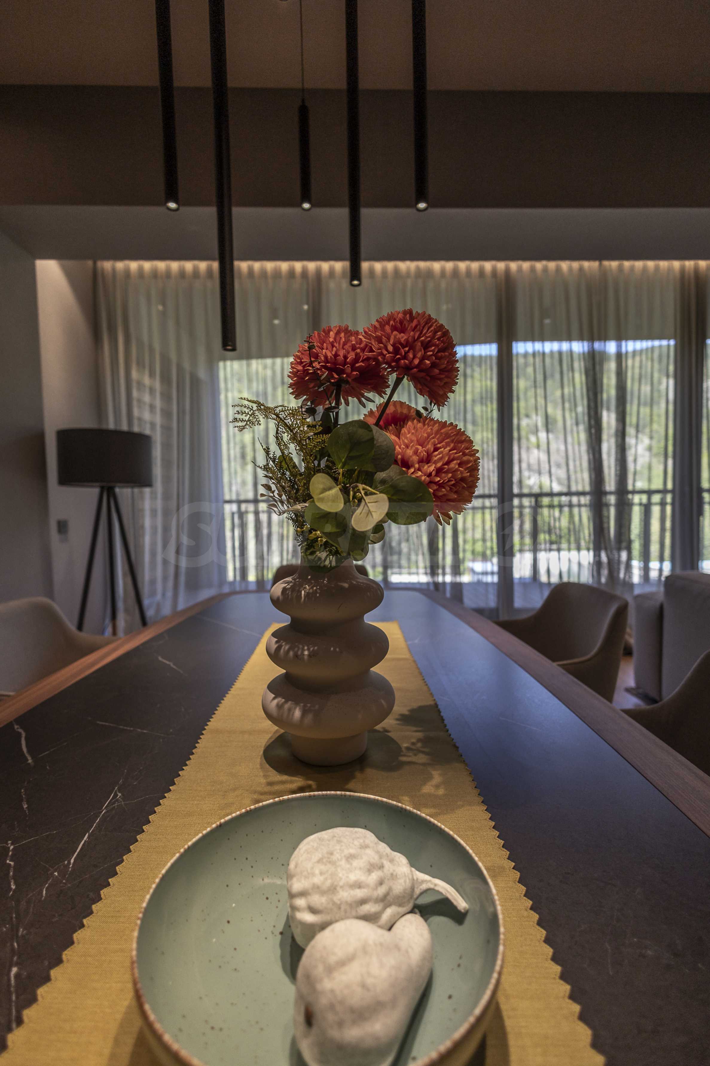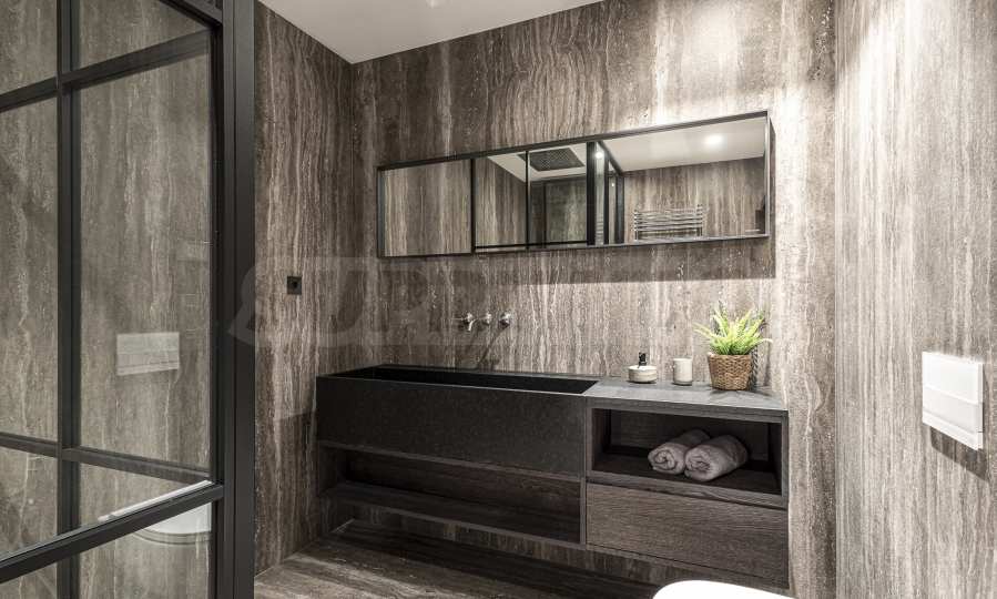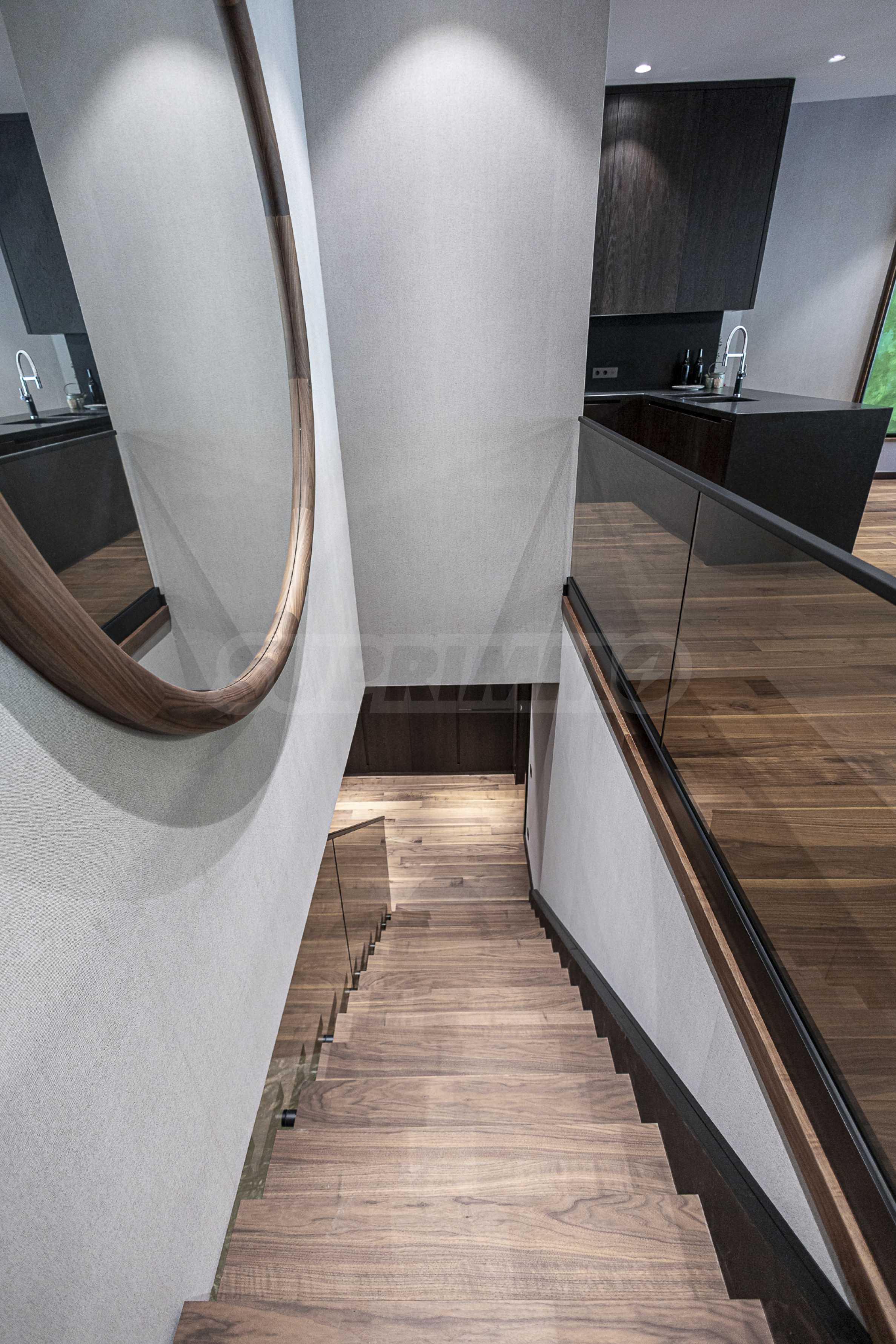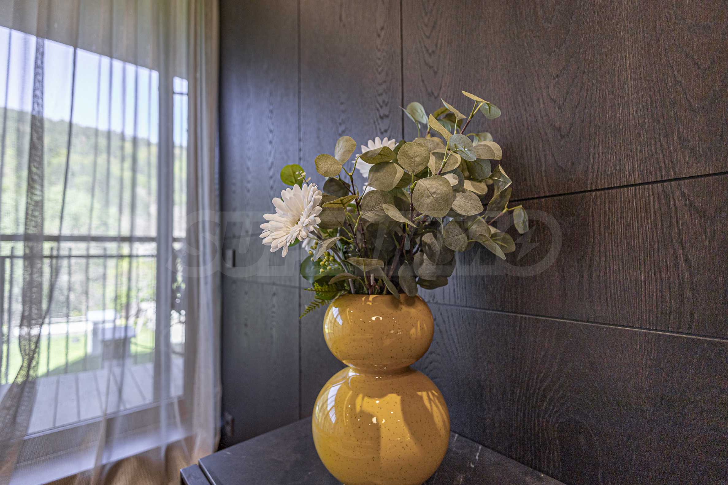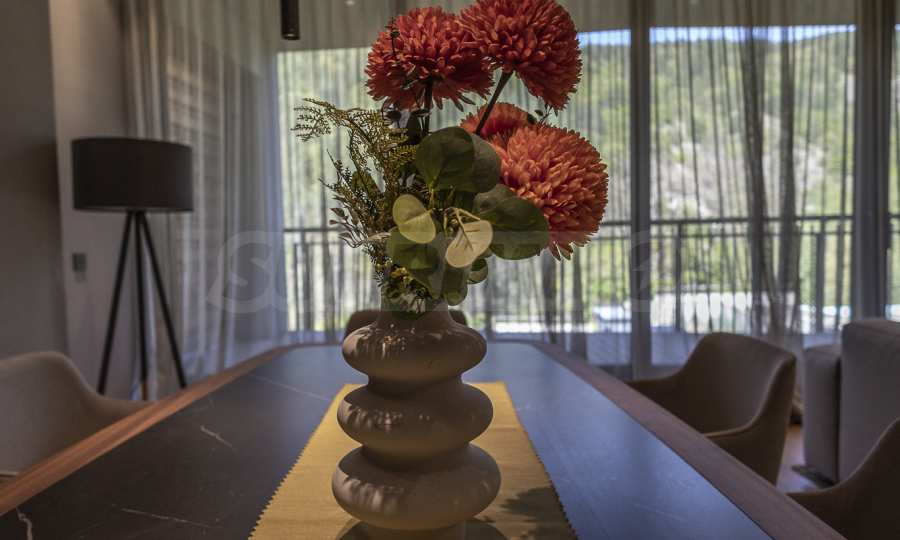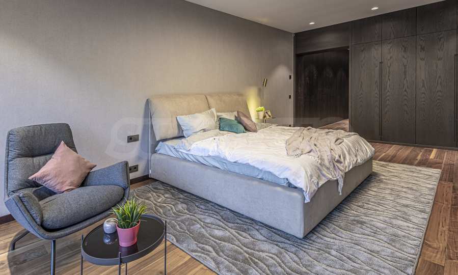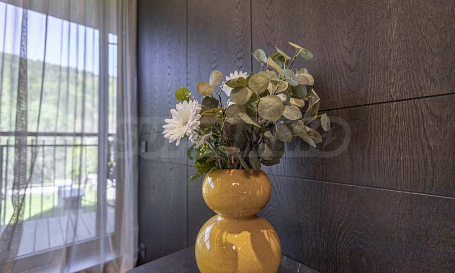 Апартаментът е завършен и обзаведен с най-висок клас материали, мебели и уреди. В дневната е монтирана модерна и функционална кухня с вградени уреди Mielе. Всички помещения освен баните са завършени с подова настилка от естествен паркет.