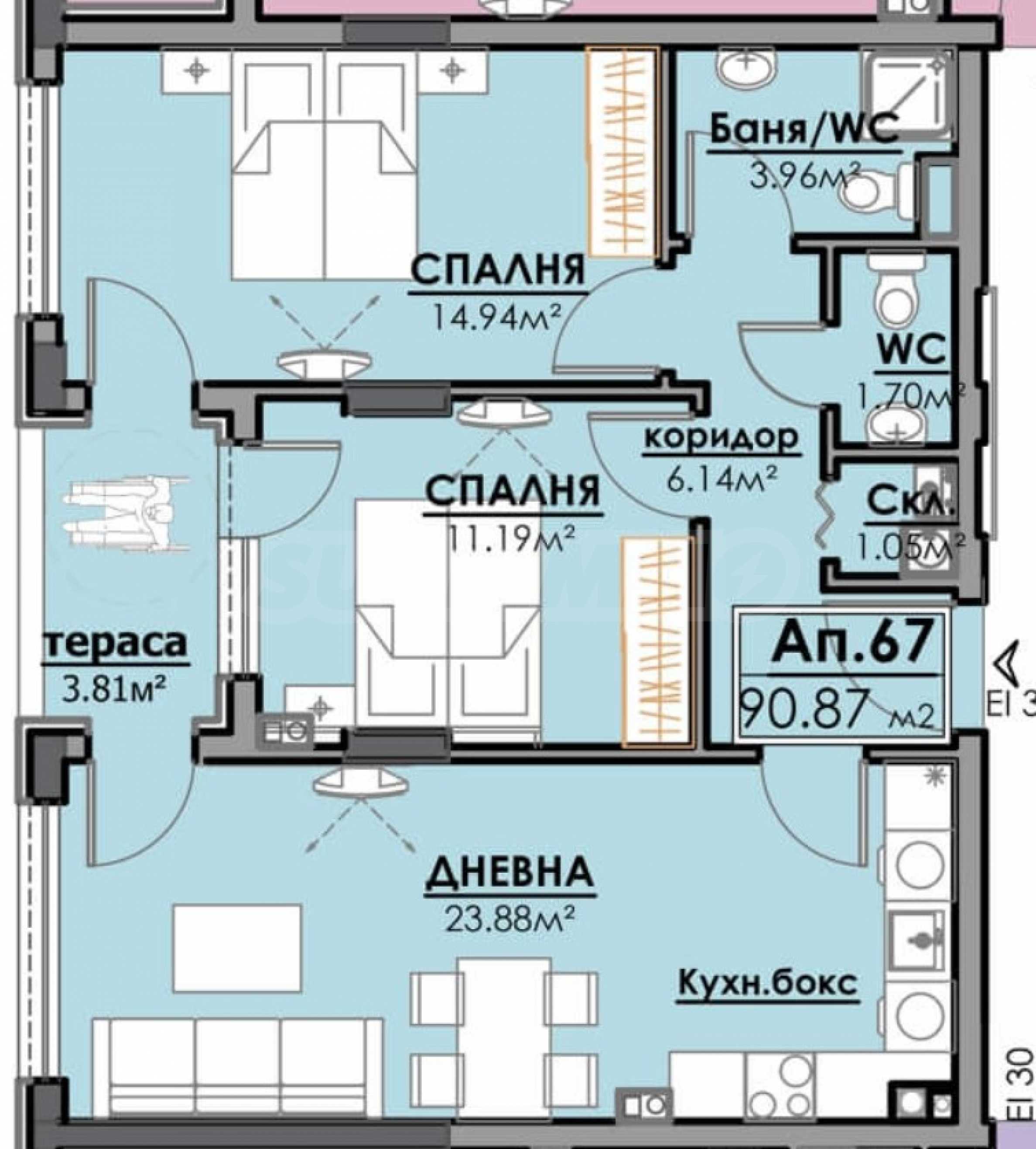 Имотът е с обща площ от 90,87 кв.м, разположен на 3-ти етаж във вход Б, със следното функционално разпределение: