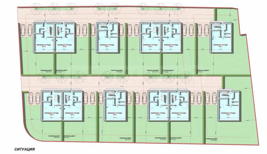 Всички къщи разполагат с 3 спални, собствен двор с площ от 267 кв.м до 493 кв.м, две паркоместа и удобен достъп с автомобил или пеша през вътрешна алея. Имотите са проектирани на две надземни нива и се издават в степен на завършеност на шпакловка и замазка.