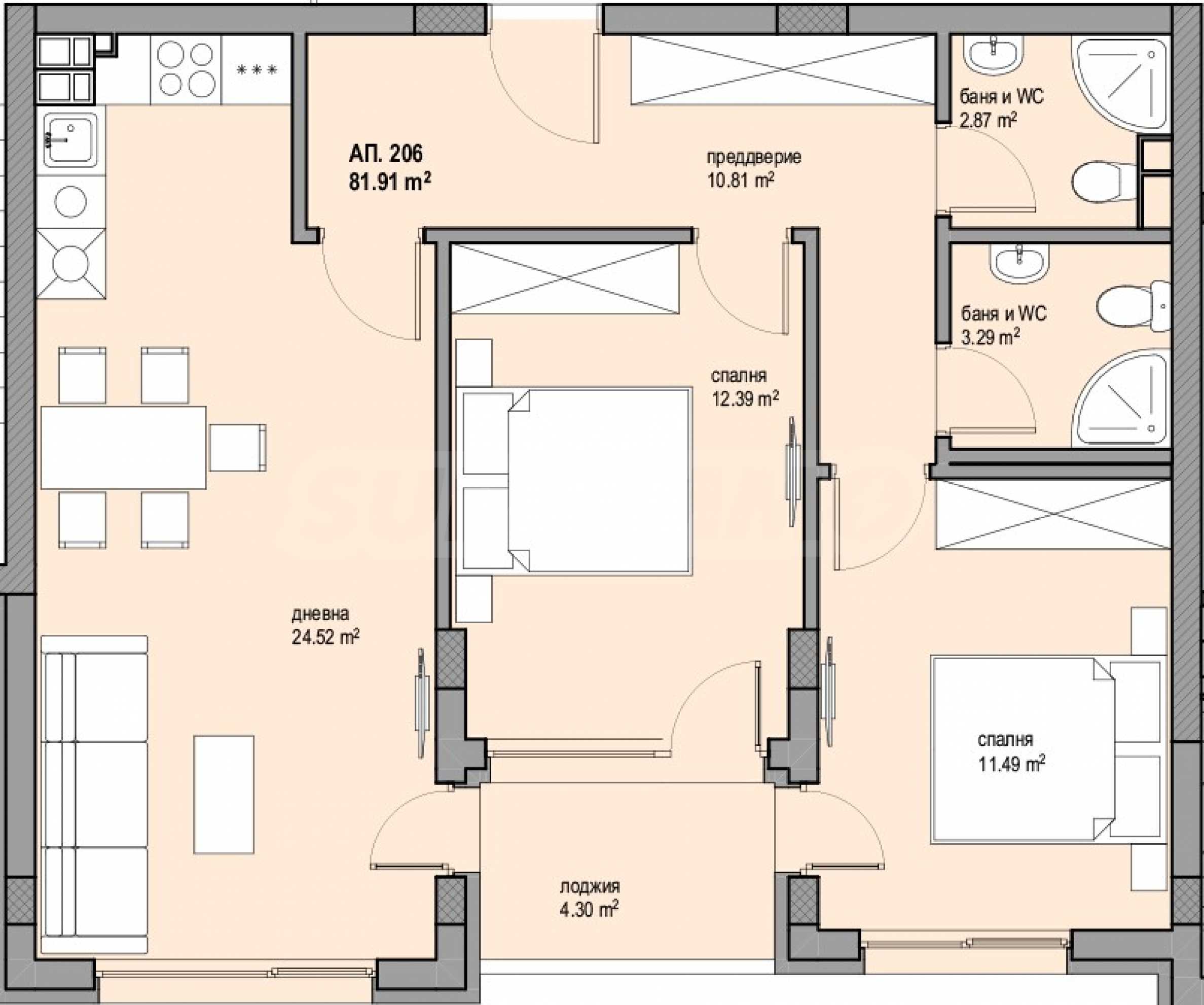 Имотът от 98.44 кв.м е разположен на 2-ри етаж във вход "Б" и има благоприятно изложение юг/запад. Състои се от антре, две бани с тоалетни, дневна с кухня, две спални, тераса с излаз от трите стаи.