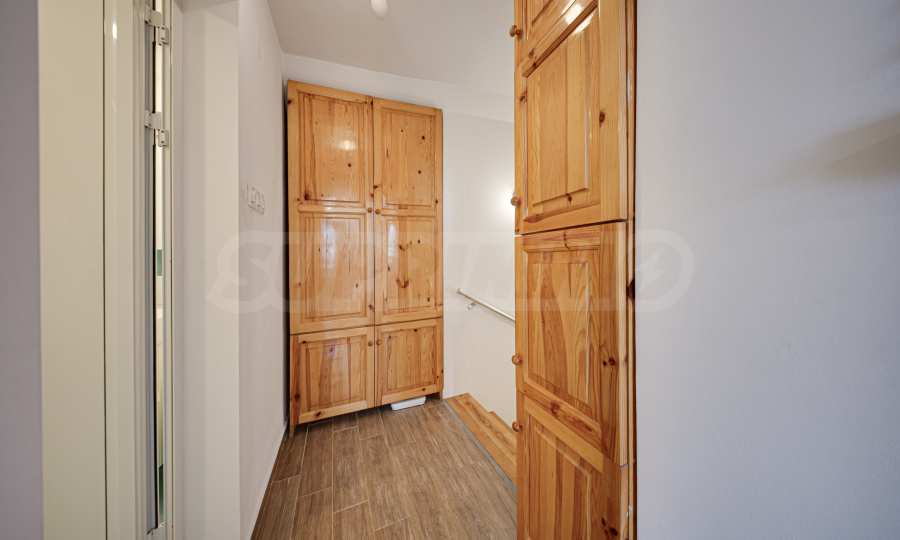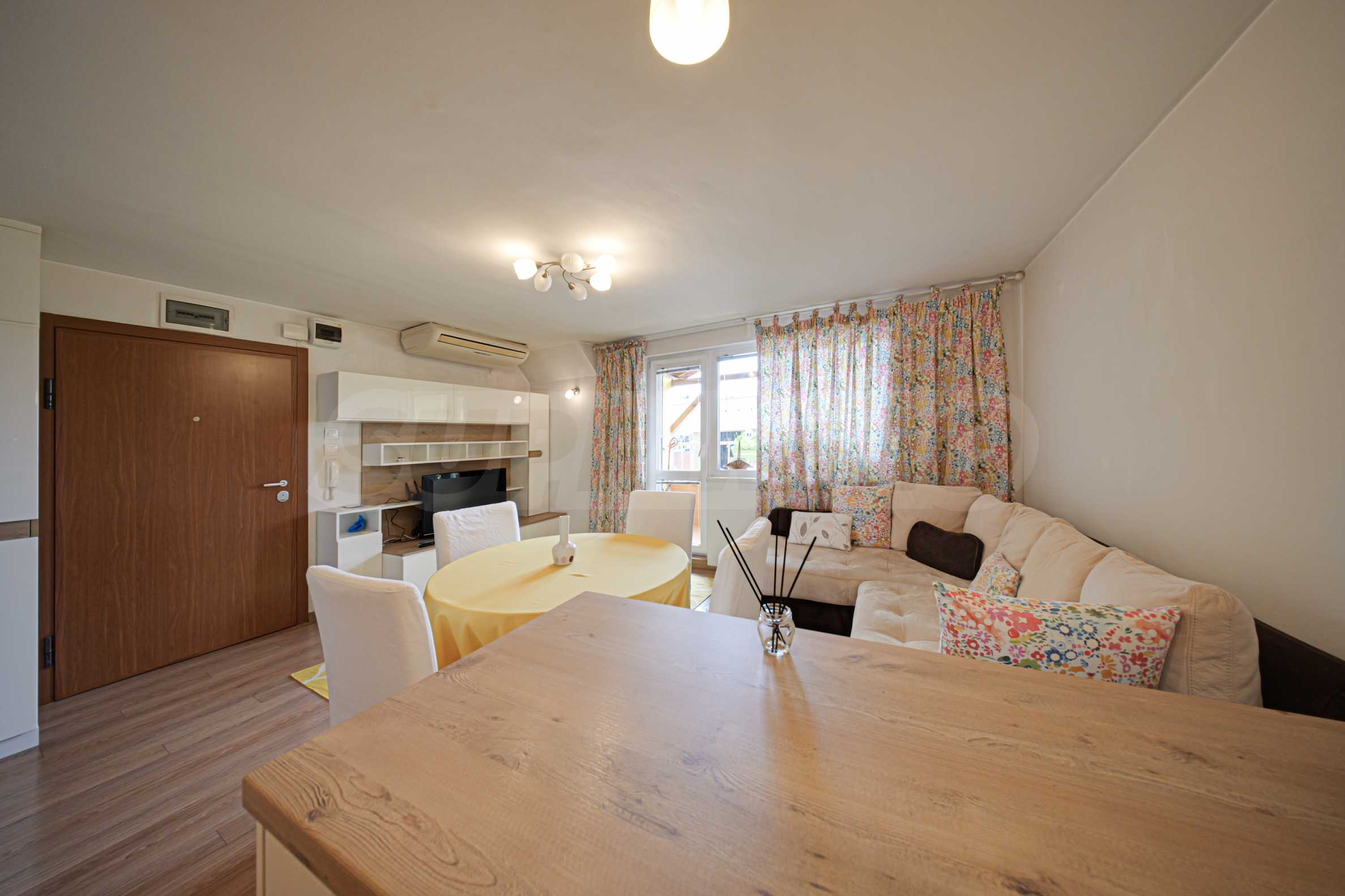 Жилището разполага с просторна дневна зона с кухненски бокс, две спални, две бани с тоалетна, складово помещение и тераса с панорамен изглед. Терасата е с изолиран покрив, навес, снегодържачи и буреустойчиви скоби, а подът е покрит с теракота с ефект на дърво в слънчев цвят – място, подходящо както за сутрешно кафе, така и за вечерен отдих.