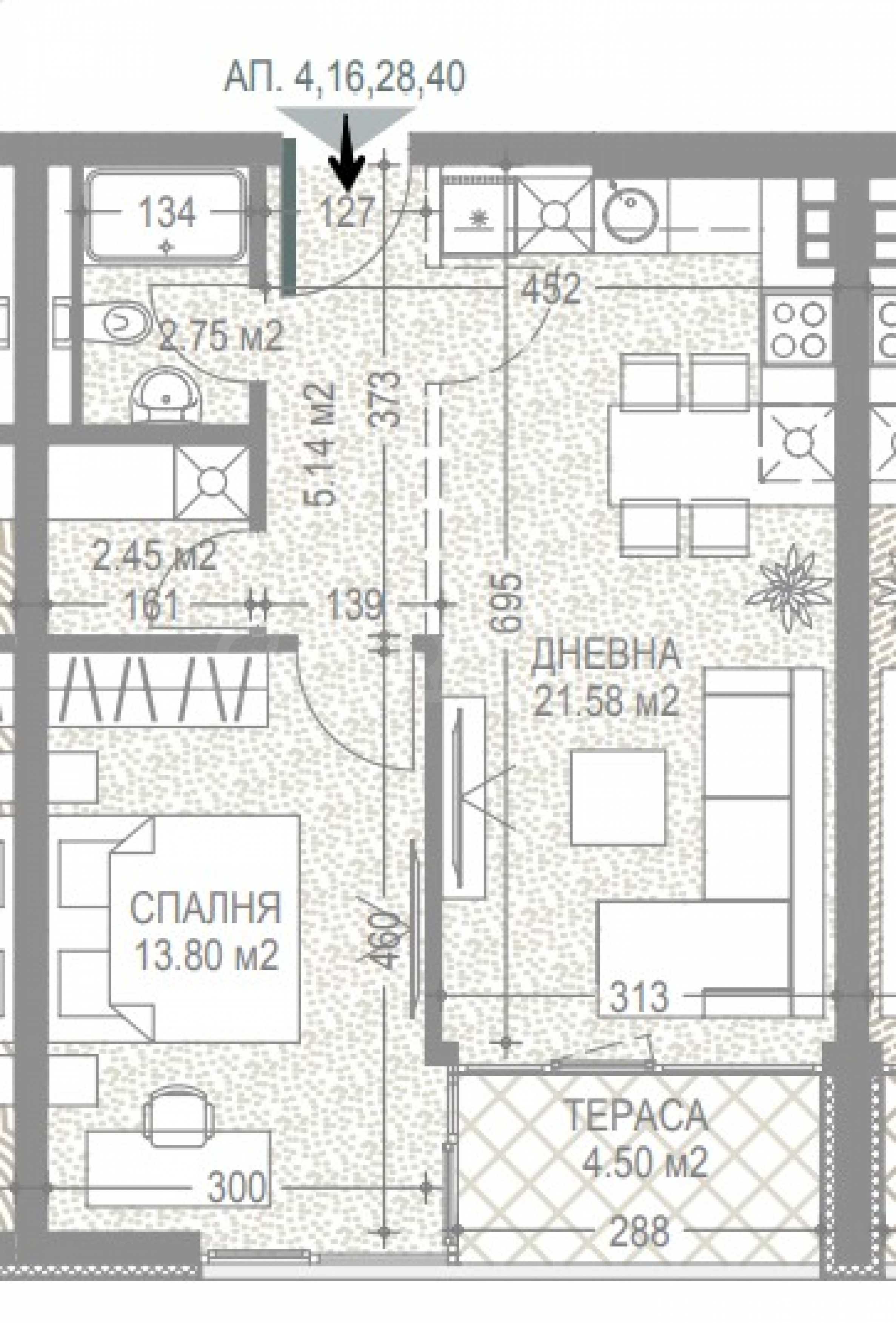 Апартаментът е разположен на 4-ти етаж и се състои от антре, баня с тоалетна, мокро помещение, дневна с кухня и тераса, една спалня. Имотът е с обща площ 77.19 кв.м, със склад с площ от 3.32 кв.м.