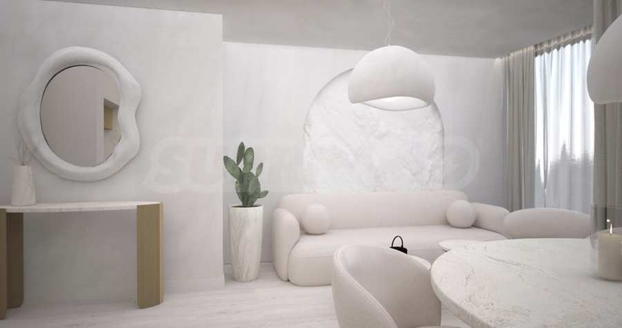 Фасадата, фоайето и имотите са подбрани в бяло, инвеститорът е заложил на светли цветове и ефирни материи - синергия от изчистени линии и естествени материали, съчетани с нотка лукс и комфорт. Бялото е цветът на искреността‚ идеала‚ въображението и мечтите‚ символ на истината. Възможност да бъдете част от един проект, който да разпали въображението и да сбъдне мечтите Ви, давайки чувство за спокойствие и уют!