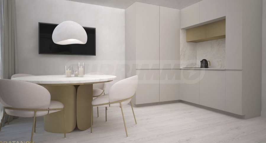 • Състояние за продажба: "до ключ", с готови подови настилки, боядисани стени и напълно оборудвана баня. Предвидена е възможност за цялостно обзавеждане по индивидуално разработен дизайнерски проект.