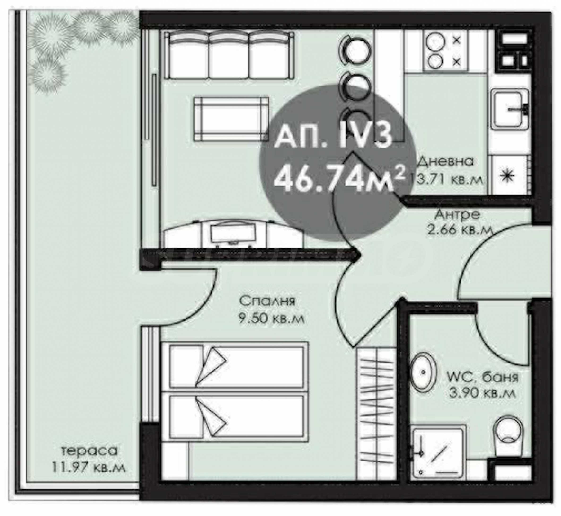 Жилището се намира на трети жилищен етаж в сградата и е с обща площ 46.74 кв.м. Проектирано с фокус към удобството на бъдещите му обитатели, разпределението включва всекидневна с кухненски кът, комфортна спалня, баня и слънчева тераса, до която имат достъп и двете помещения в апартамента.