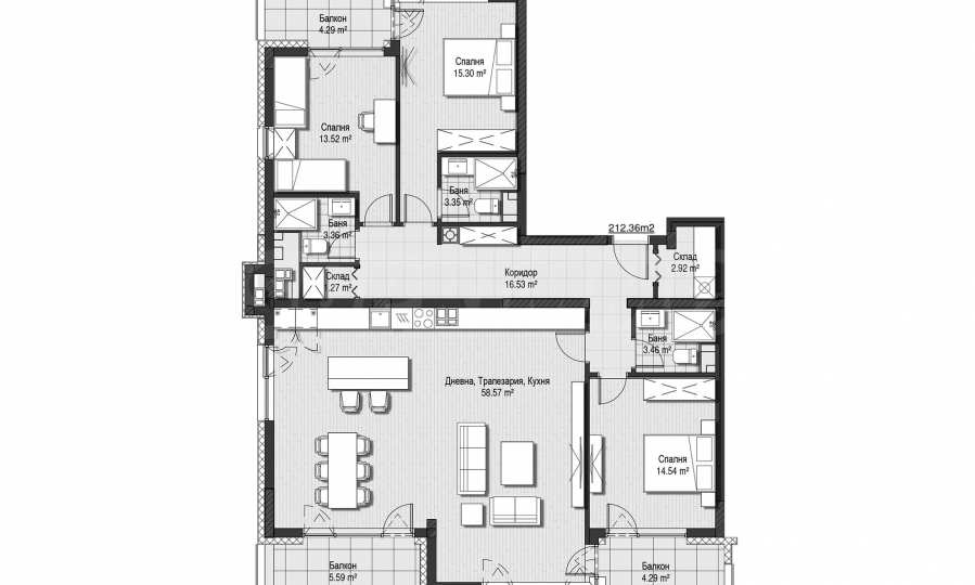 Апартаментът е с обща застроена площ от 212,36 кв.м., с южно изложение, което осигурява обилна естествена светлина през целия ден. Впечатляваща дневна с площ от 58,73 кв.м. създава усещане за простор и уют. Жилището включва три спални с площи съответно 14,54 кв.м., 13,52 кв.м. и 15,30 кв.м., като основната спалня е със собствен санитарен възел. Допълнително са обособени три бани с тоалетни, три балкона, мокро помещение, склад и коридор. Предвидено е газово отопление, гарантиращо комфорт и икономия на разходи. Има възможност за закупуване на подземен гараж на допълнителна цена, както и допълнително мазе към имота.