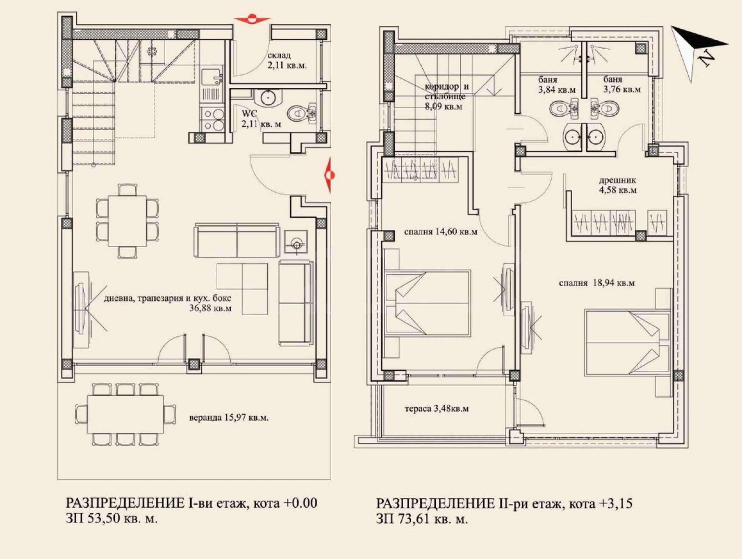 Къщи тип "А" представляват две къщи, разположени в едно УПИ, на сключено застрояване. В разгънатата застроена площ не се включва просторната веранда с изглед към морето.