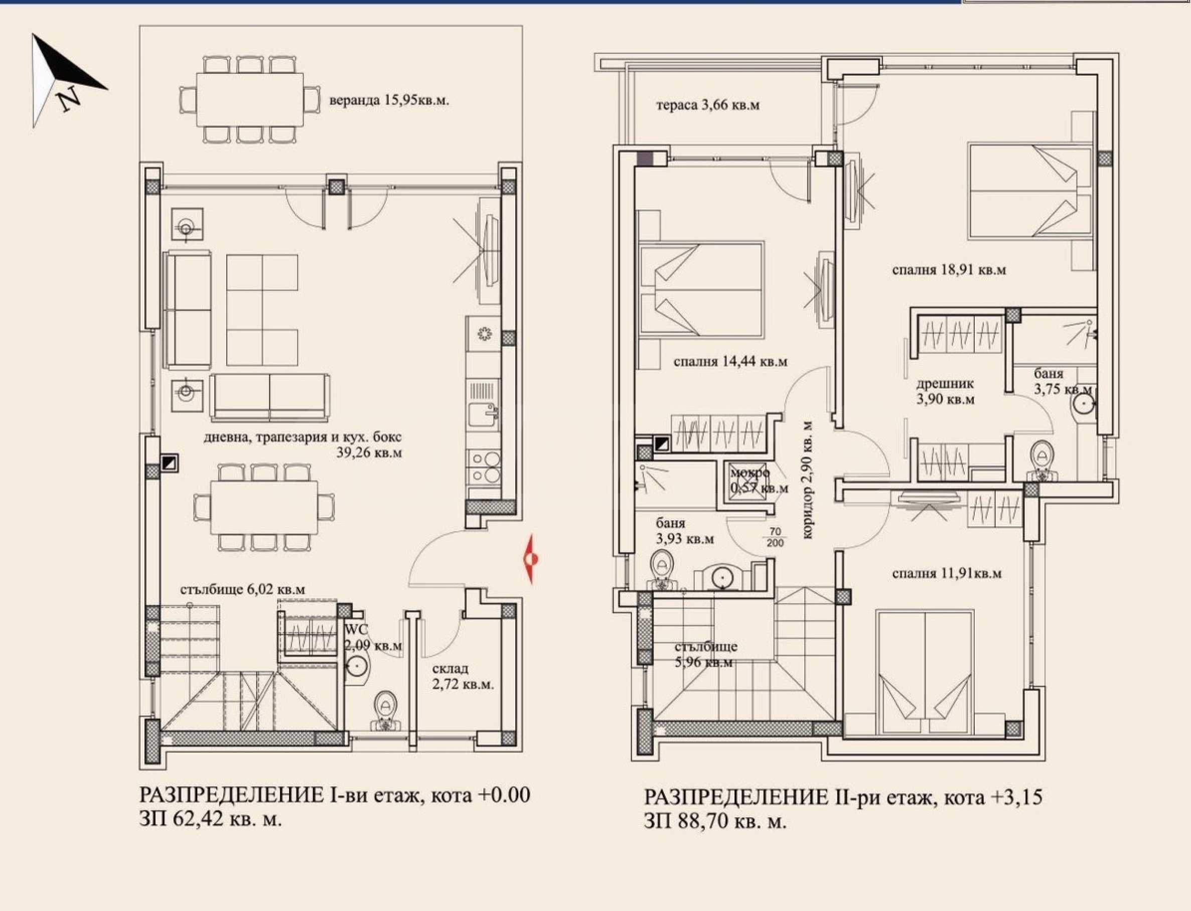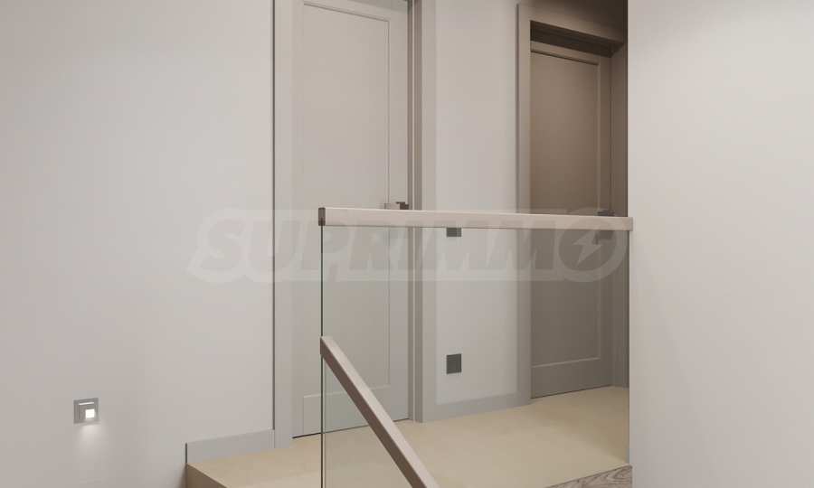 На втори етаж – три спални, две бани с тоалетни, дрешник, мокро помещение и тераса с настилка от гранитогресни плочи.