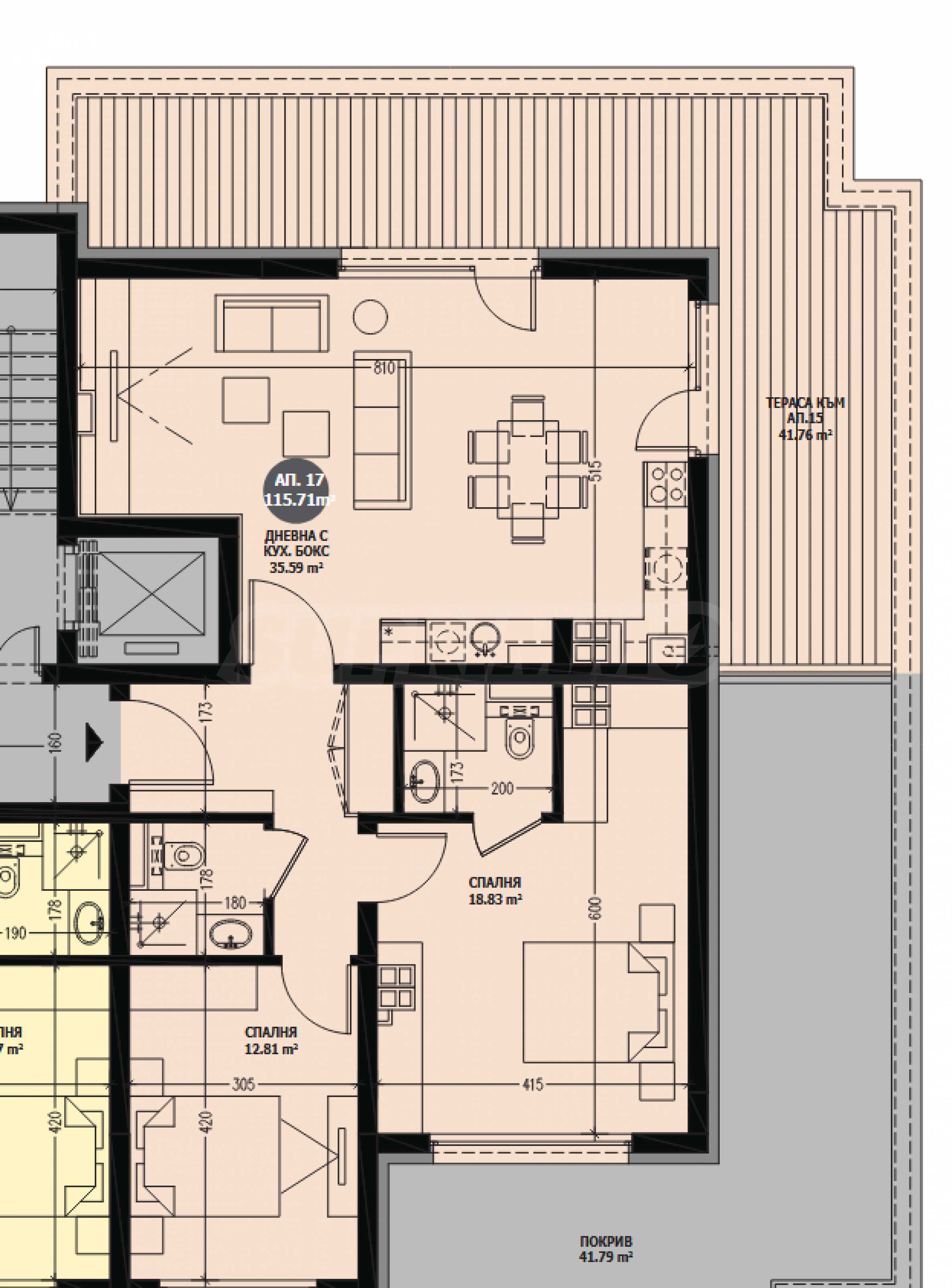 Жилището се намира на последния етаж в четириетажна сграда и предлага обща площ от 115.71 кв.м, като чистата застроена площ възлиза на 97.08 кв.м. Просторното и функционално разпределение включва входно антре, светла дневна с кухненски бокс, две самостоятелни спални – всяка със собствена баня, както и голяма и слънчева покривна тераса с площ 85.83 кв.м. С височина на таваните от 3 метра, помещенията изобилстват от дневна светлина, а усещането за простор е осезаемо.
