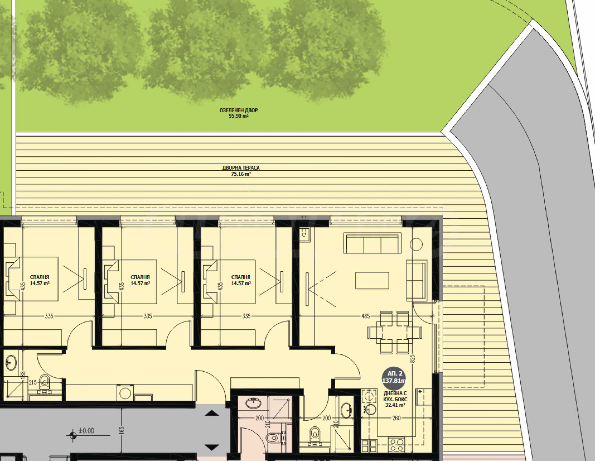 Жилището се намира на партерен етаж в четириетажна сграда и предлага обща площ от 137.81 кв.м, като чистата застроена площ възлиза на 116.93 кв.м. С височина на таваните от 3 метра, помещенията изобилстват от дневна светлина, а усещането за простор е осезаемо. Просторното и функционално разпределение включва входно антре, светла дневна с кухненски бокс, три самостоятелни спални – две бани, дворна тераса с площ 75.16 кв.м и озеленено дворно пространство с площ 95.90 кв.м