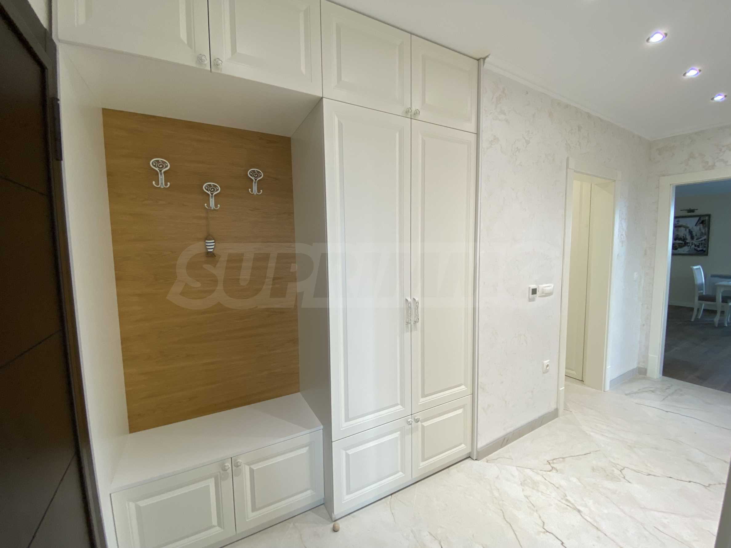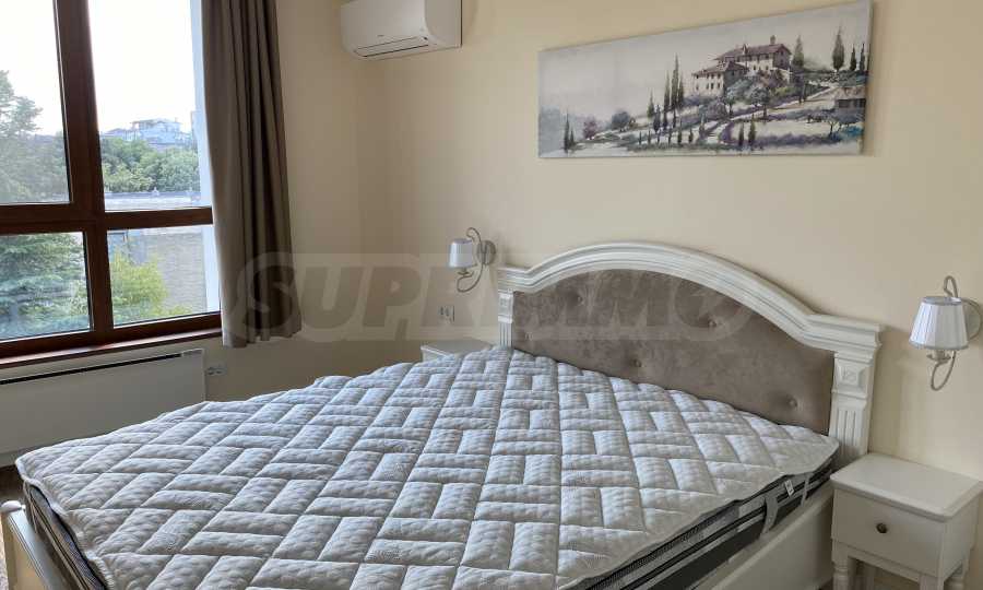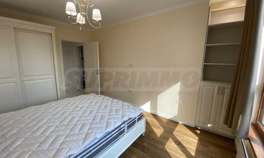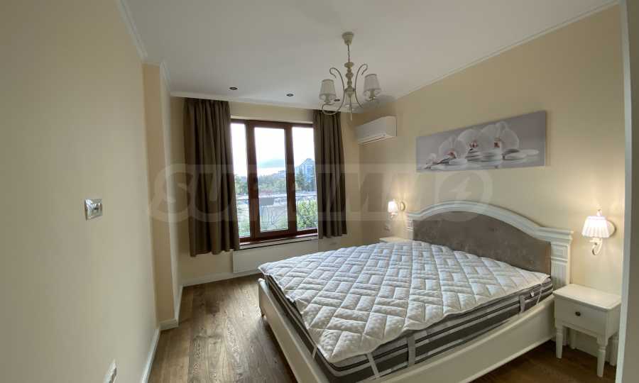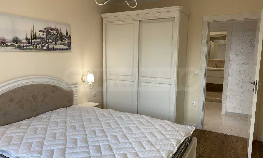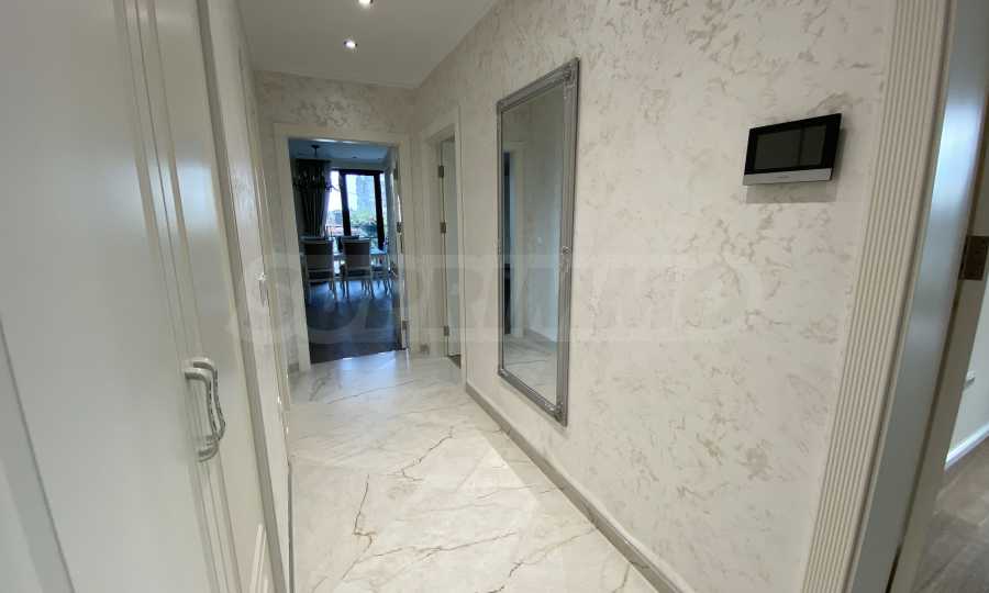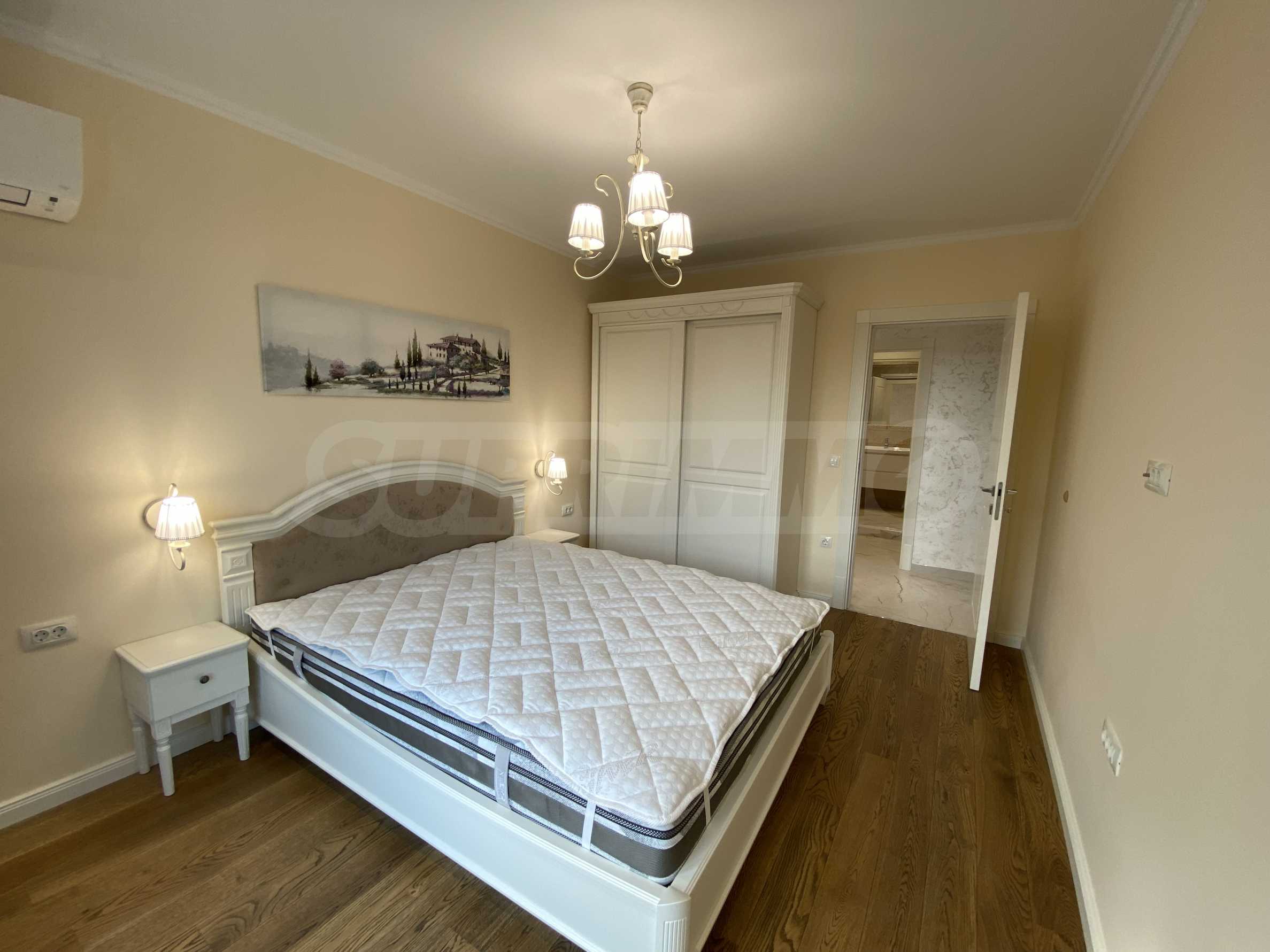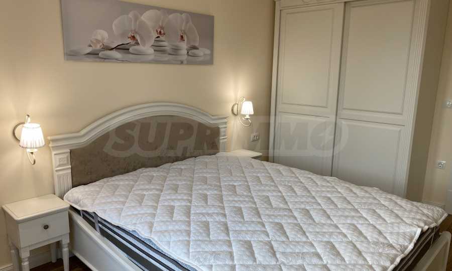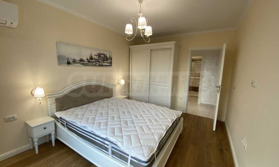 Апартаментът е луксозно обзаведен по дизайнерски проект с поръчкови мебели от масивно дърво. Всеки детайл е внимателно подбран, за да осигури максимално удобство и комфорт.