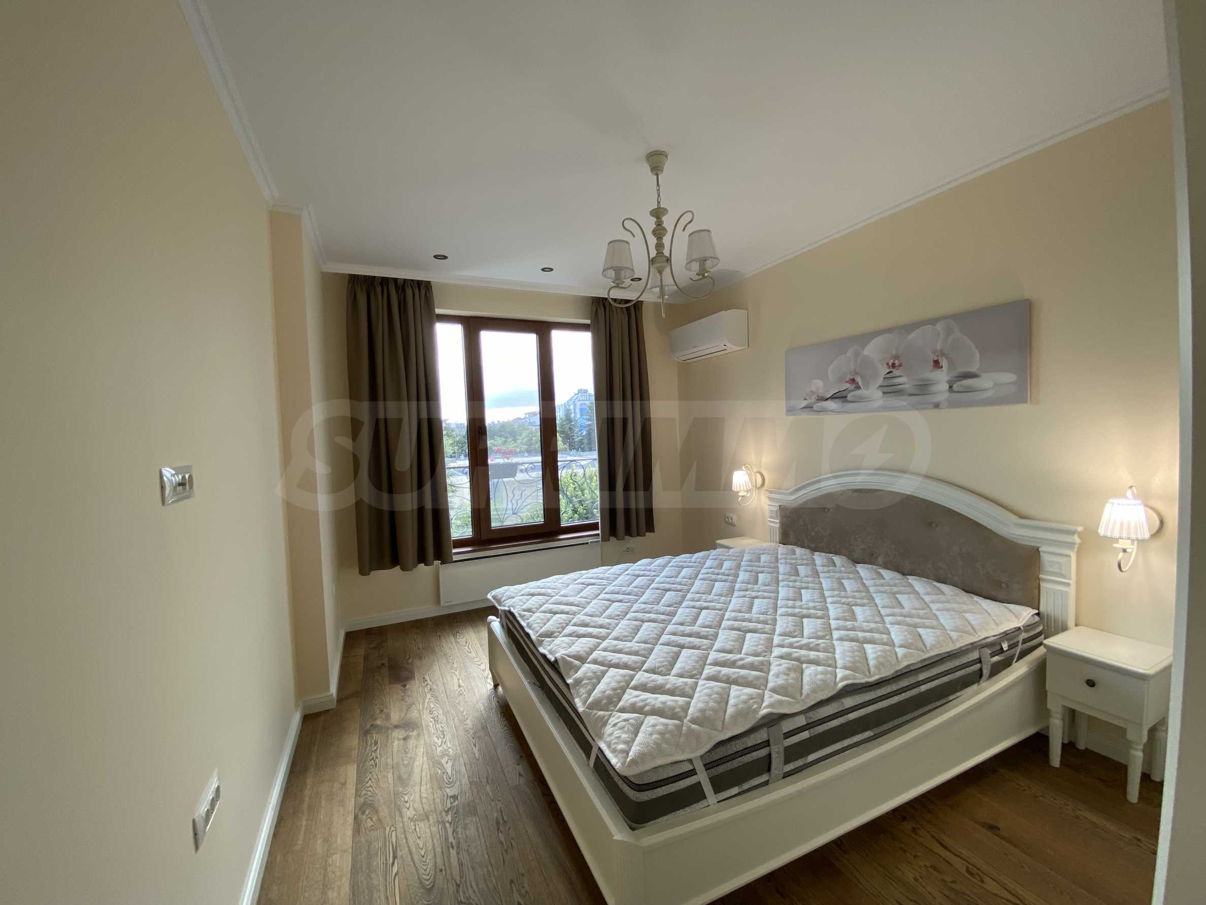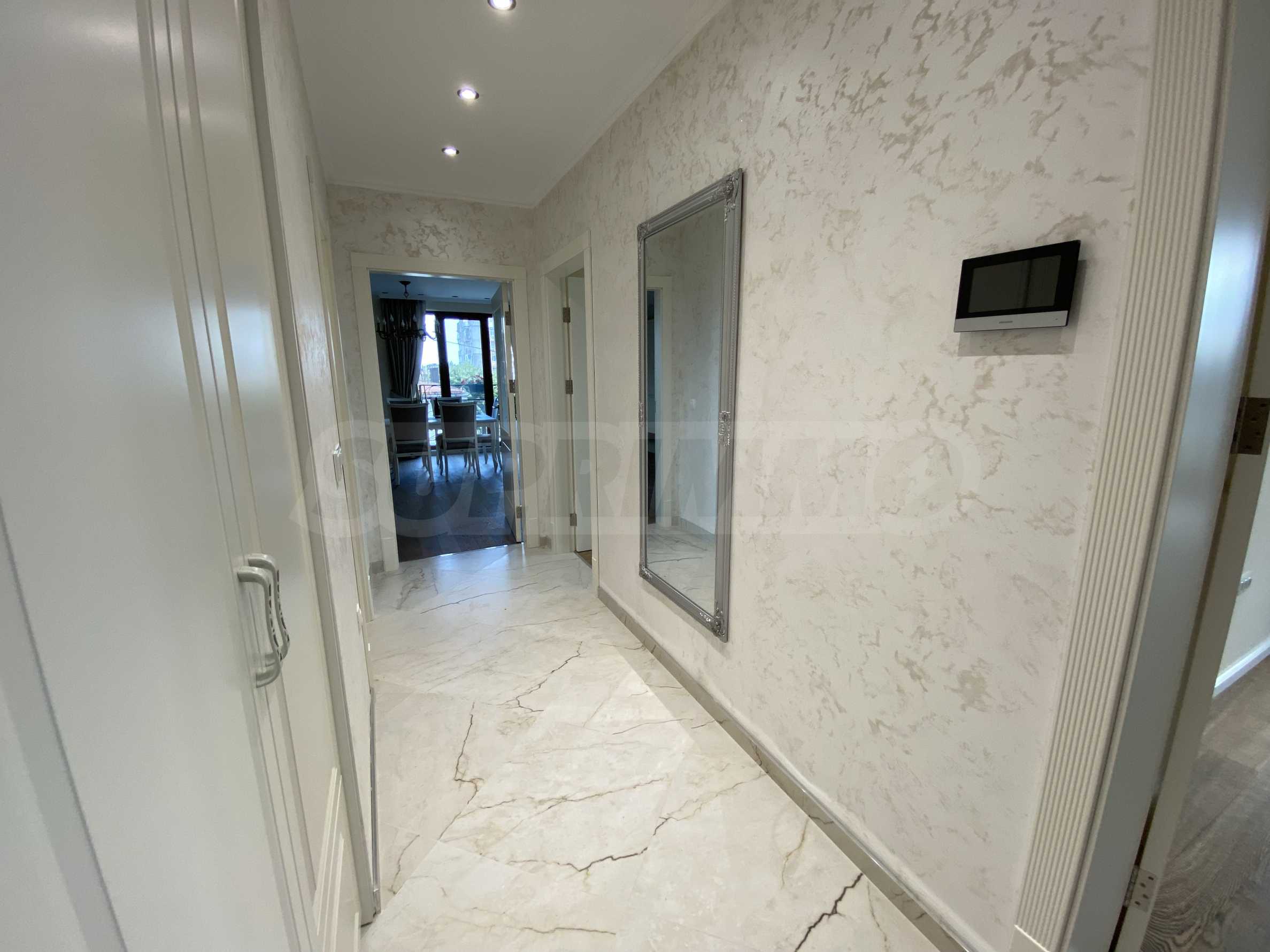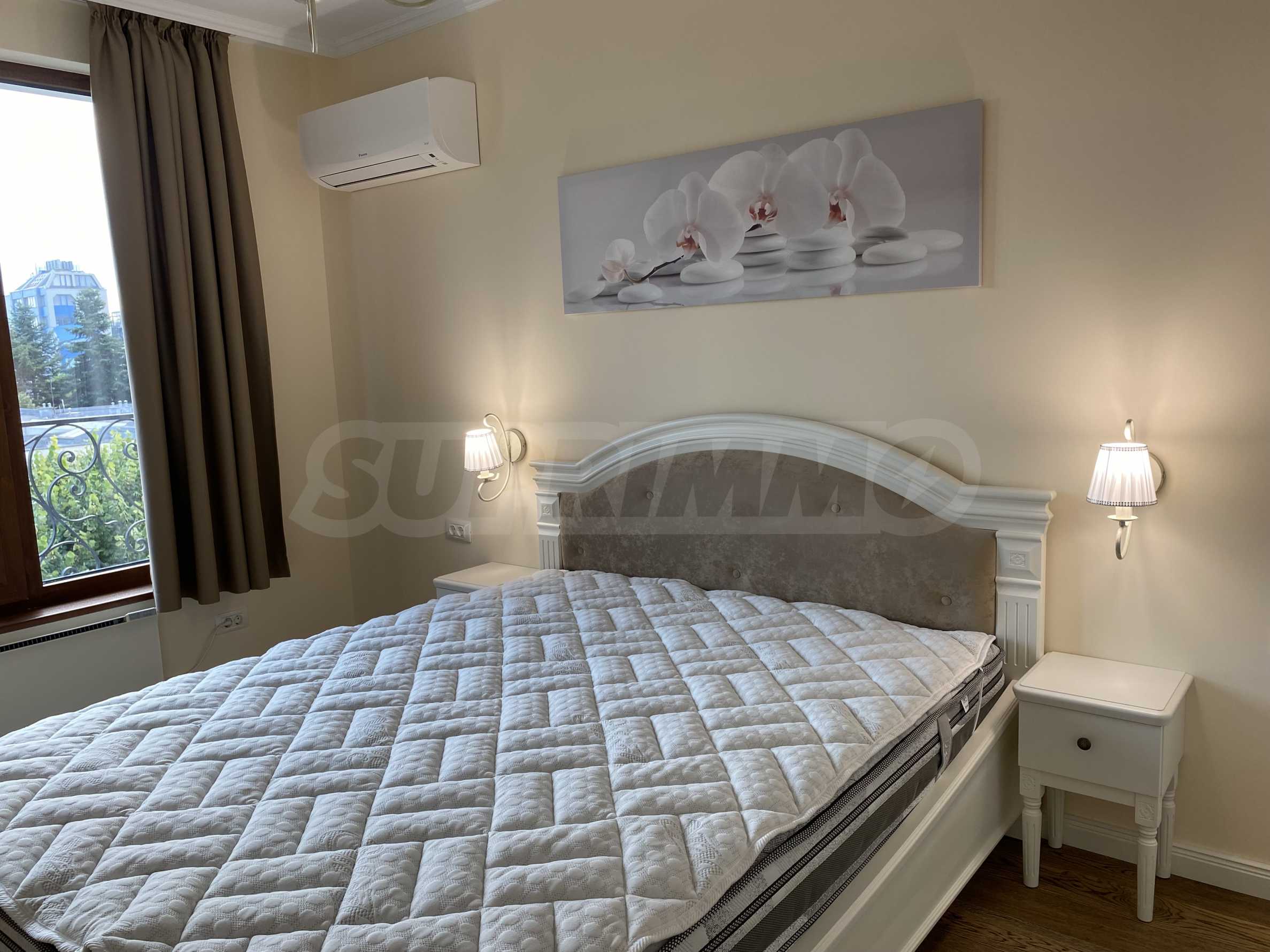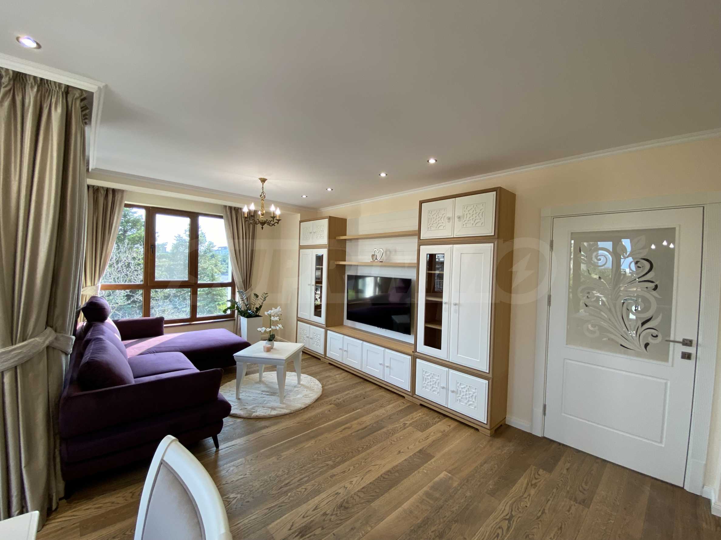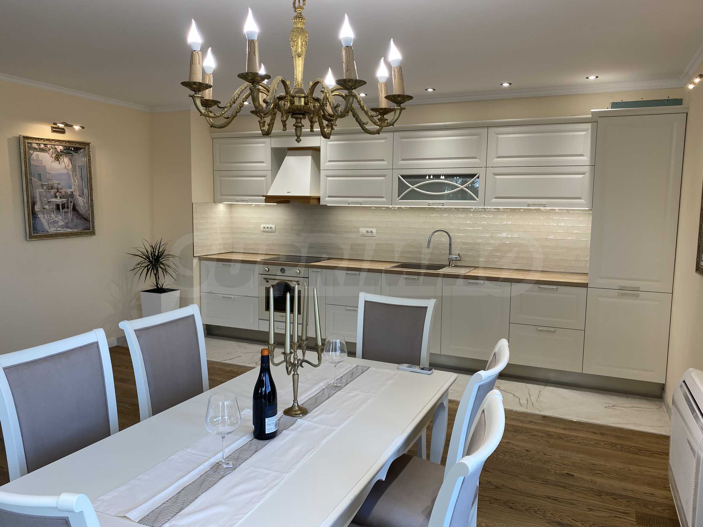 Апартаментът е луксозно обзаведен по дизайнерски проект с поръчкови мебели от масивно дърво. Всеки детайл е внимателно подбран, за да осигури максимално удобство и комфорт.