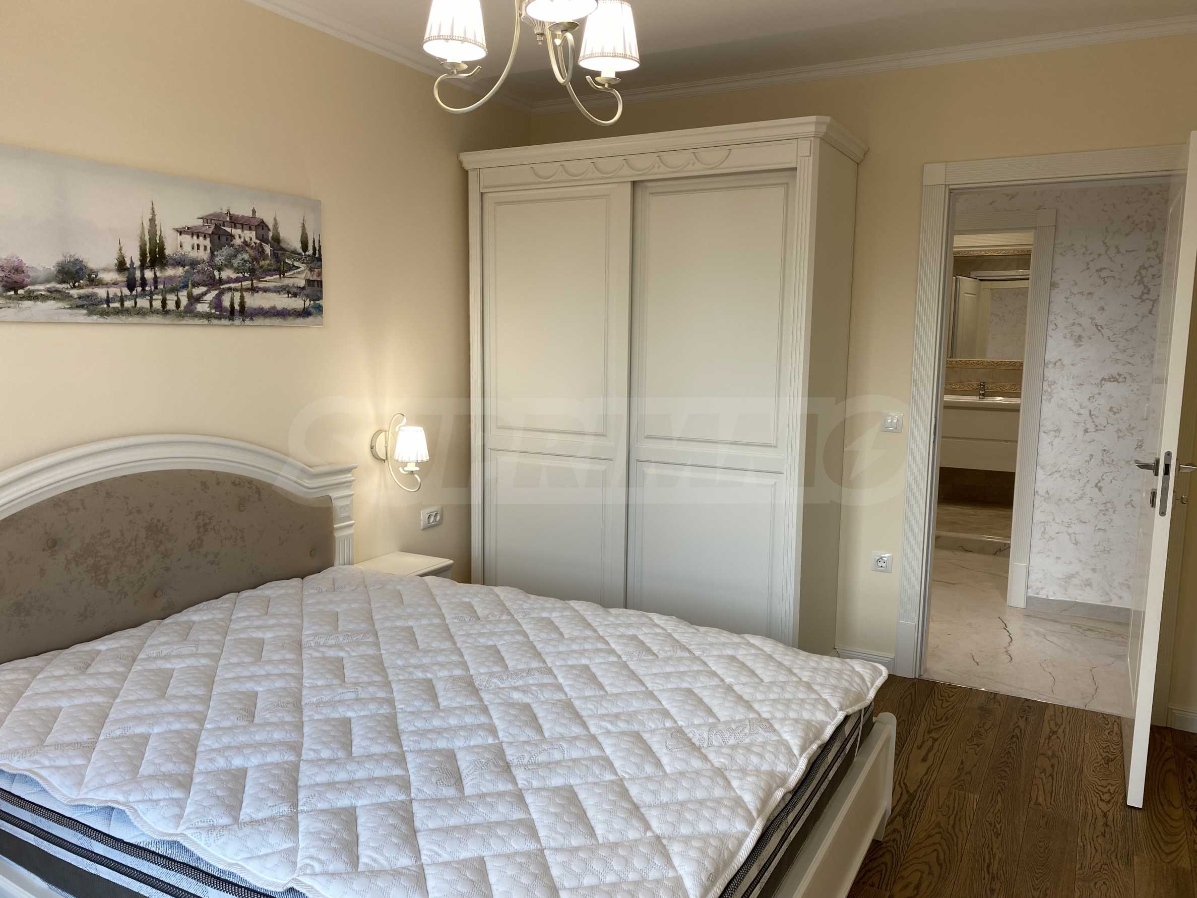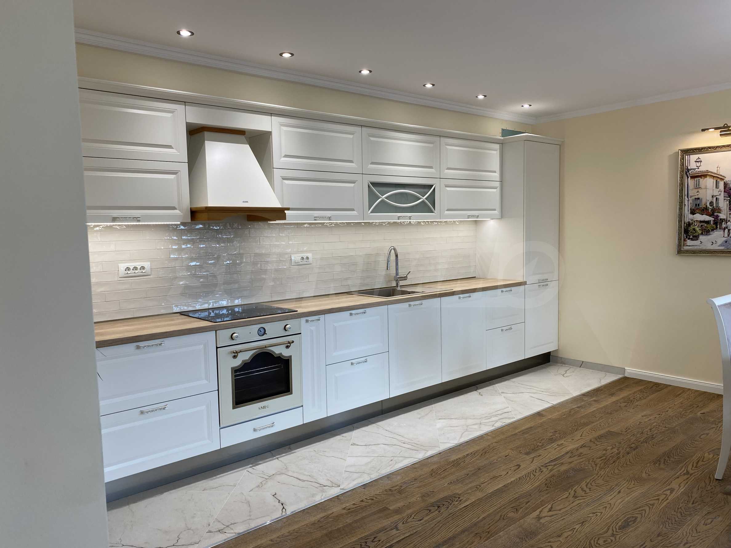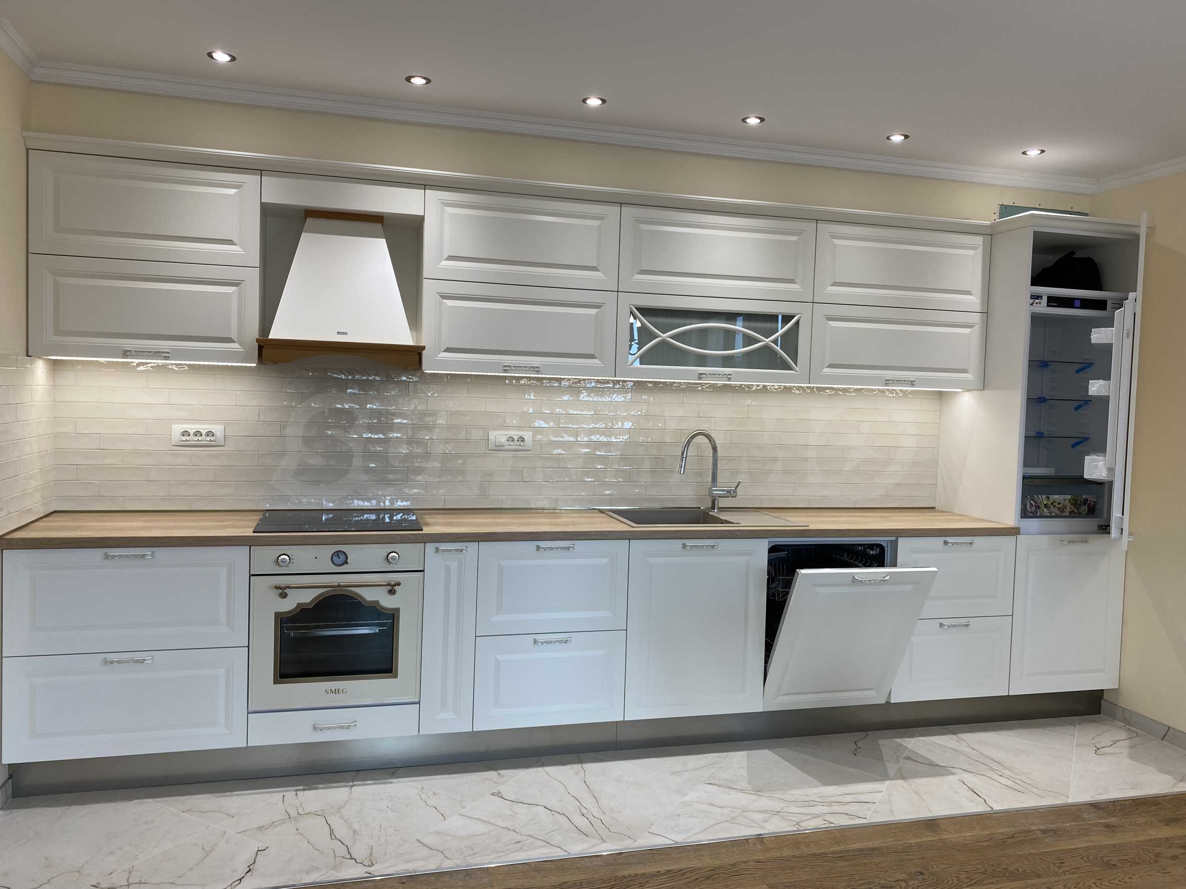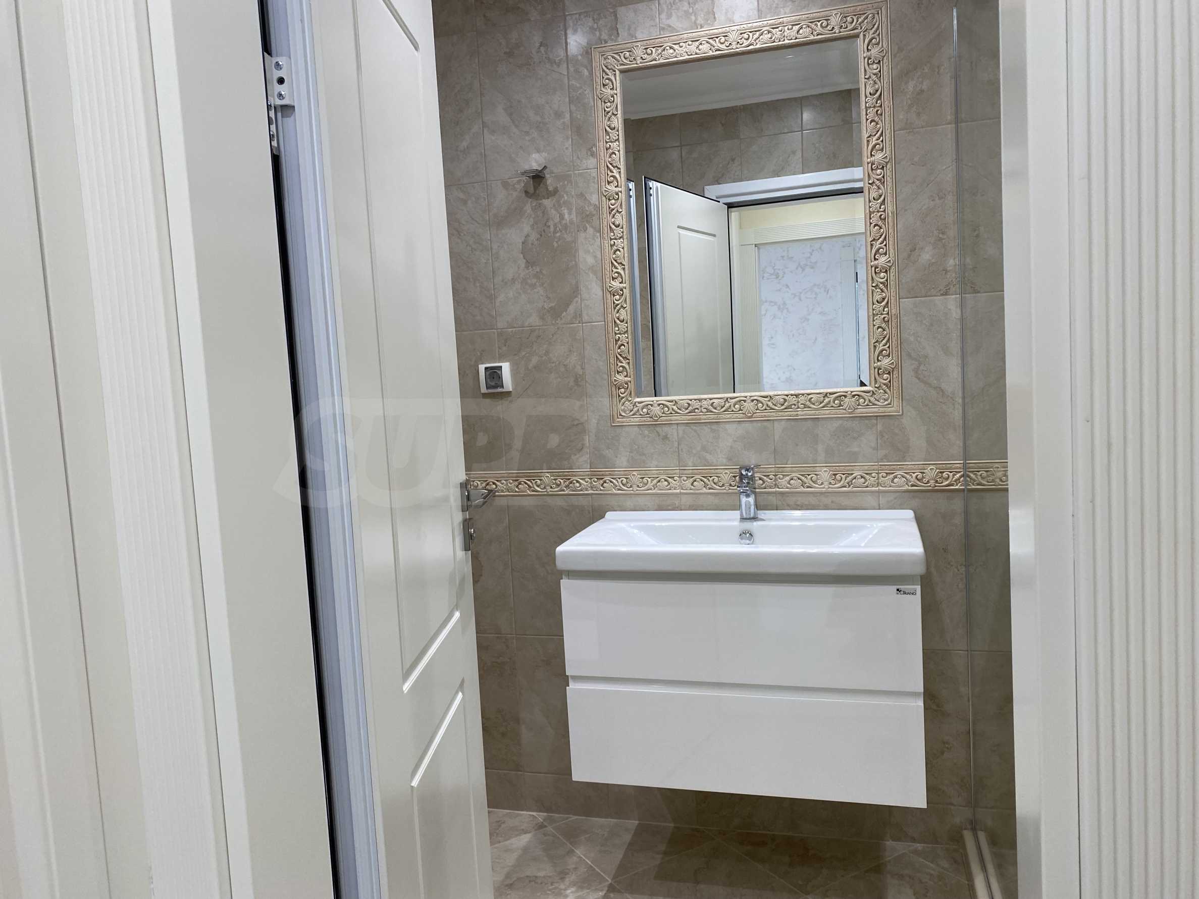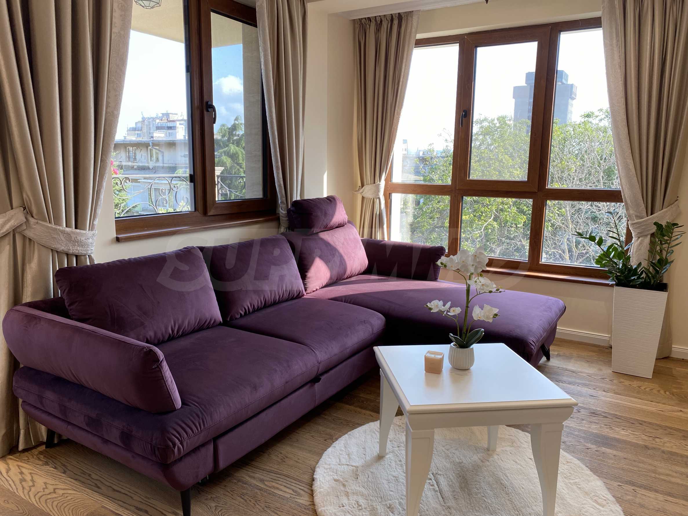 Апартаментът е луксозно обзаведен по дизайнерски проект с поръчкови мебели от масивно дърво. Всеки детайл е внимателно подбран, за да осигури максимално удобство и комфорт.
