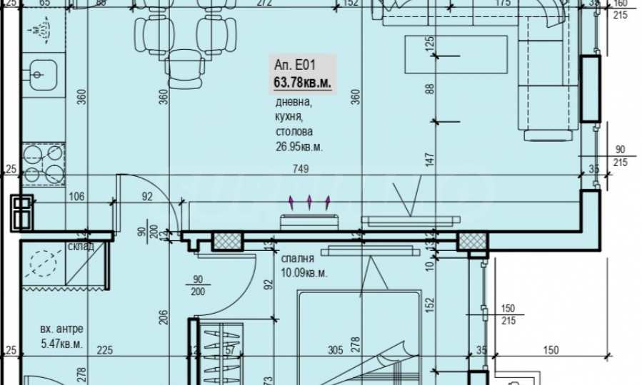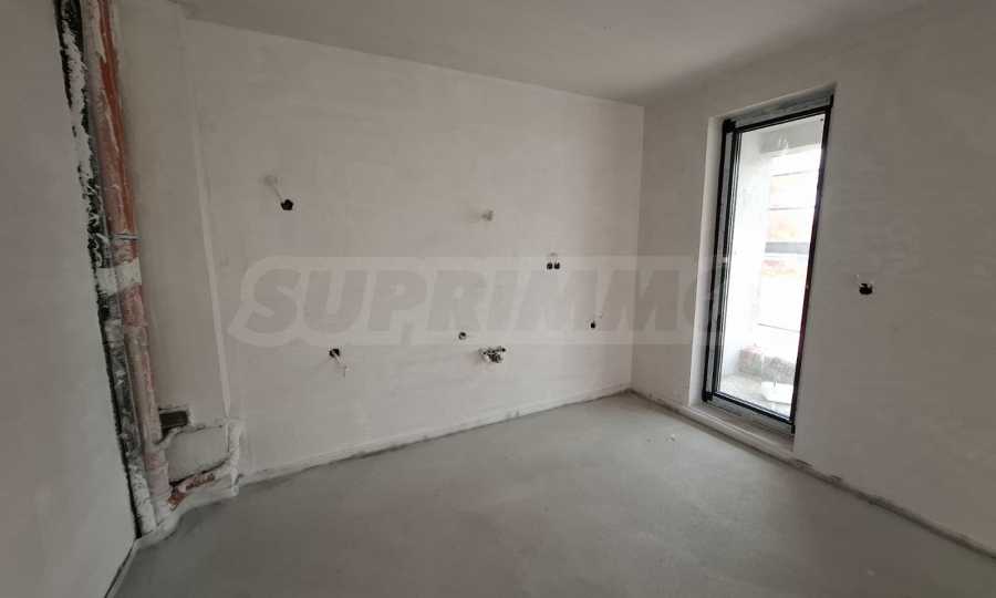 Имотът с обща площ от 79.42 кв.м е разположен на 2-ри етаж и има изложение север-запад. Разпределението включва входно антре с възможност за перално помещение, санитарно помещение, всекидневна с кухненски бокс и излаз на тераса, една спалня. Продава се в степен на завършеност по БДС (на шпакловка и замазка).
