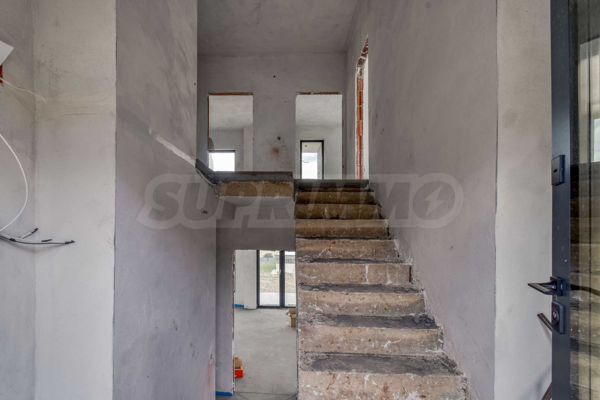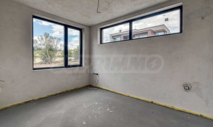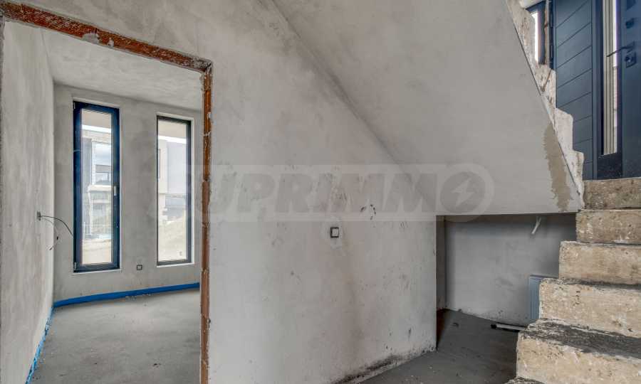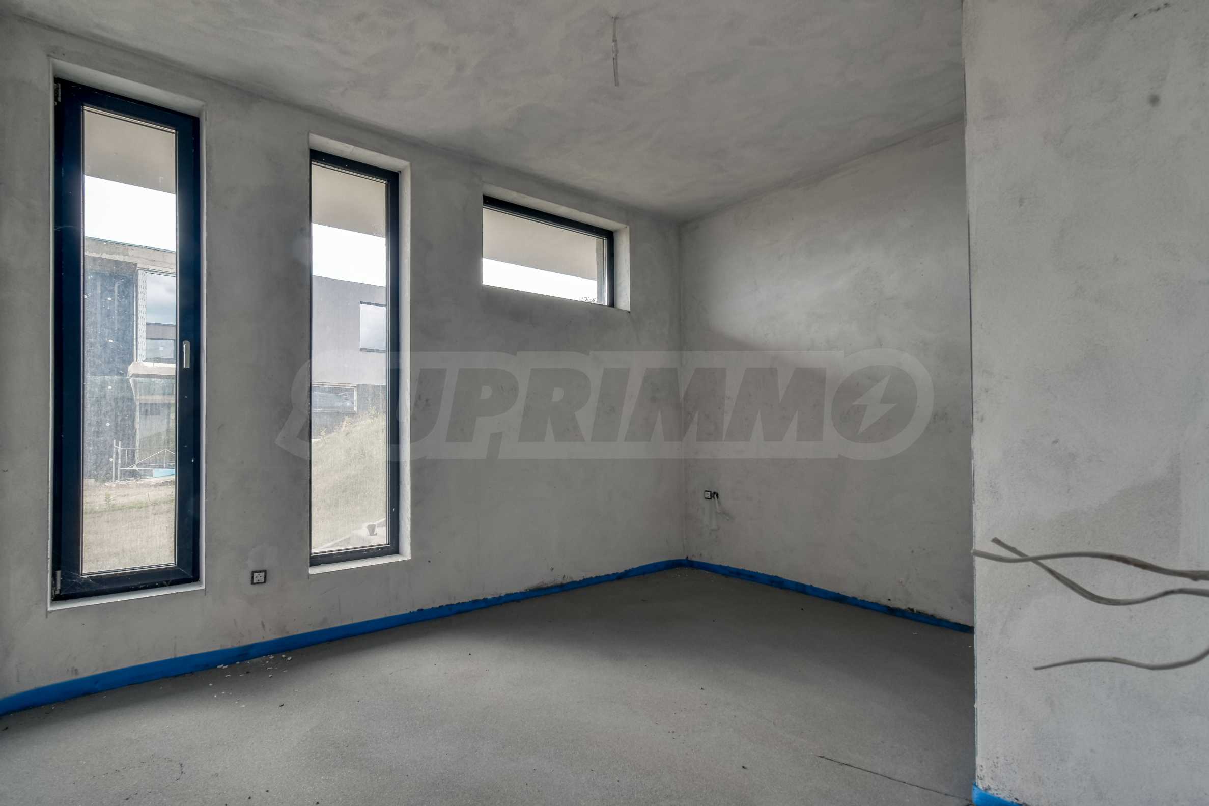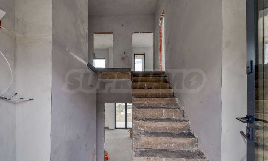 Двуетажните къщи предлагат функционално разпределение от 233 кв.м. РЗП, включващо просторна дневна зона, кухня, офис или спалня, санитарно помещение на първия етаж, както и три спални, гардеробна, мокро помещение и две бани на втория. Гаражите с площ 55 кв.м. и практичните складови пространства осигуряват пълен комфорт за всяко семейство.