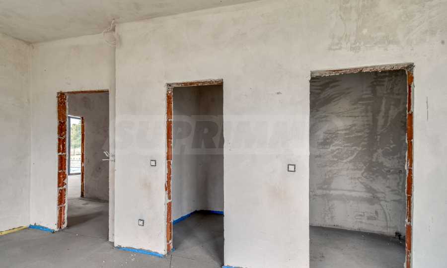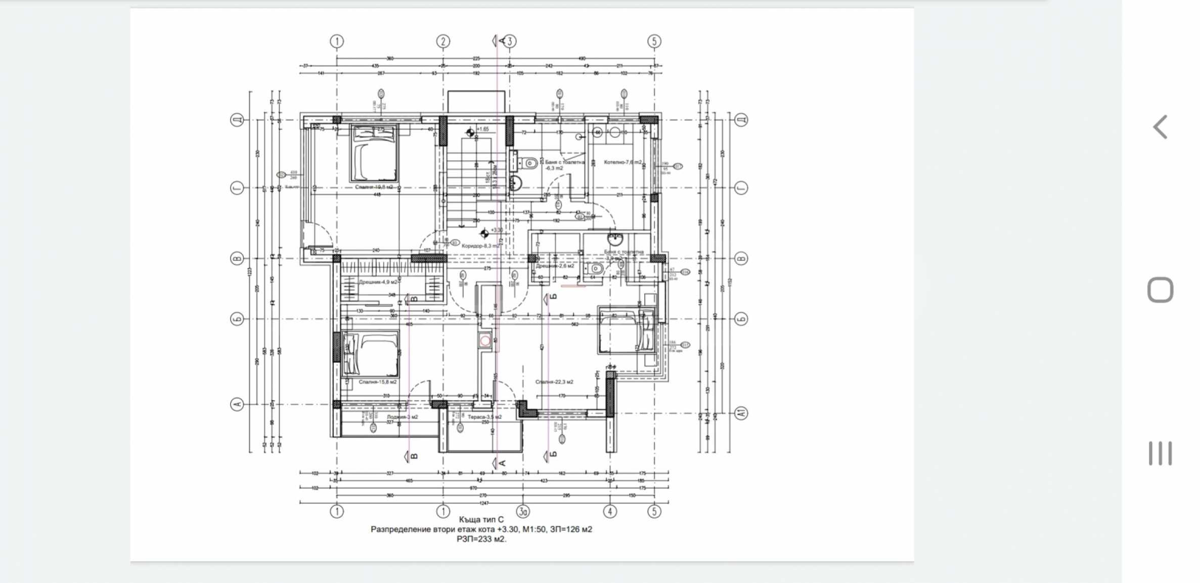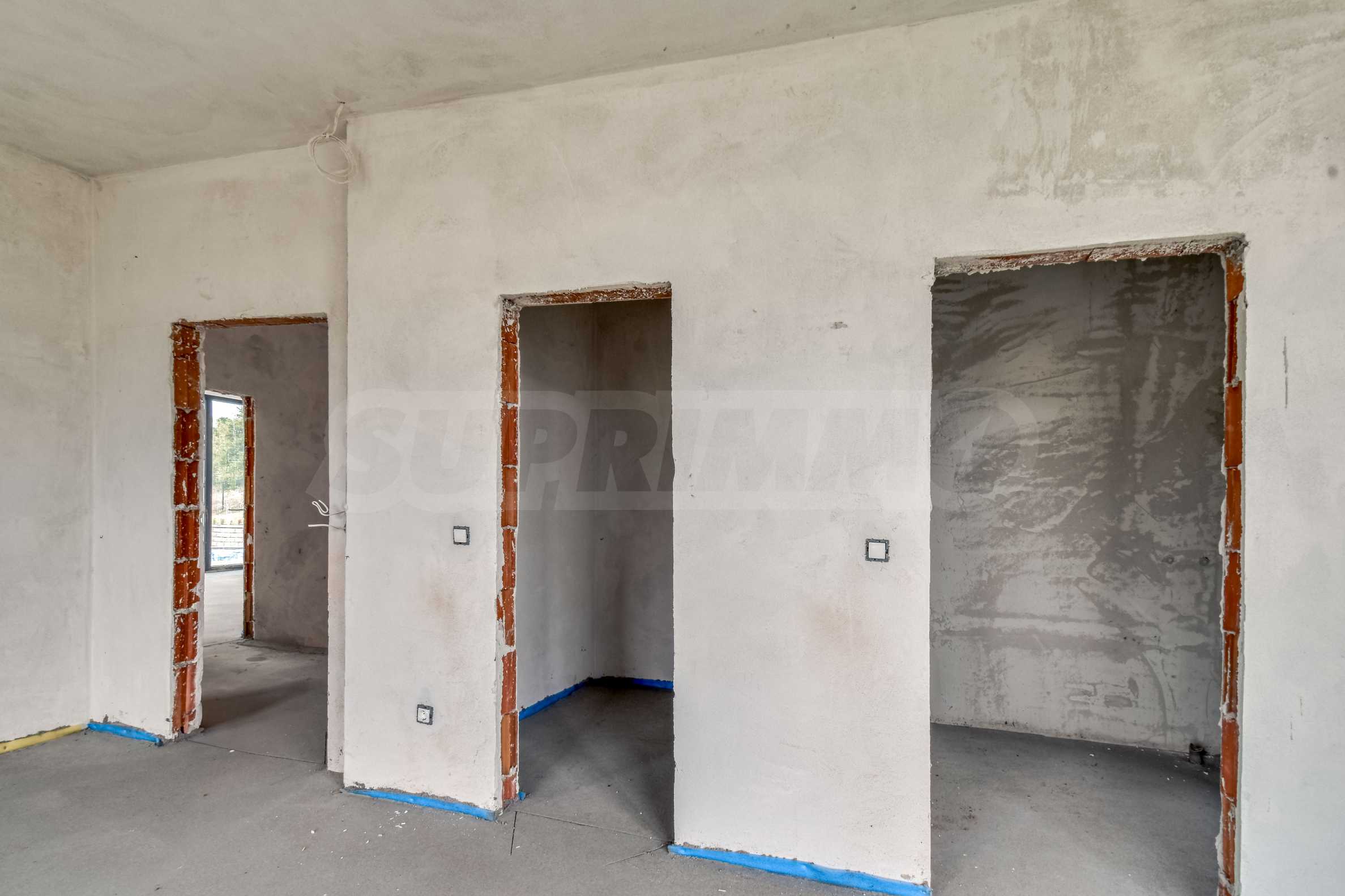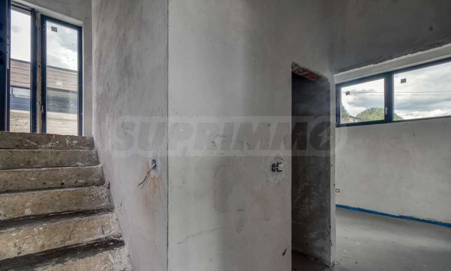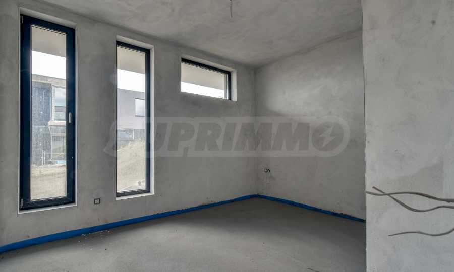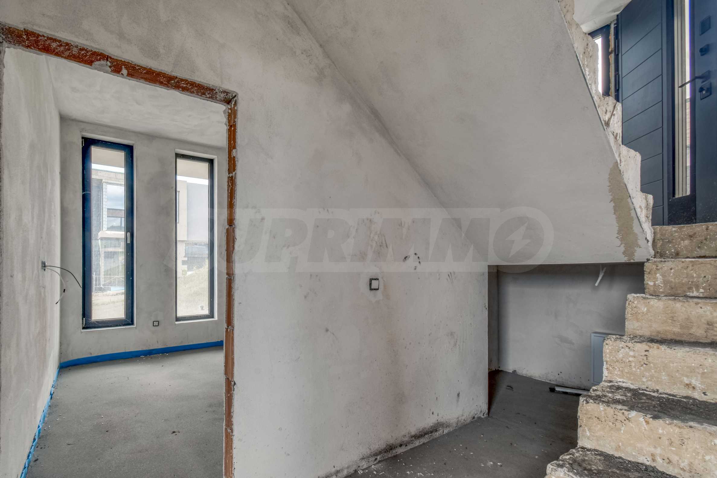 Двуетажните къщи предлагат функционално разпределение от 233 кв.м. РЗП, включващо просторна дневна зона, кухня, офис или спалня, санитарно помещение на първия етаж, както и три спални, гардеробна, мокро помещение и две бани на втория. Гаражите с площ 55 кв.м. и практичните складови пространства осигуряват пълен комфорт за всяко семейство.