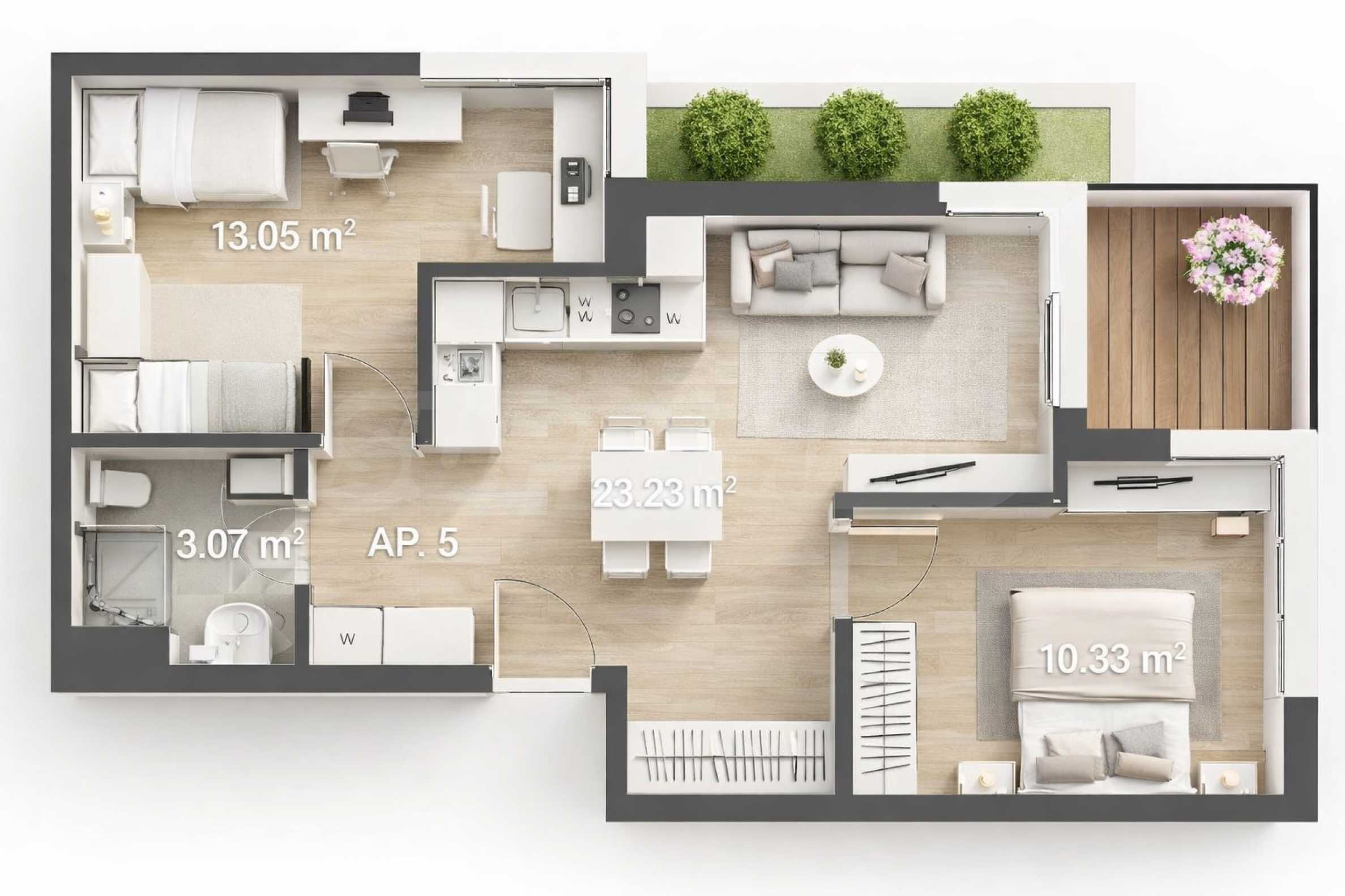 Апартаментът е ситуиран на първи етаж с обща площ 78.41 кв.м. (нетна площ 65.00 кв.м. + общи части 13.41 кв.м.) и има следното разпределение: