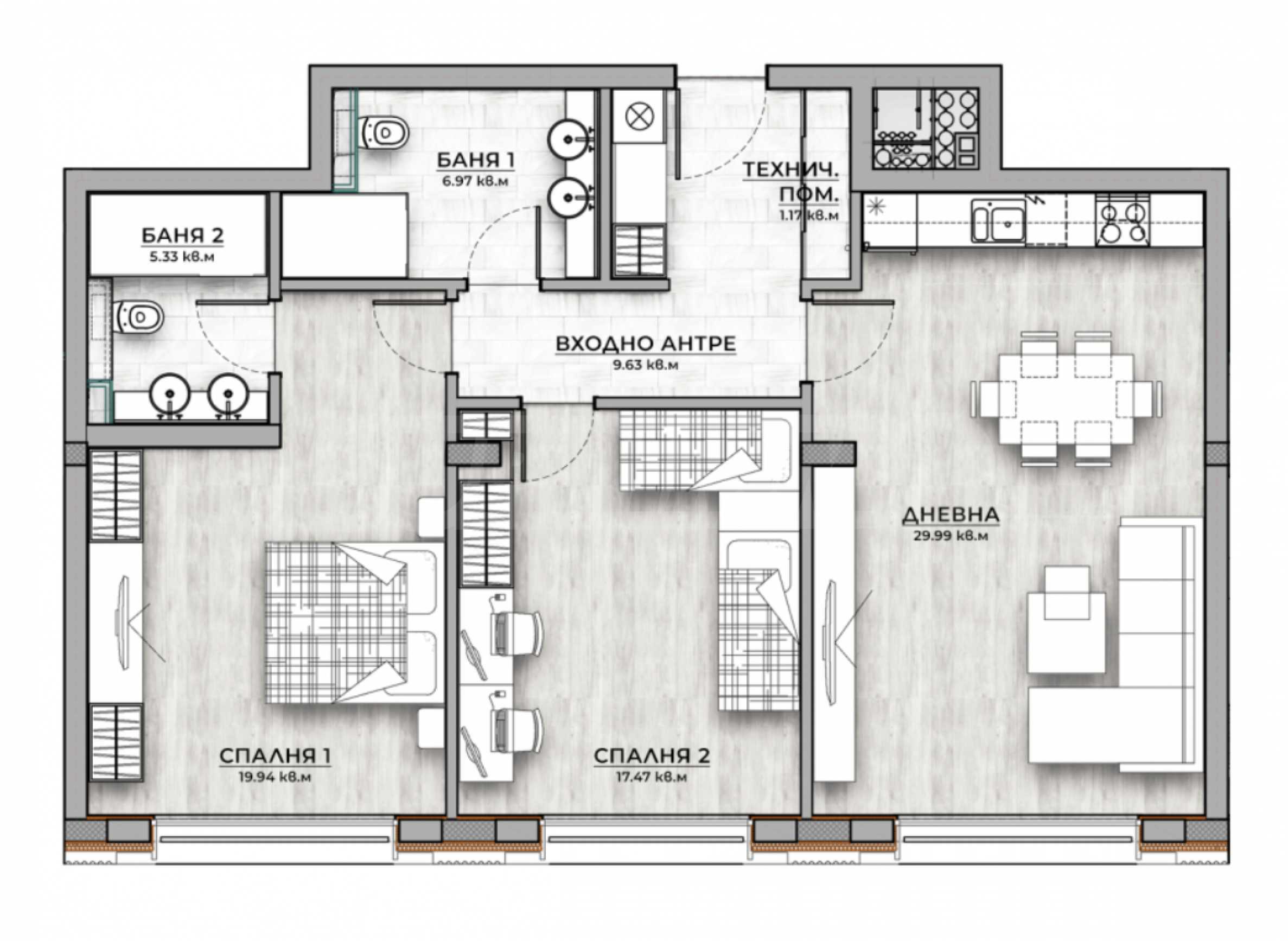 • С допълнителна шумоизолация на фасадни и имотни стени, както и всички подове, осигуряваща 30% по-добри показатели от стандартните нормативи.