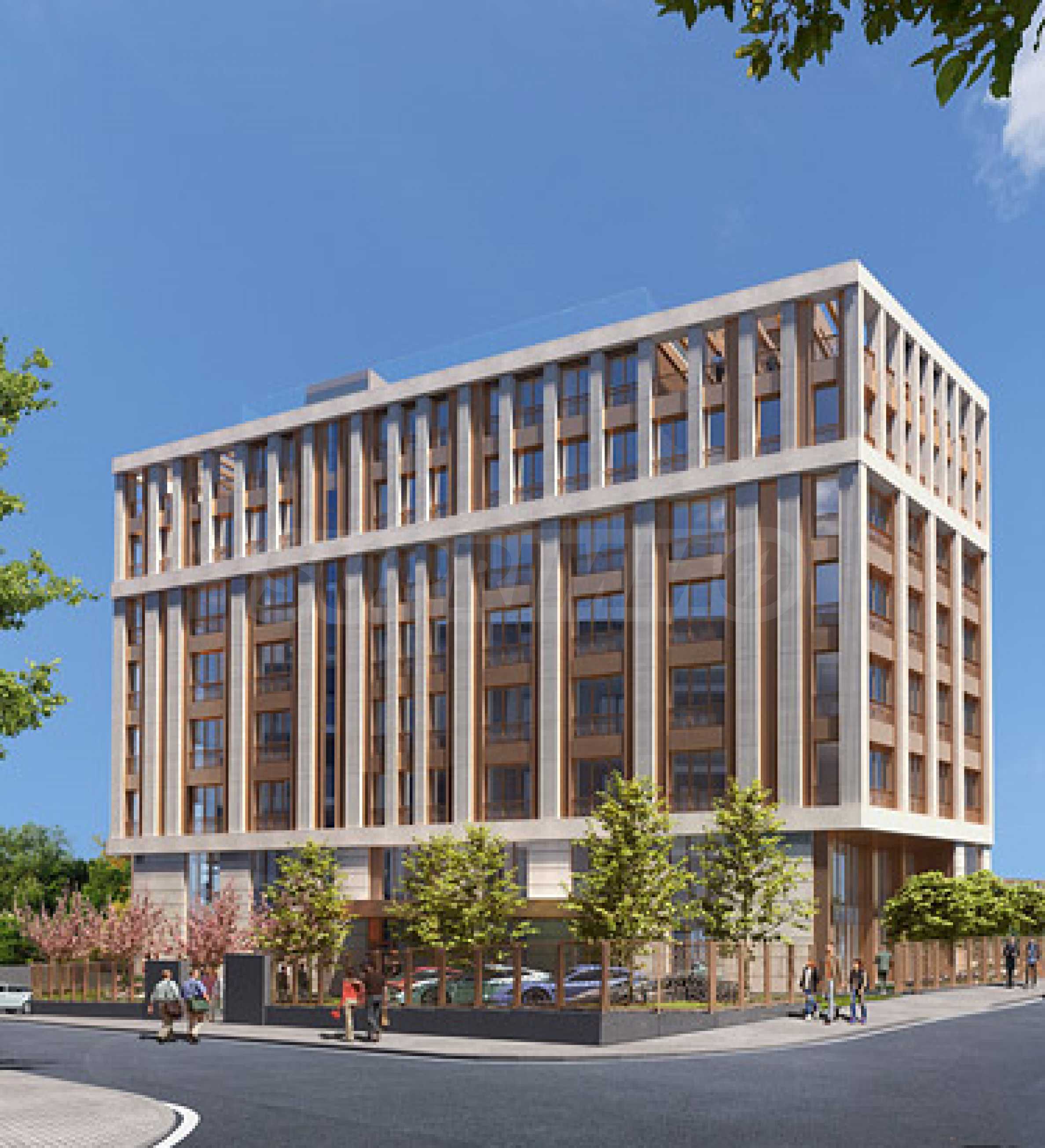 • Фасадата на сградата е елегантна комбинация от висококачествен варовик и алуминиеви панели с бронзово покритие.