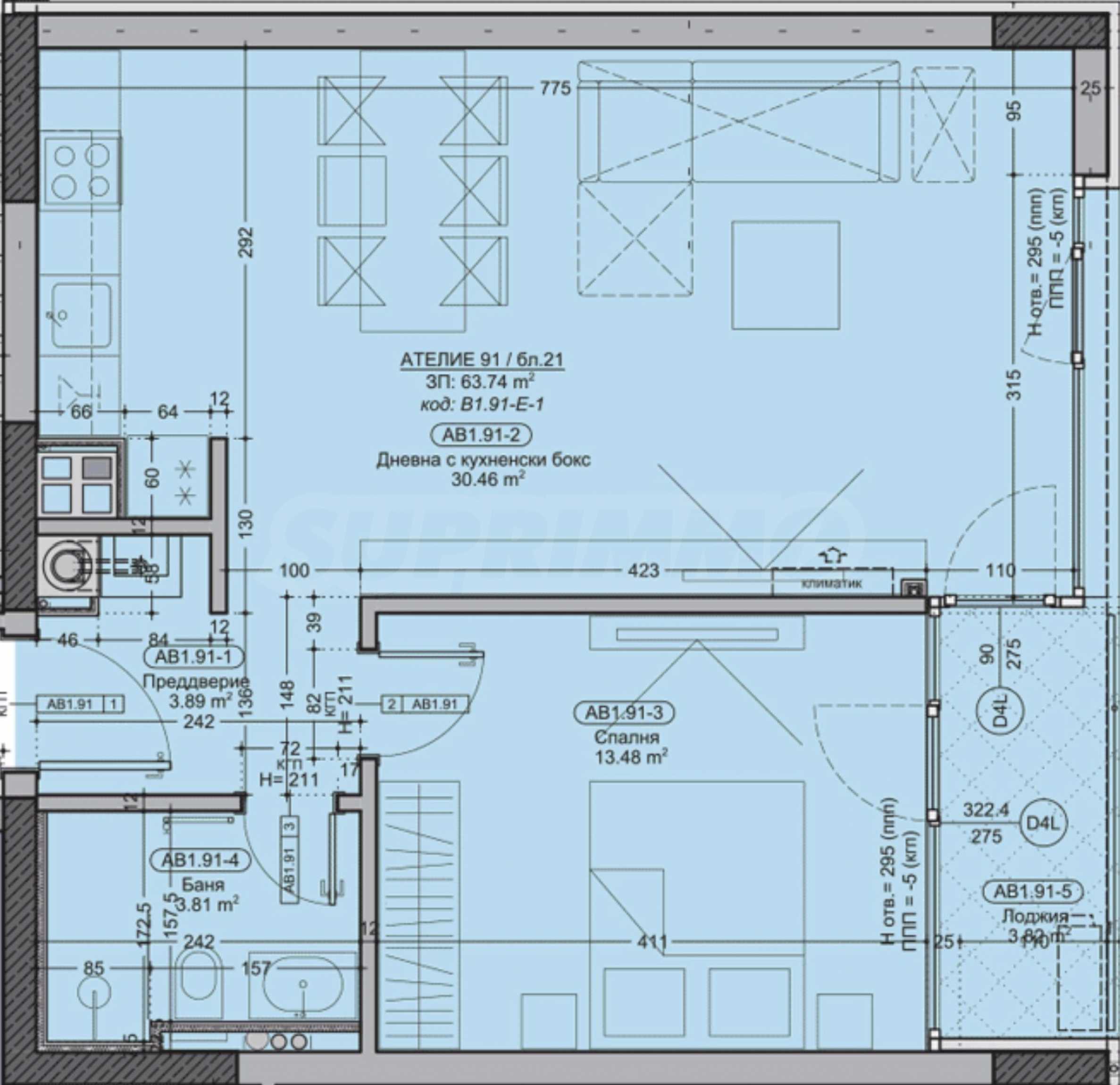 Апартаментът се намира на -1-ви етаж и има обща площ 76.34 кв.м, чиста площ - 63.74 кв.м. Състои се от антре, баня с тоалетна, спалня, всекидневна с кухня, тераса тип лоджия, с излаз от дневната и спалнята.