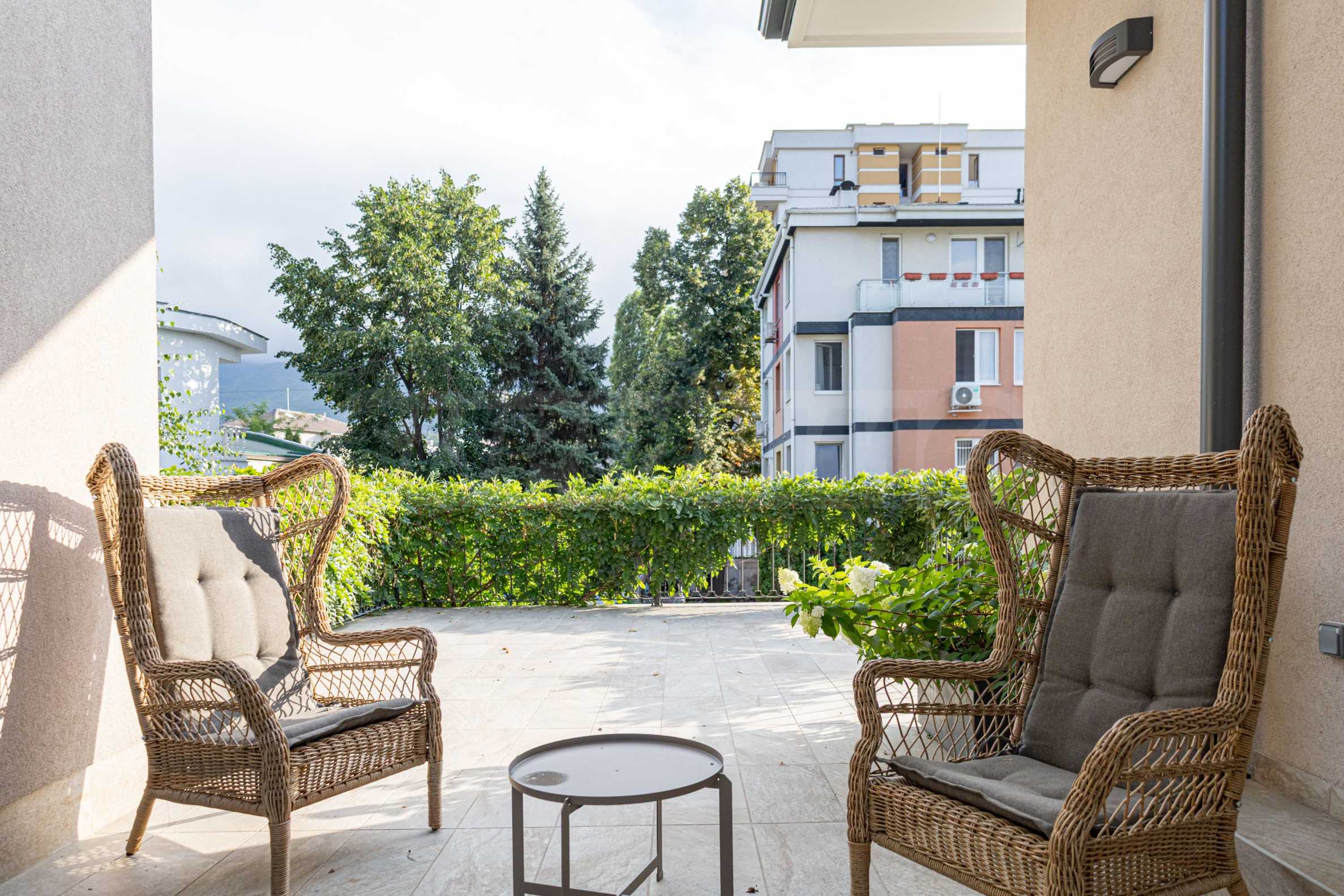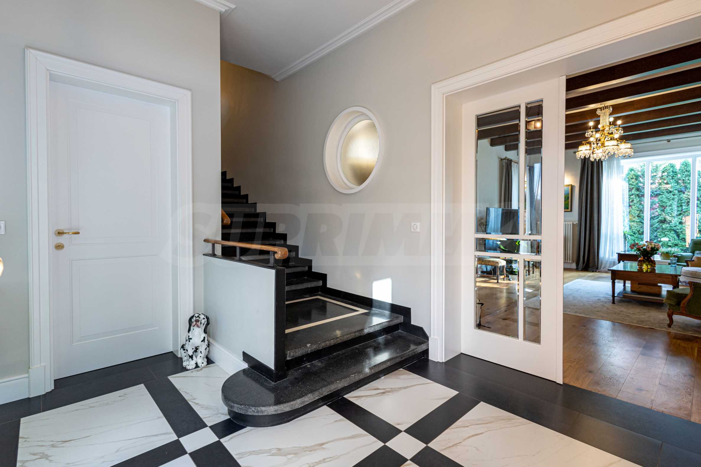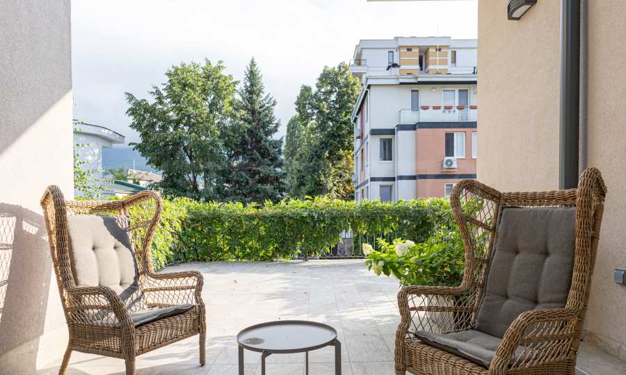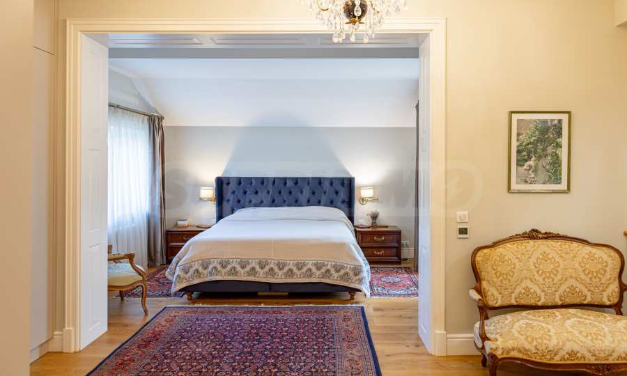 Прекрасното стълбище с възстановена мозайка и парапет отвежда до второ ниво, където са разположени две спални с баня и тоалетна, отделна тоалетна, родителска спалня с гардеробна и баня, както и кабинет със самостоятелна баня. Тук ще откриете и обширна тераса с гледка към двора и Витоша.