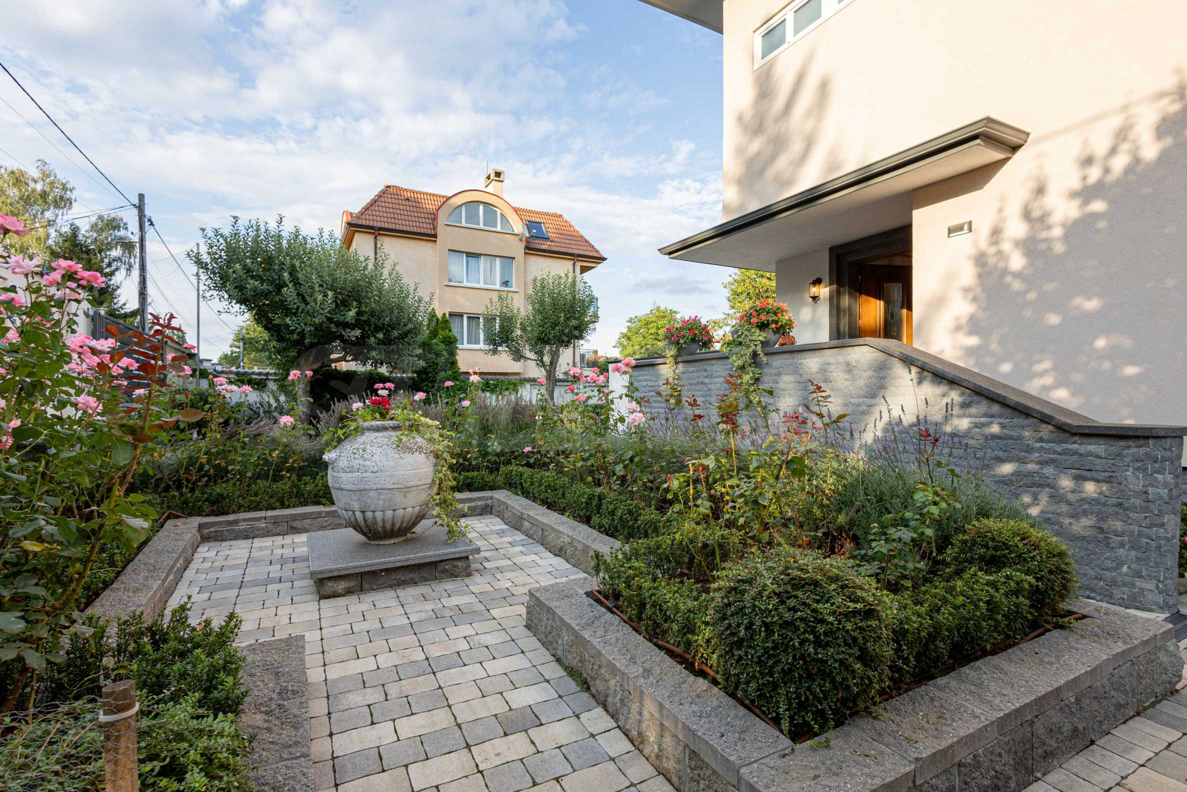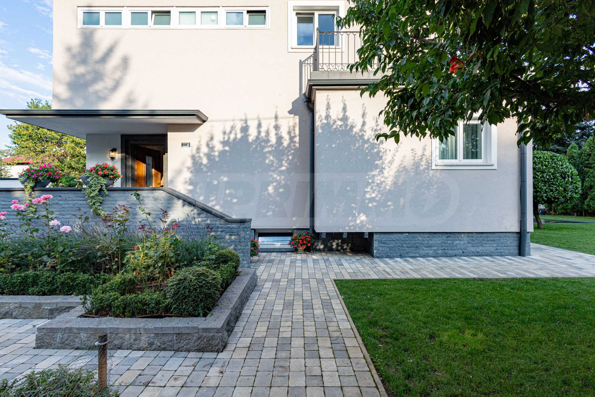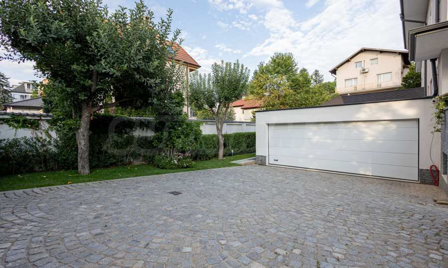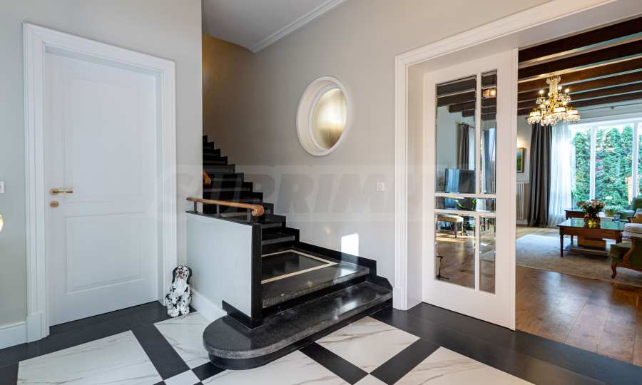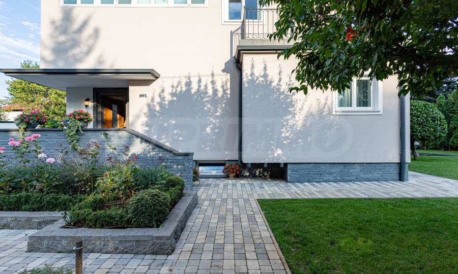 На този етаж ще откриете също така кабинет, килер, отделна тоалетна за гости и баня с тоалетна за гости. Партерният етаж е с топла връзка към просторен гараж за две коли и допълнителен апартамент за гости със самостоятелен вход, всекидневна с кухня и зимна градина, спалня, баня и тоалетна.