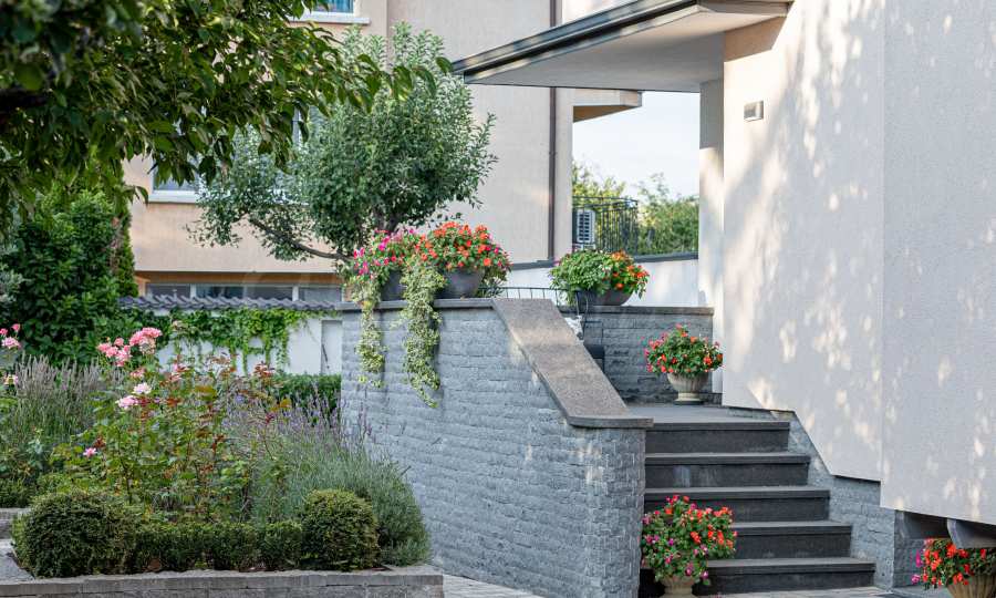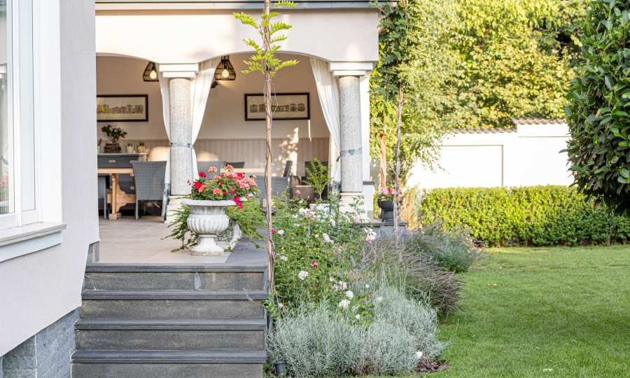 Вторият вход, характерен за сградите от началото на века, отвежда до чудесно сенчесто място в градината, обособено като кът за кафе.