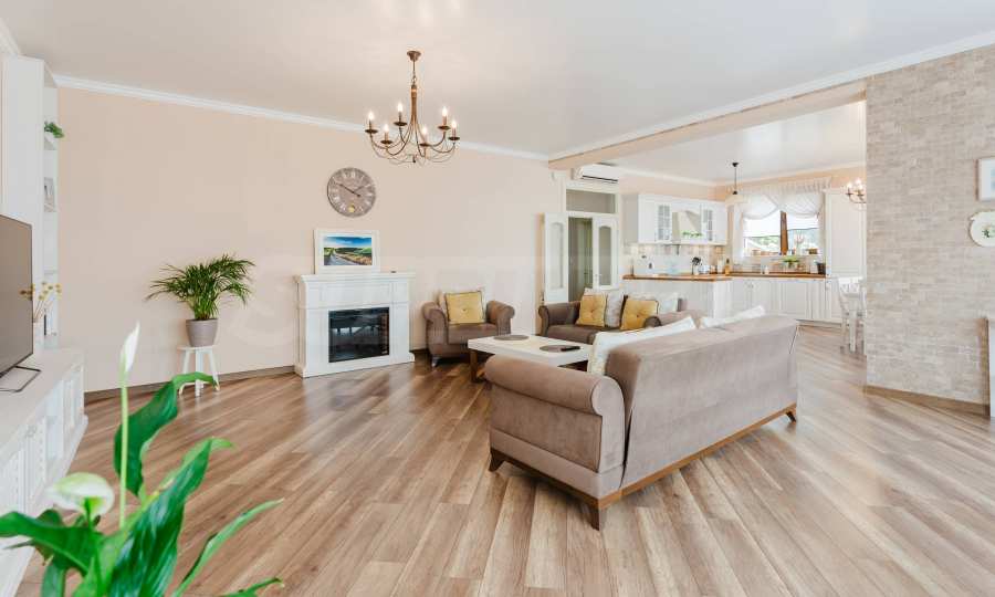 • всекидневна с трапезария: трапезна маса с 6 стола, висок клас мека мебел, настолна маса, телевизор, климатик, камина;