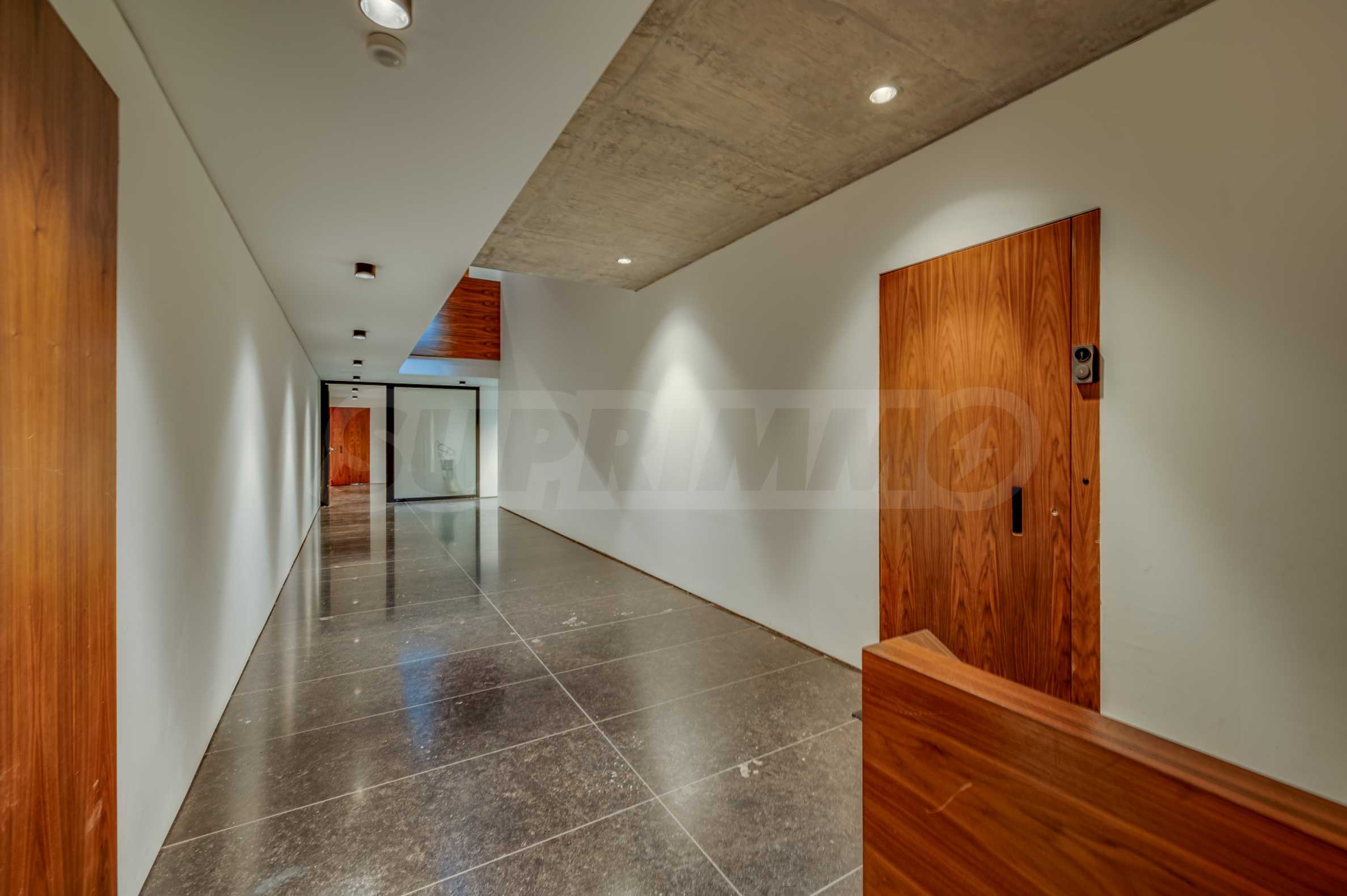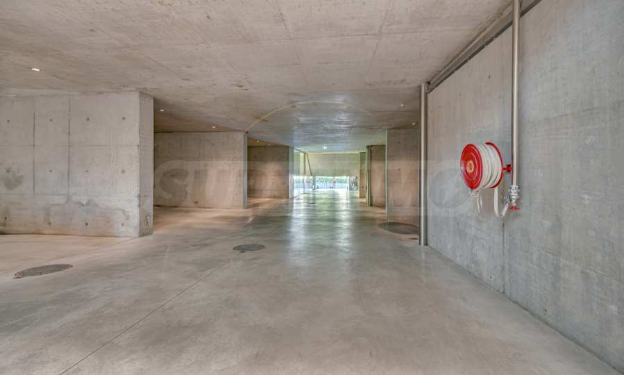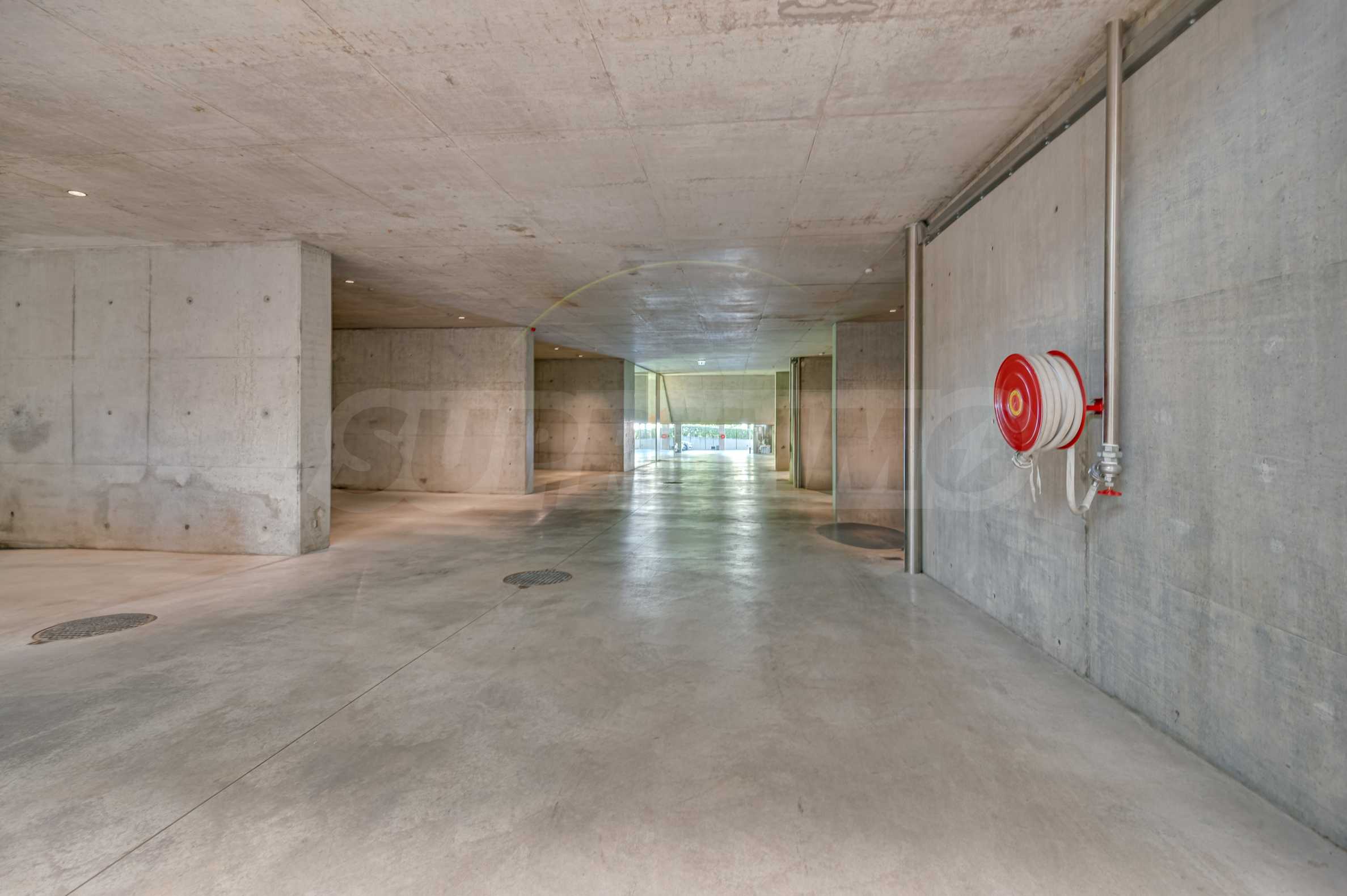 Нивото с гаража е вкопано в терена, но е озарено от естествена светлина и предлага директен изглед към гората. Оттук се осъществява връзка с представителното фоайе, което разполага и с малък амфитеатър – място за събиране и общуване на обитателите. За максимален комфорт и спокойствие, сградата разполага с денонощна жива охрана и видеонаблюдение, както и с портиер.