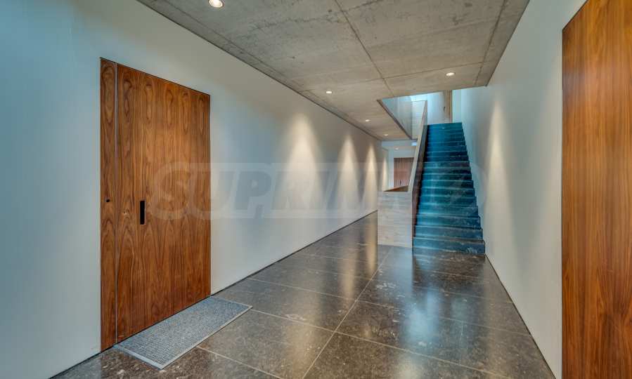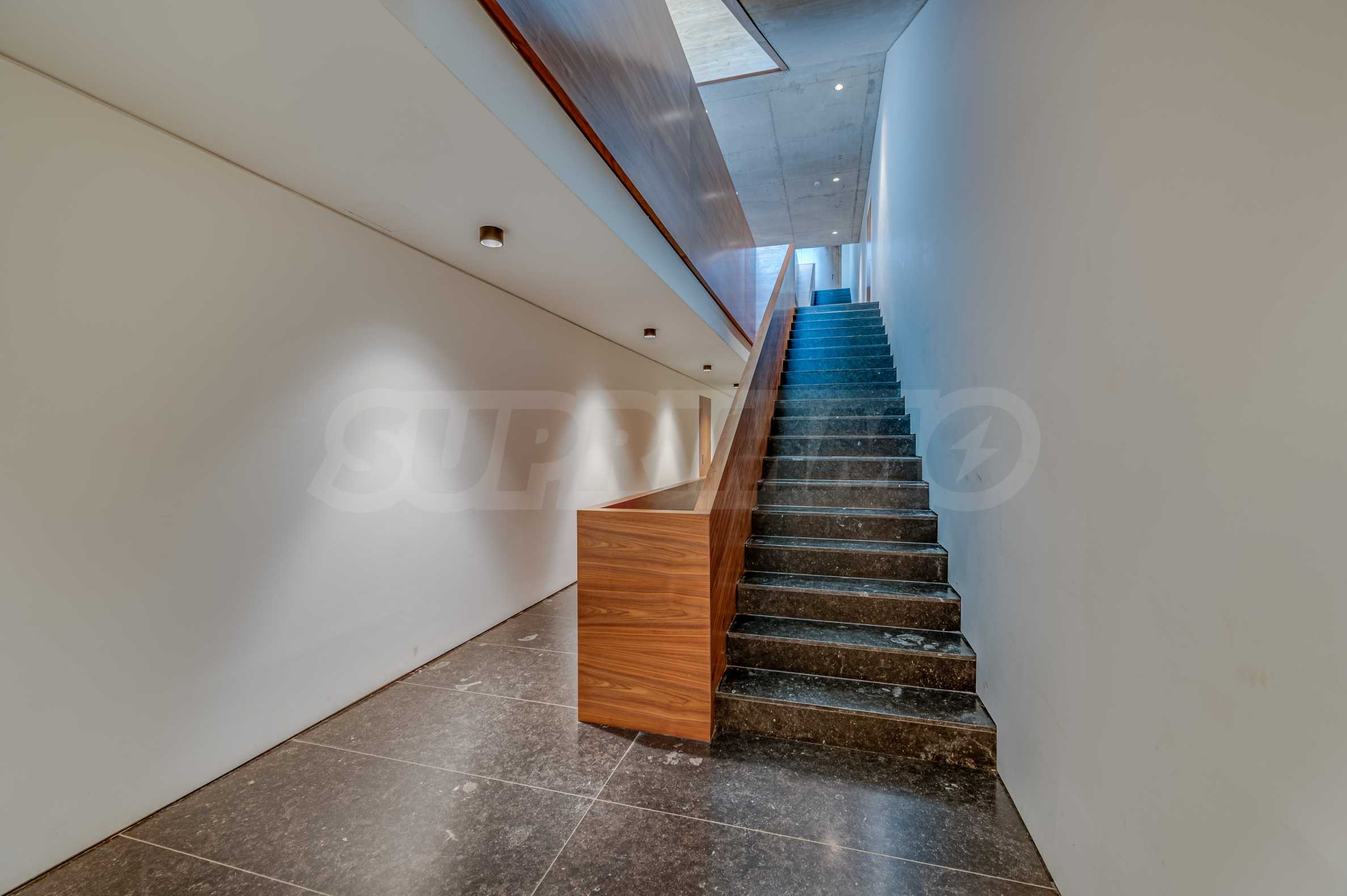 Общите части са изпипани до последния детайл – настилка от полиран бетон, тавани и стени от видим бетон, едроразмерни каменни плочи във фоайето и стълбището, дизайнерско осветление и парапети от неръждаема стомана. Големите витринни прозорци превръщат сградата в естествено продължение на природата, като отразяват гората и небето.