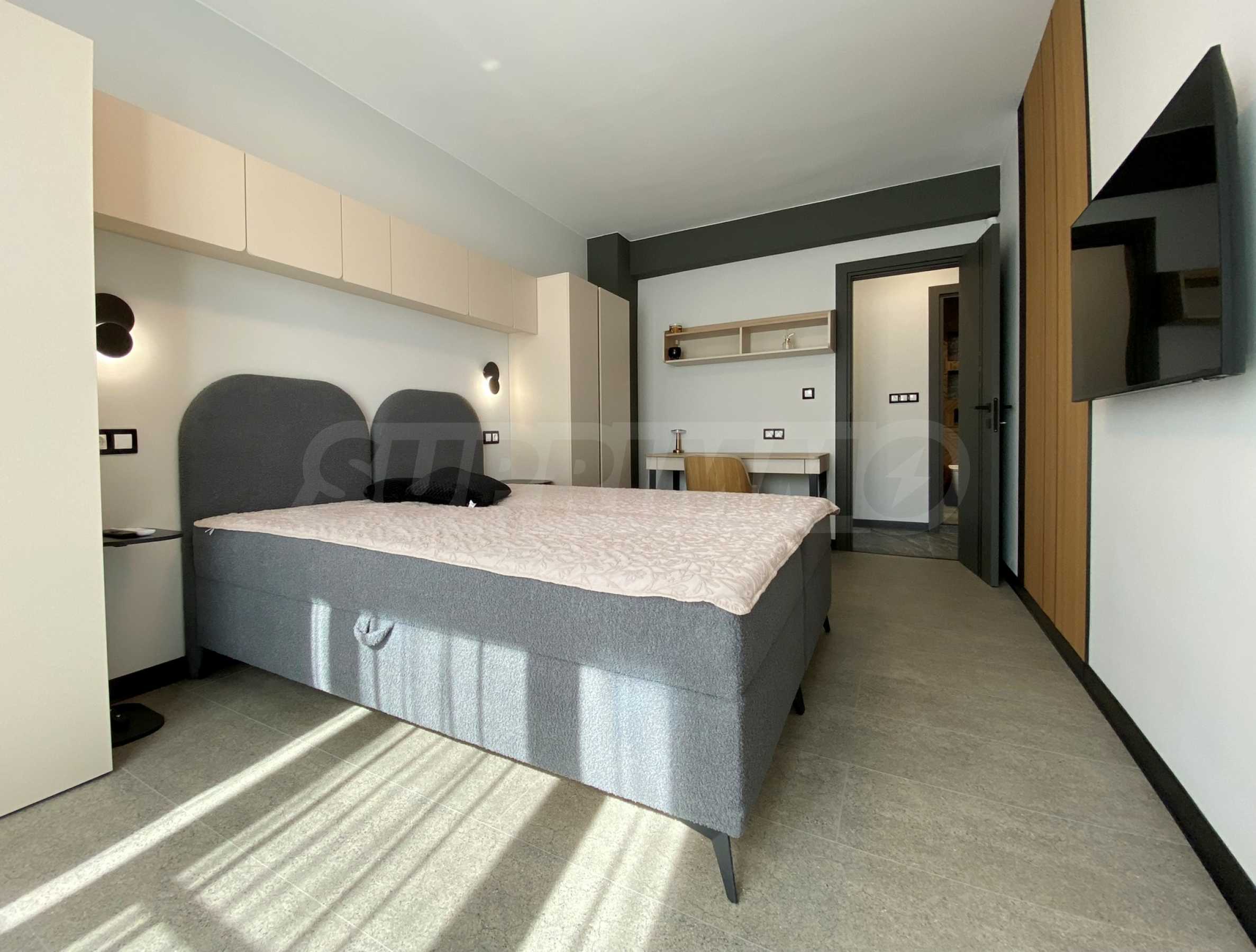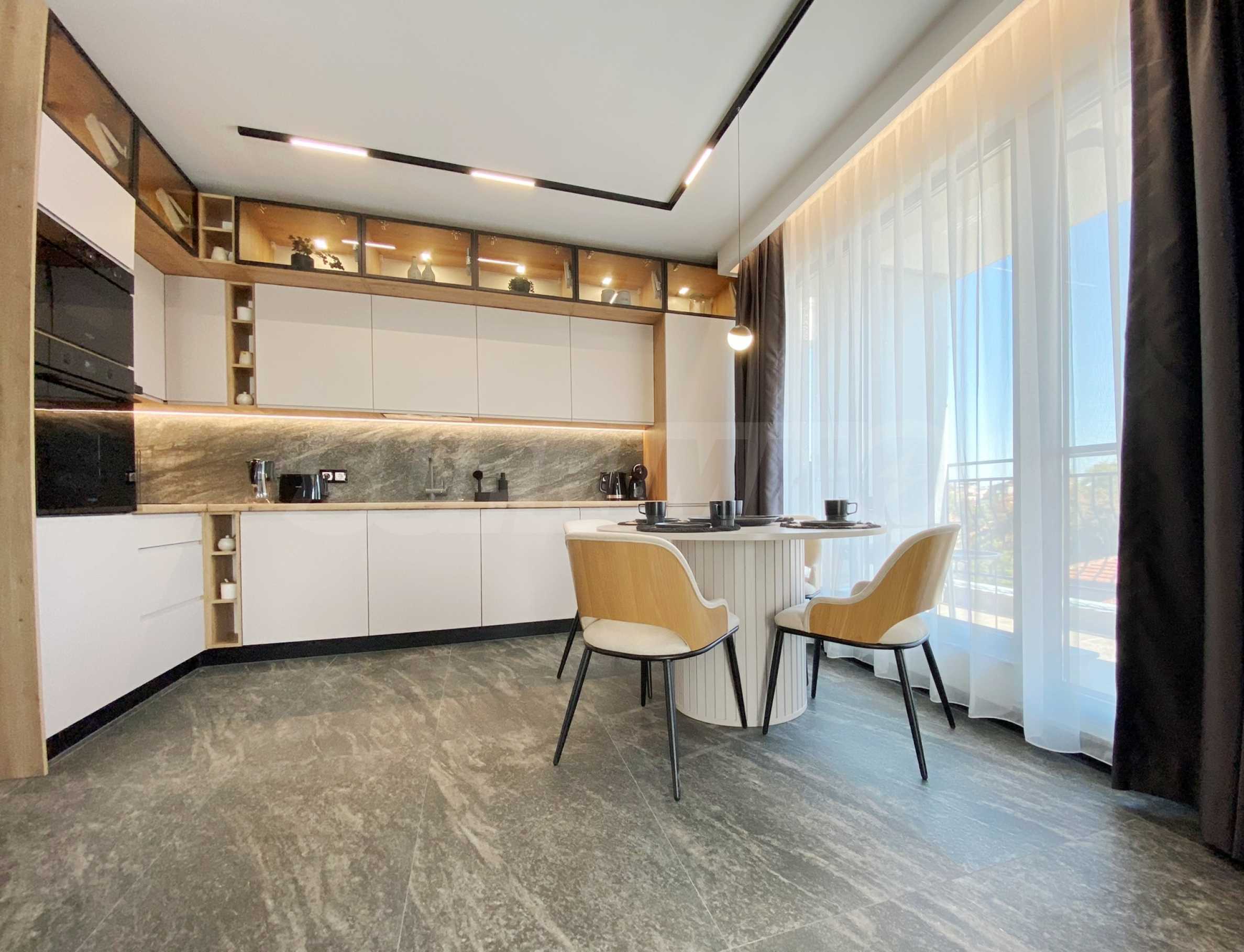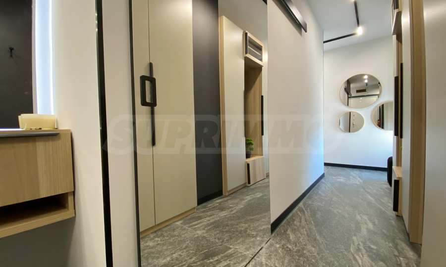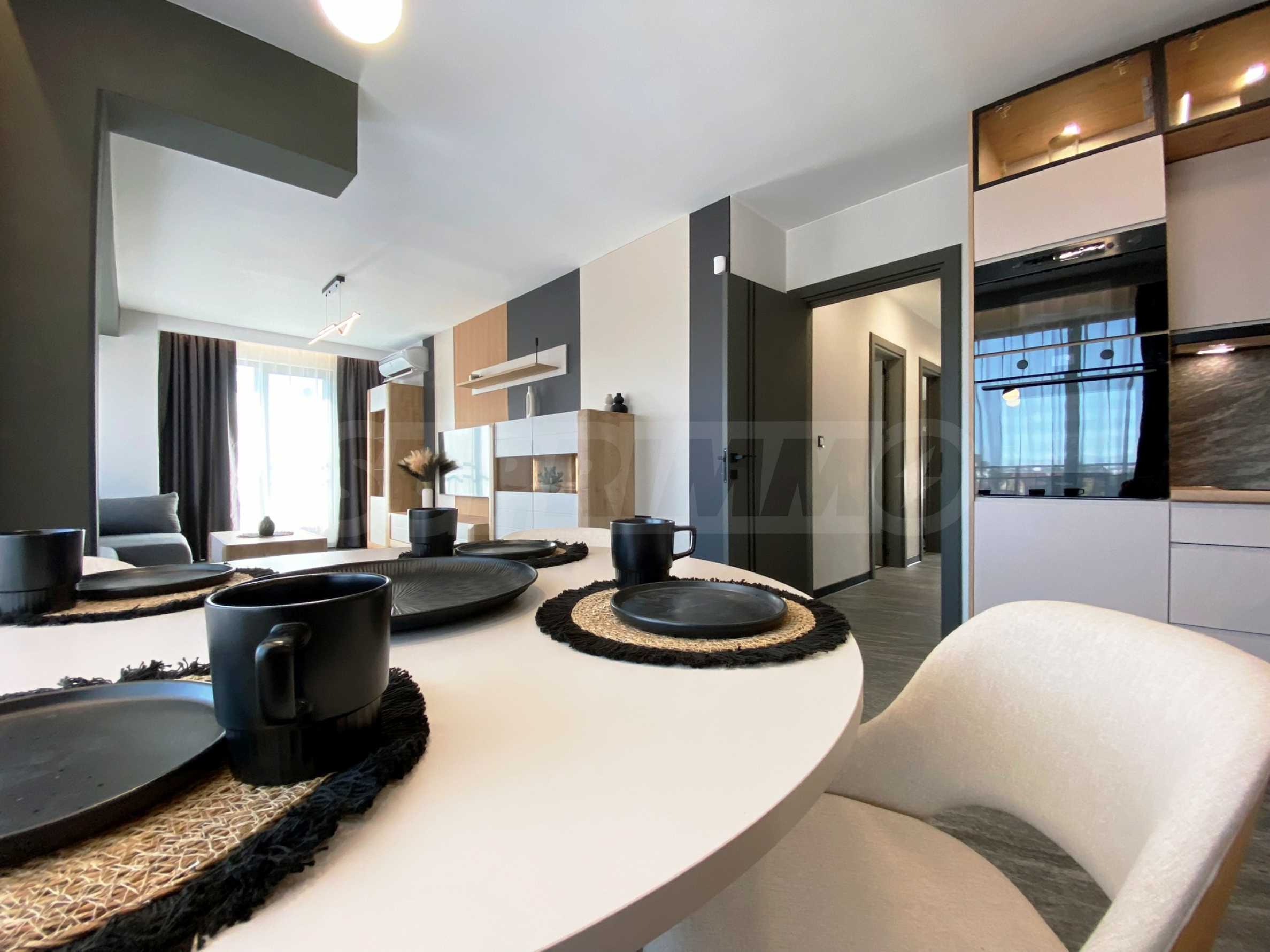 Апартаментът е напълно обзаведен и оборудван с всичко необходимо, със стилни мебели по проект и ел. уреди в гаранция и с висок енергиен клас, включително съдомиялна. Разполага и с три smart TV, както и оптичен интернет. Отоплението и охлаждането са решени с инверторни климатици във всяка стая.