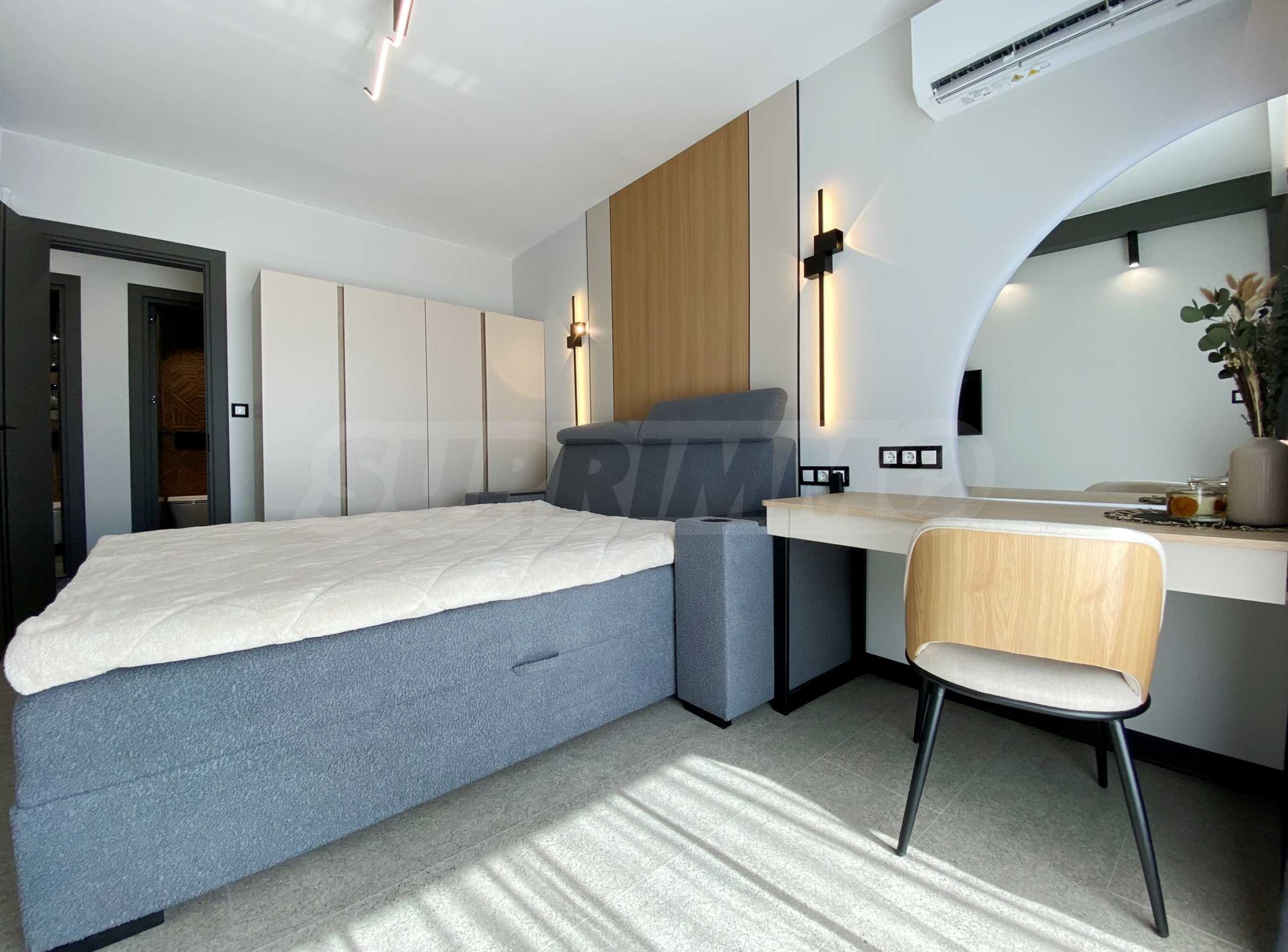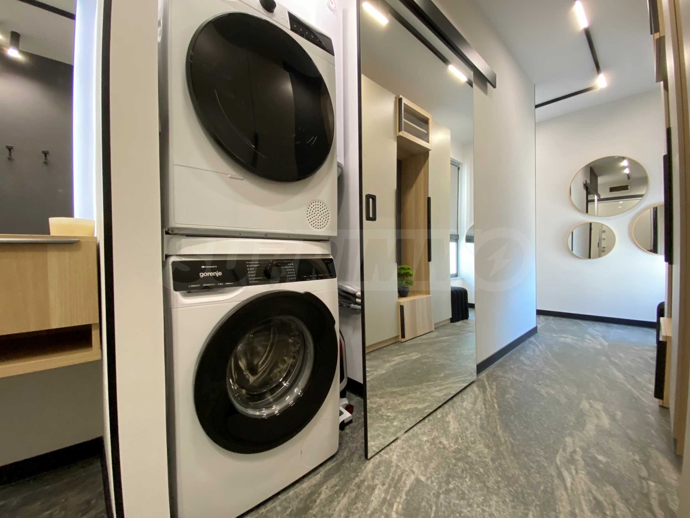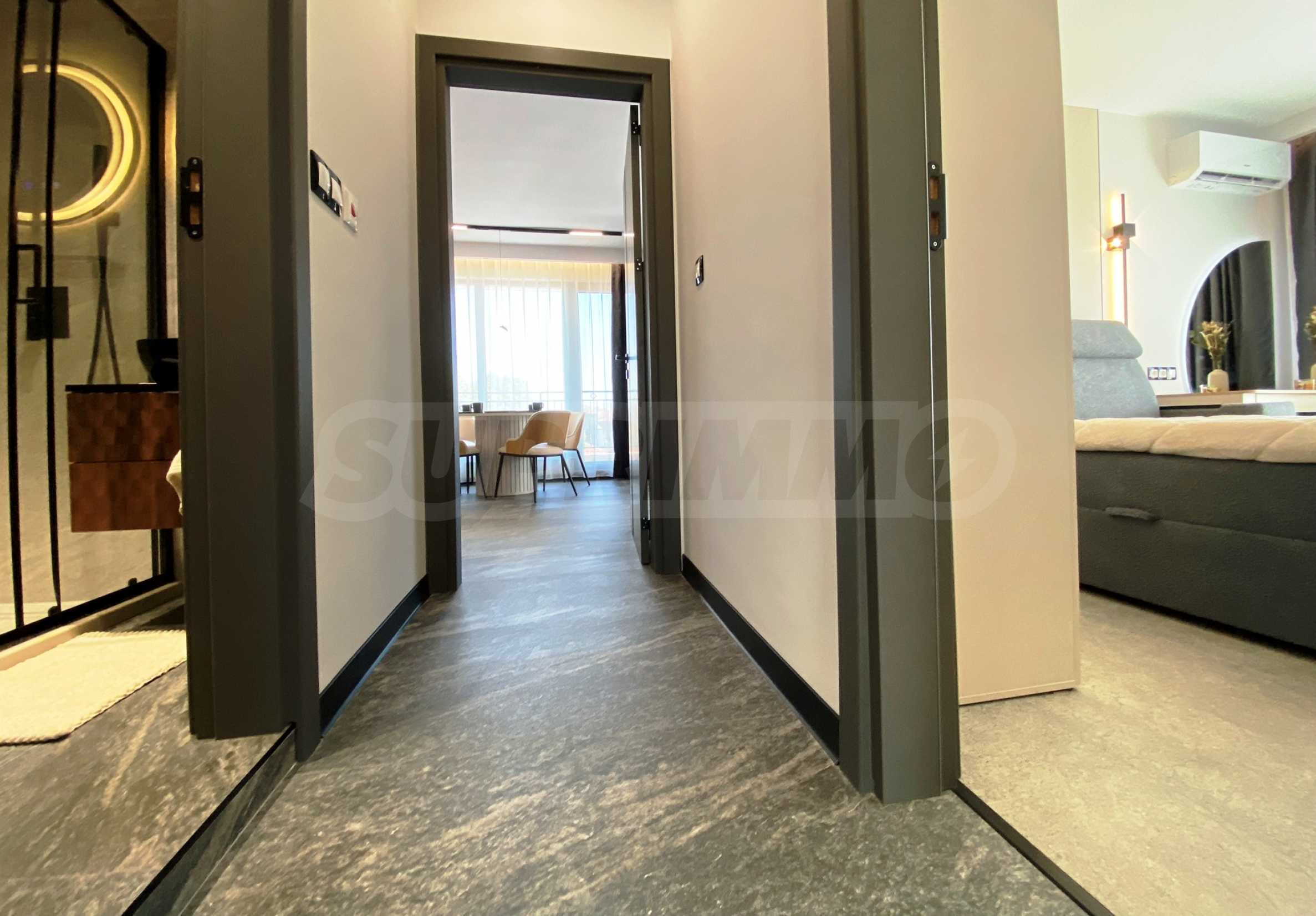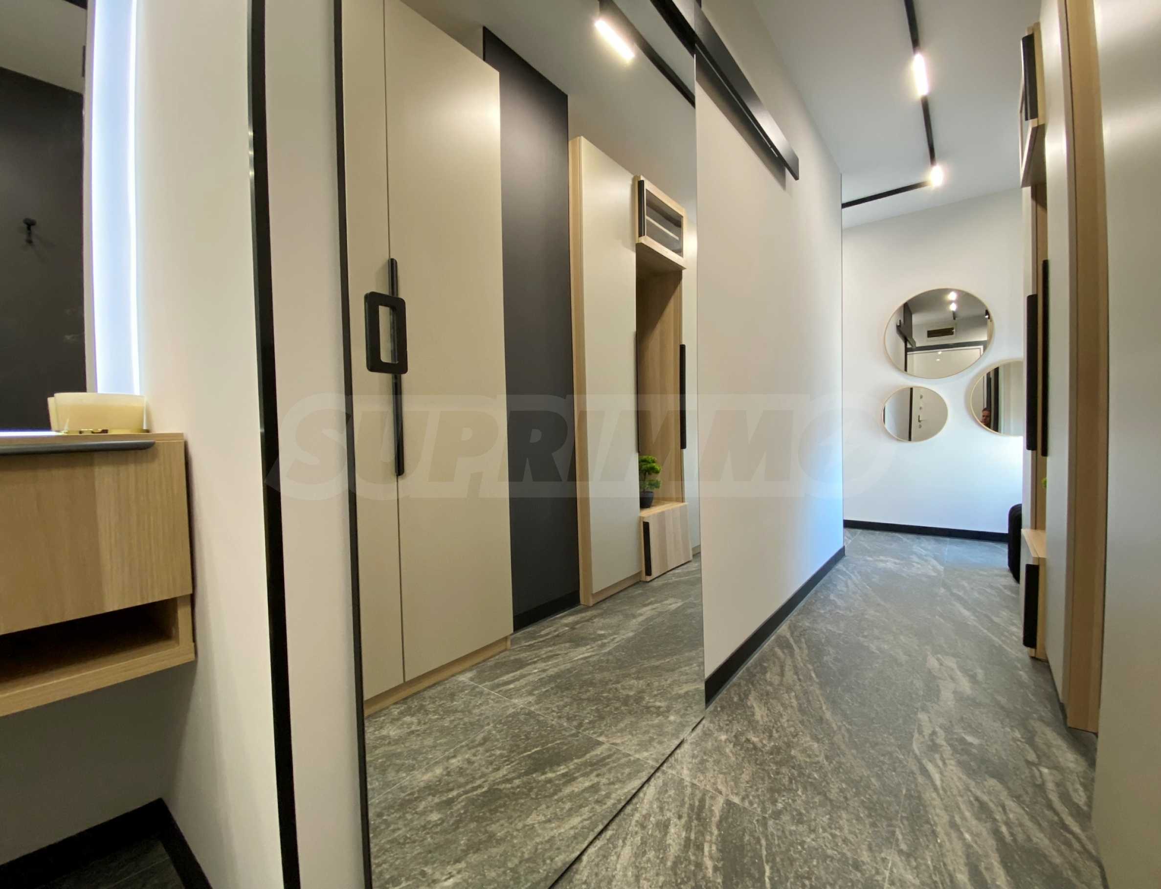 Апартаментът е напълно обзаведен и оборудван с всичко необходимо, със стилни мебели по проект и ел. уреди в гаранция и с висок енергиен клас, включително съдомиялна. Разполага и с три smart TV, както и оптичен интернет. Отоплението и охлаждането са решени с инверторни климатици във всяка стая.