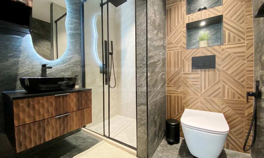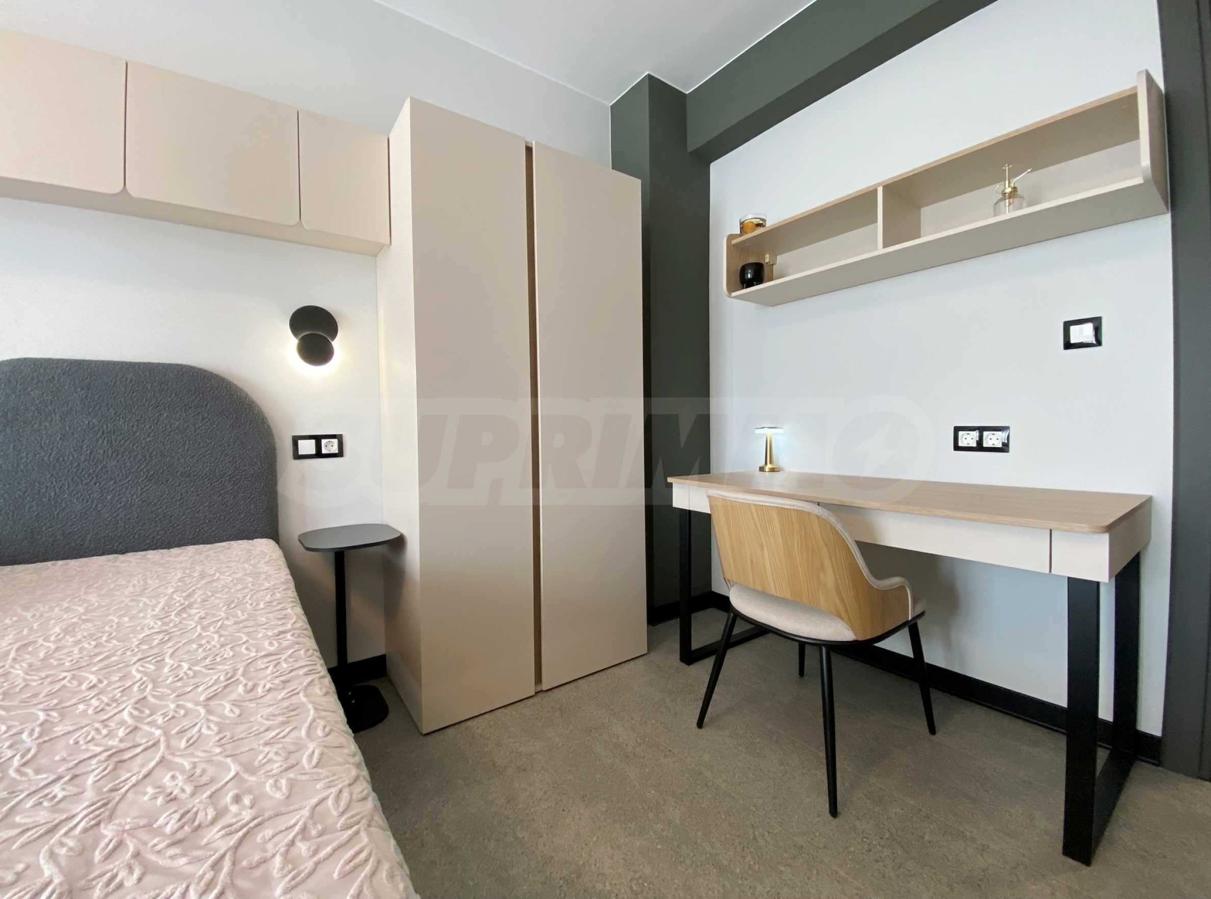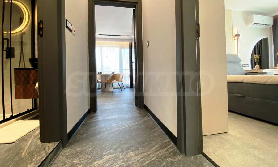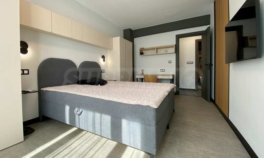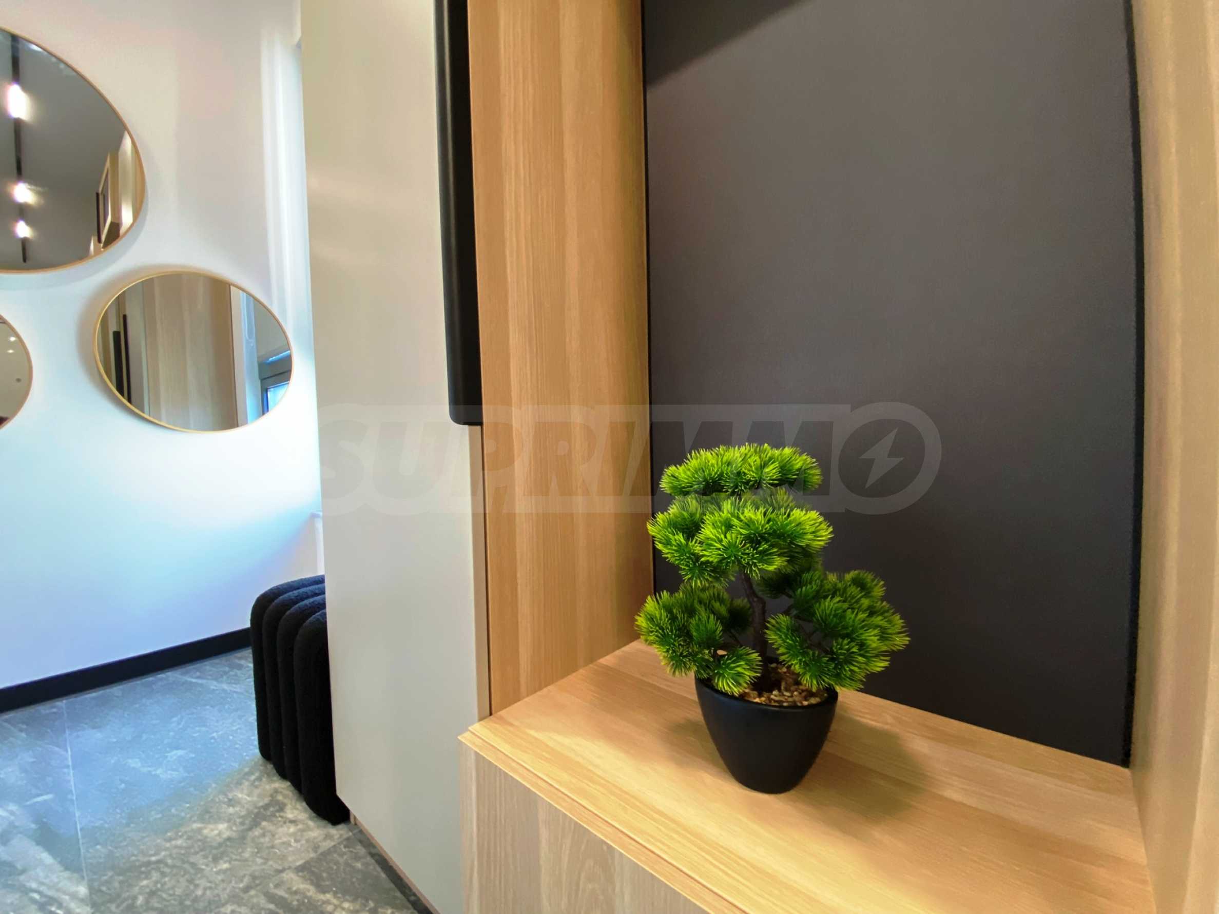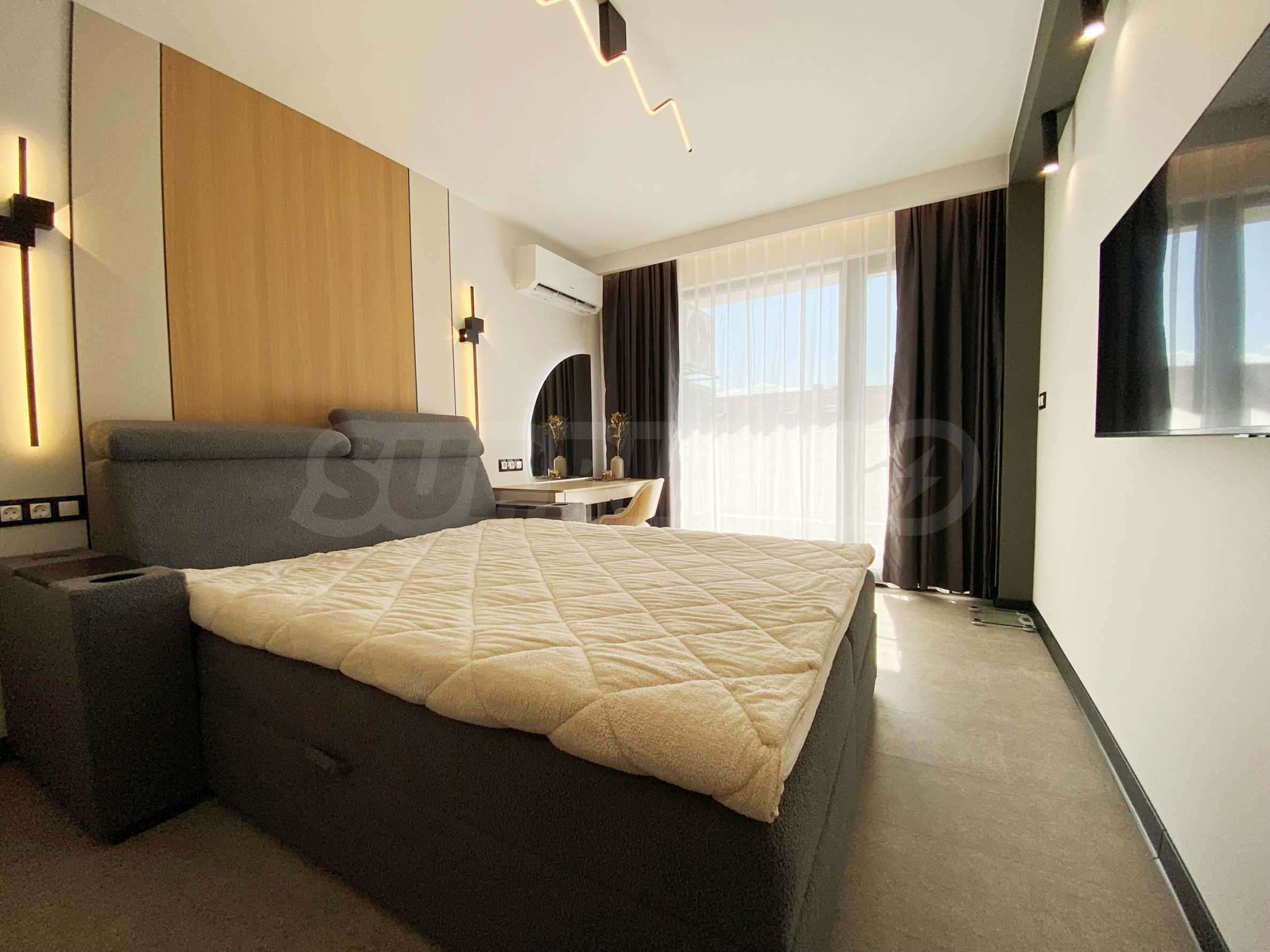 Апартаментът е напълно обзаведен и оборудван с всичко необходимо, със стилни мебели по проект и ел. уреди в гаранция и с висок енергиен клас, включително съдомиялна. Разполага и с три smart TV, както и оптичен интернет. Отоплението и охлаждането са решени с инверторни климатици във всяка стая.