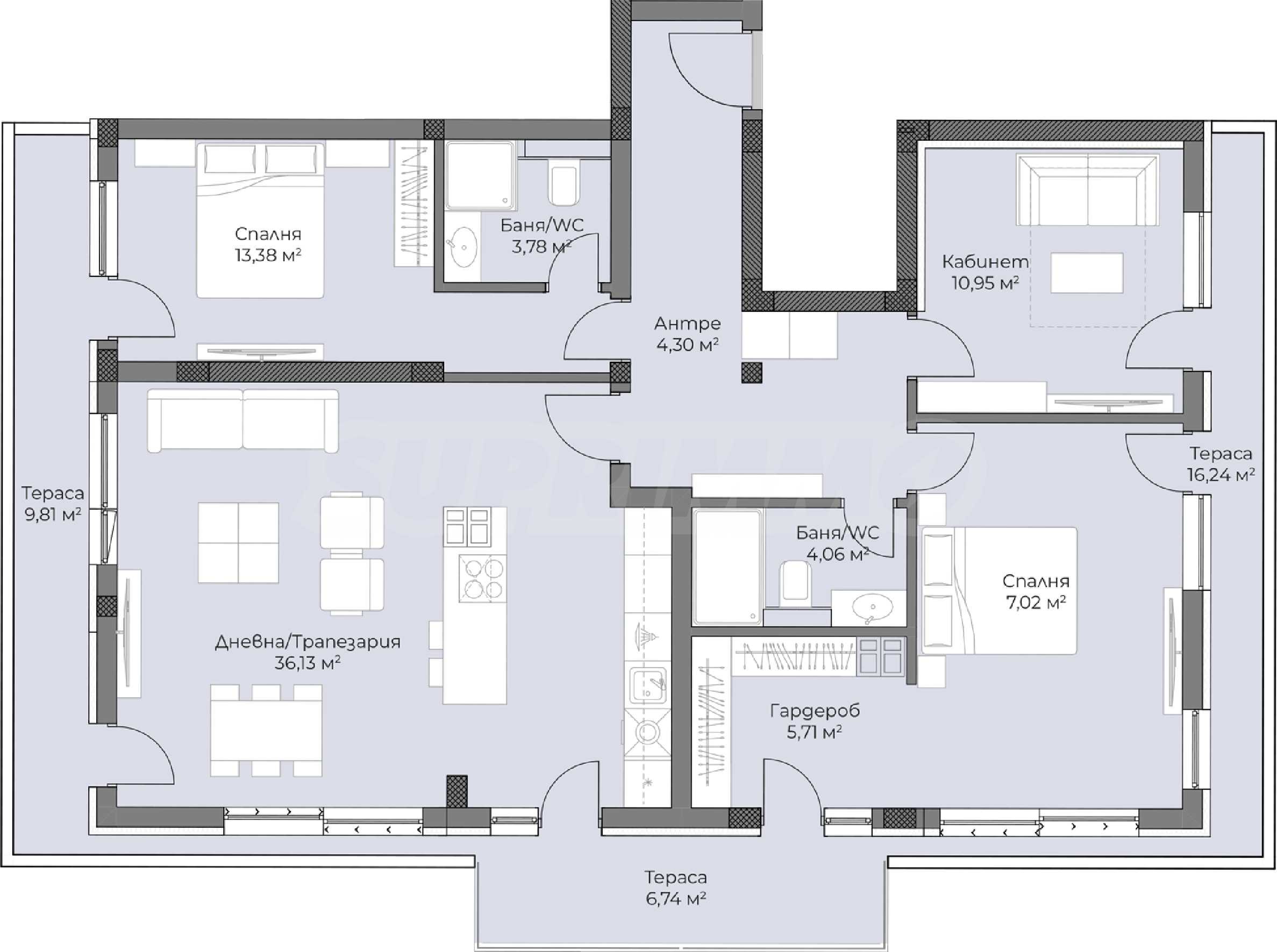 • дневна с кухненски кът и трапезария;