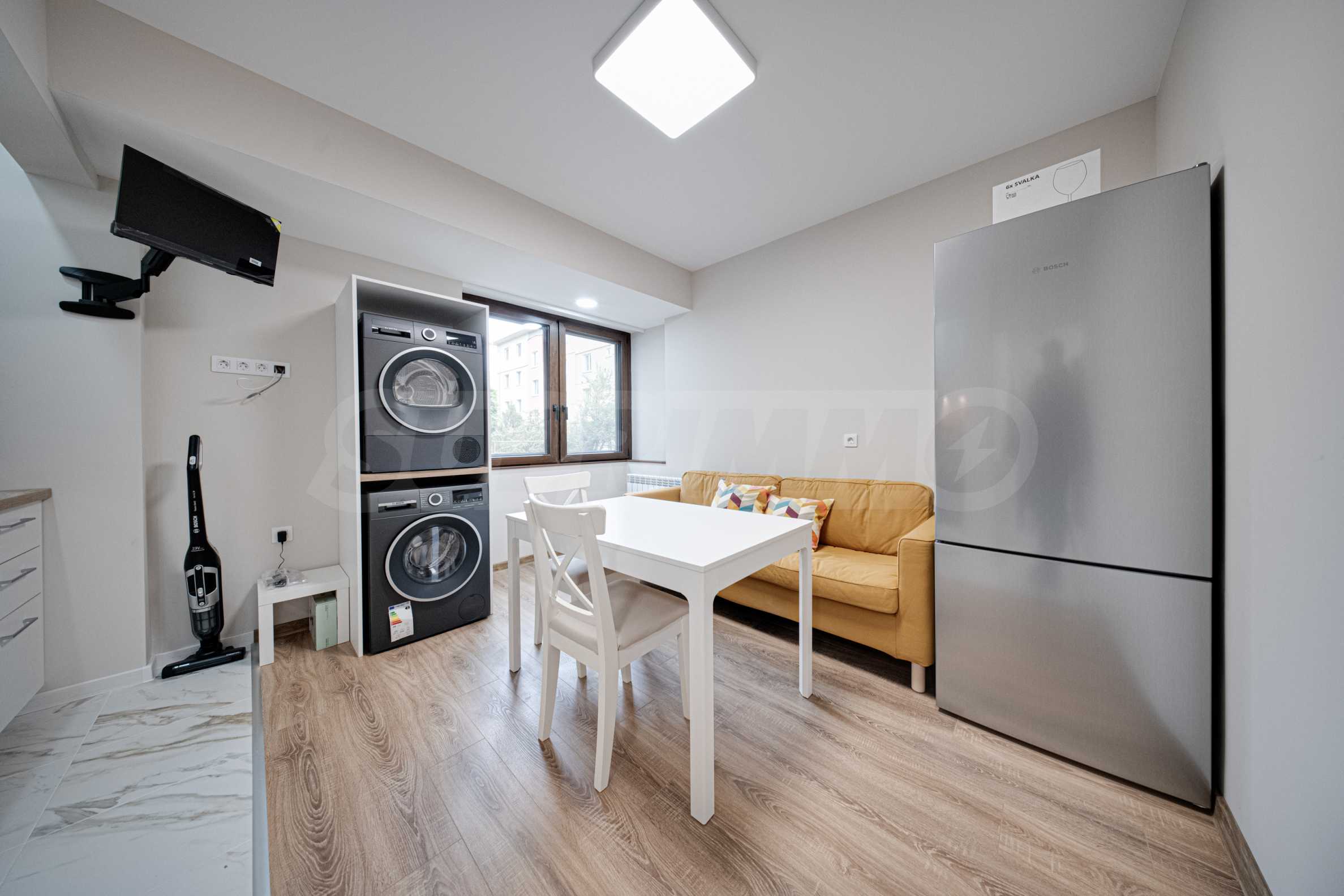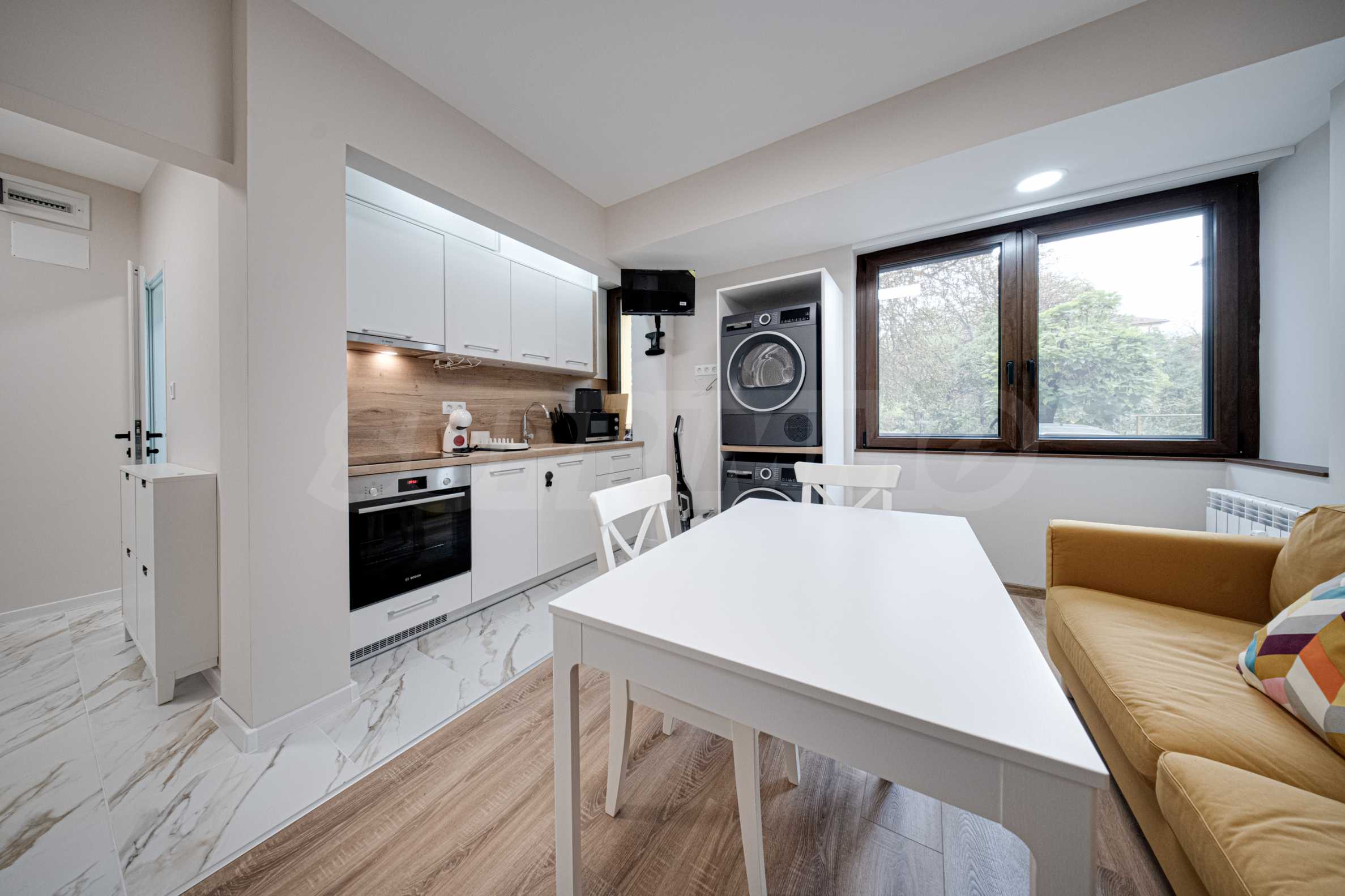- Дневна с модерна кухня – напълно оборудвана с висок клас уреди на марката Bosch, фурна, котлони, хладилник, миялна машина, пералня и сушилня, както и всякаква посуда за ежедневна употреба;