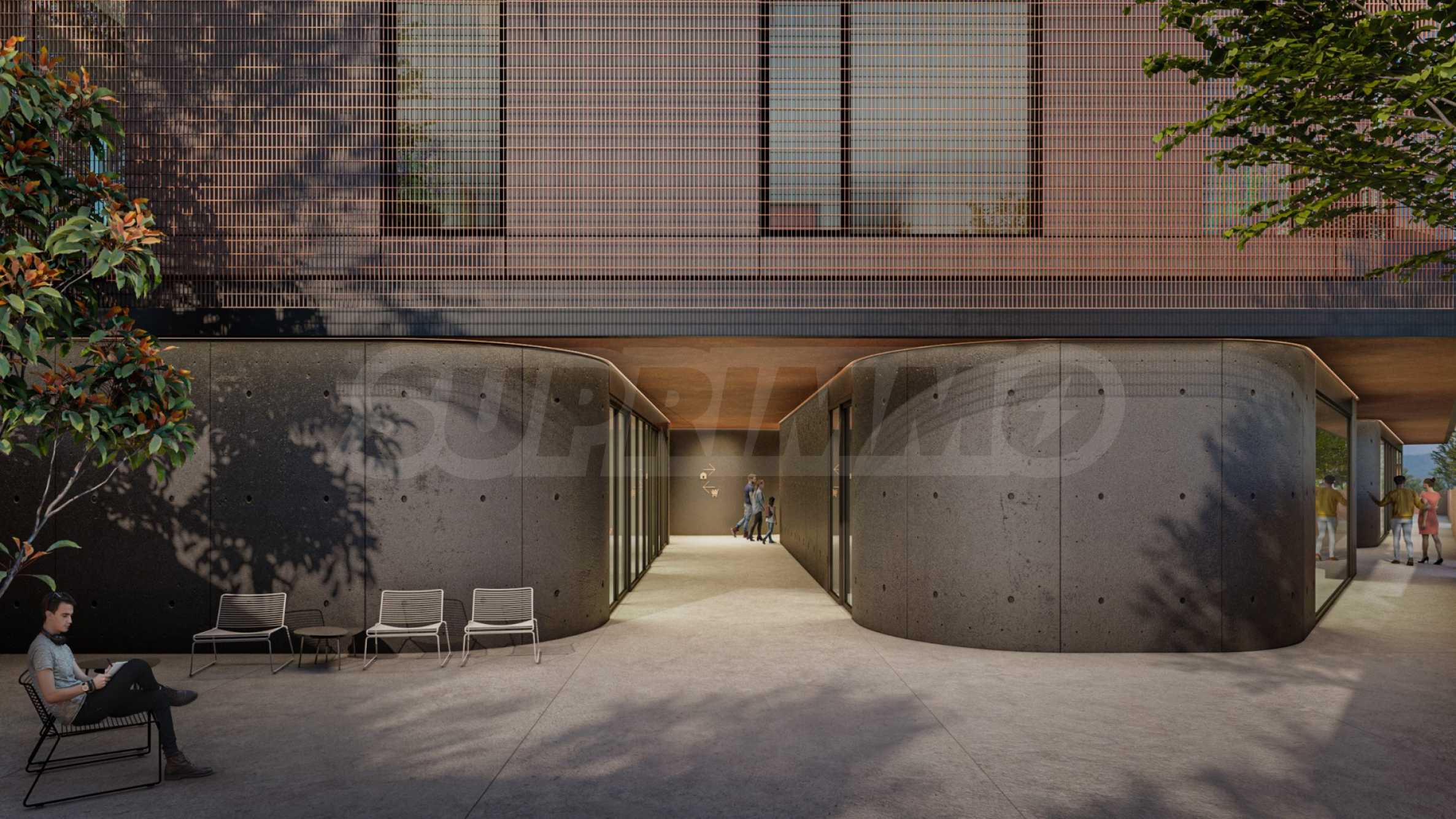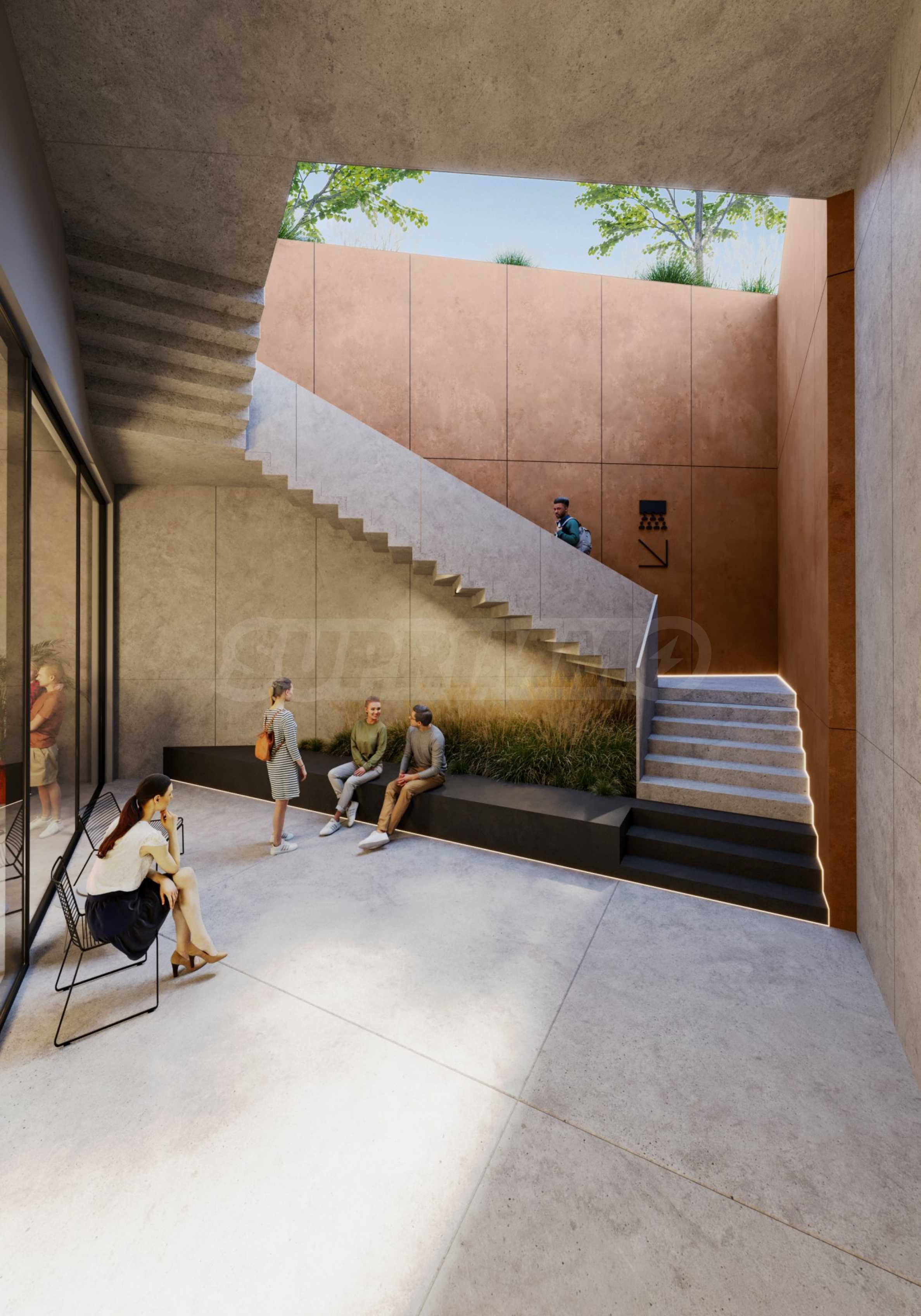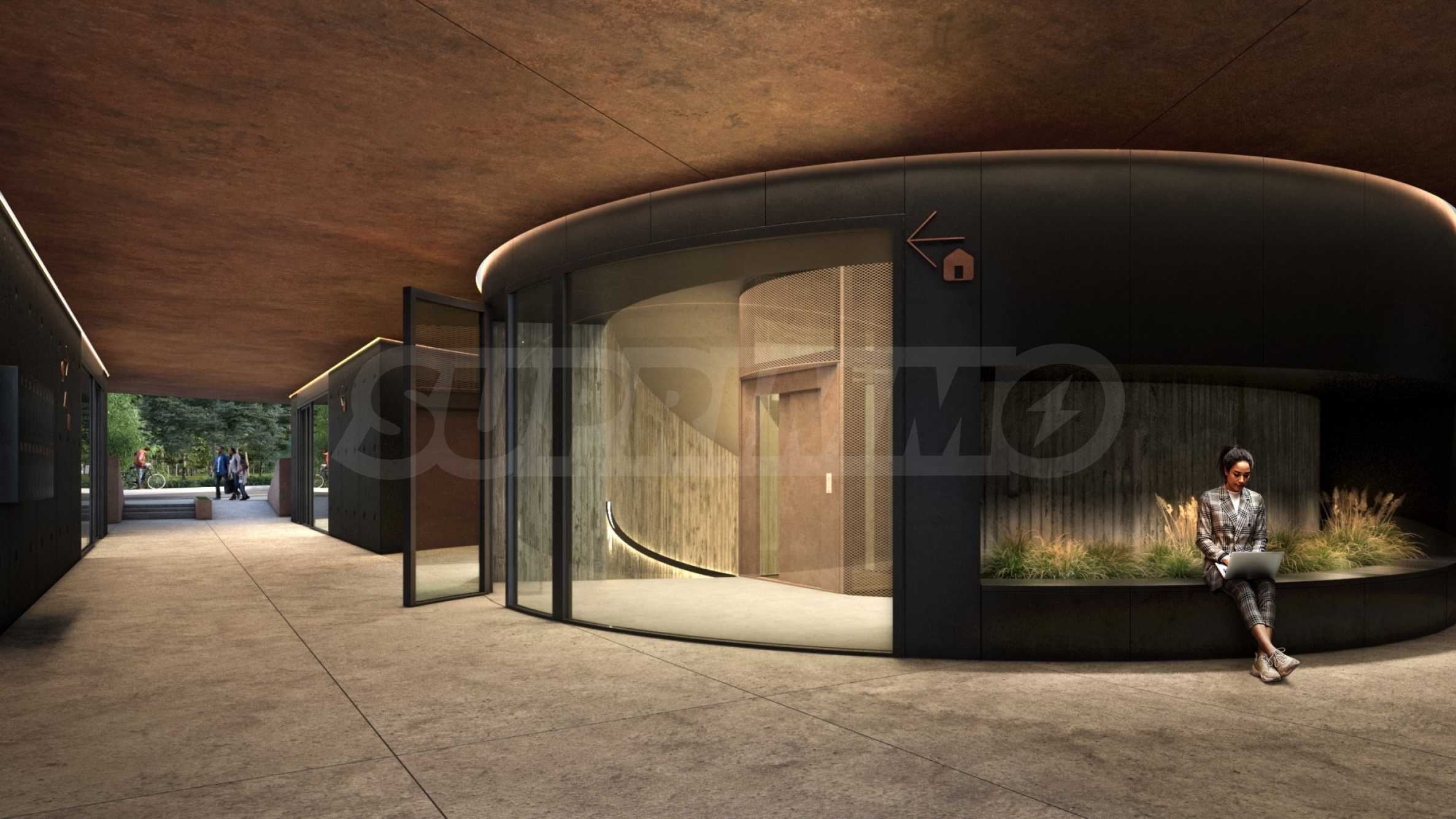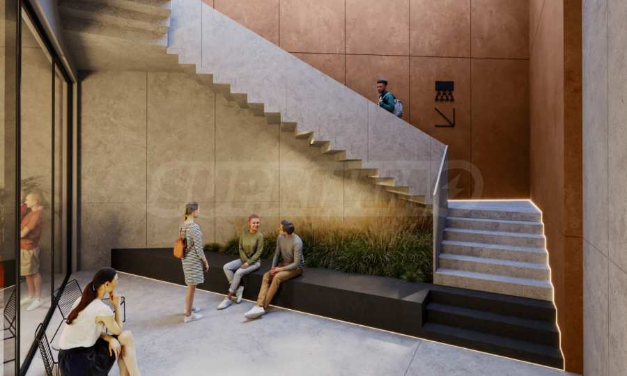 Сградата впечатлява със своята визия и модерни решения. На партерното ниво са разположени търговски обекти и ресторант. Общите части са изпълнени в индустриален стил с видим бетон, кортен, дизайнерско осветление и авторски постери, създаващи усещане за музей на модерното изкуство. Централното цилиндрично стълбищно пространство е озарено от естествена светлина, проникваща от покрива.