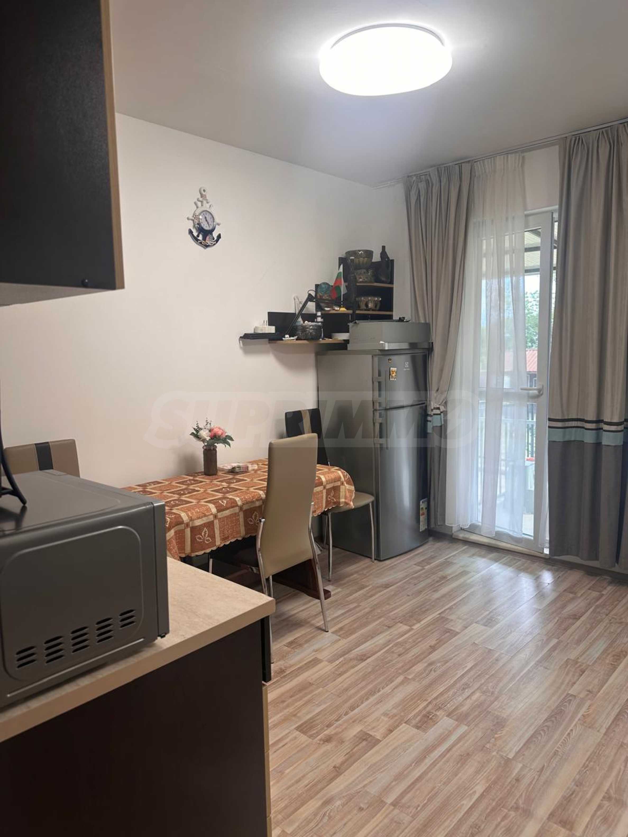Апартаментът е напълно обзаведен и оборудван с всичко необходимо за живеене като мебели и ел. уреди – телевизор, хладилник, климатик и др. Готов е за живеене или отдаване под наем.