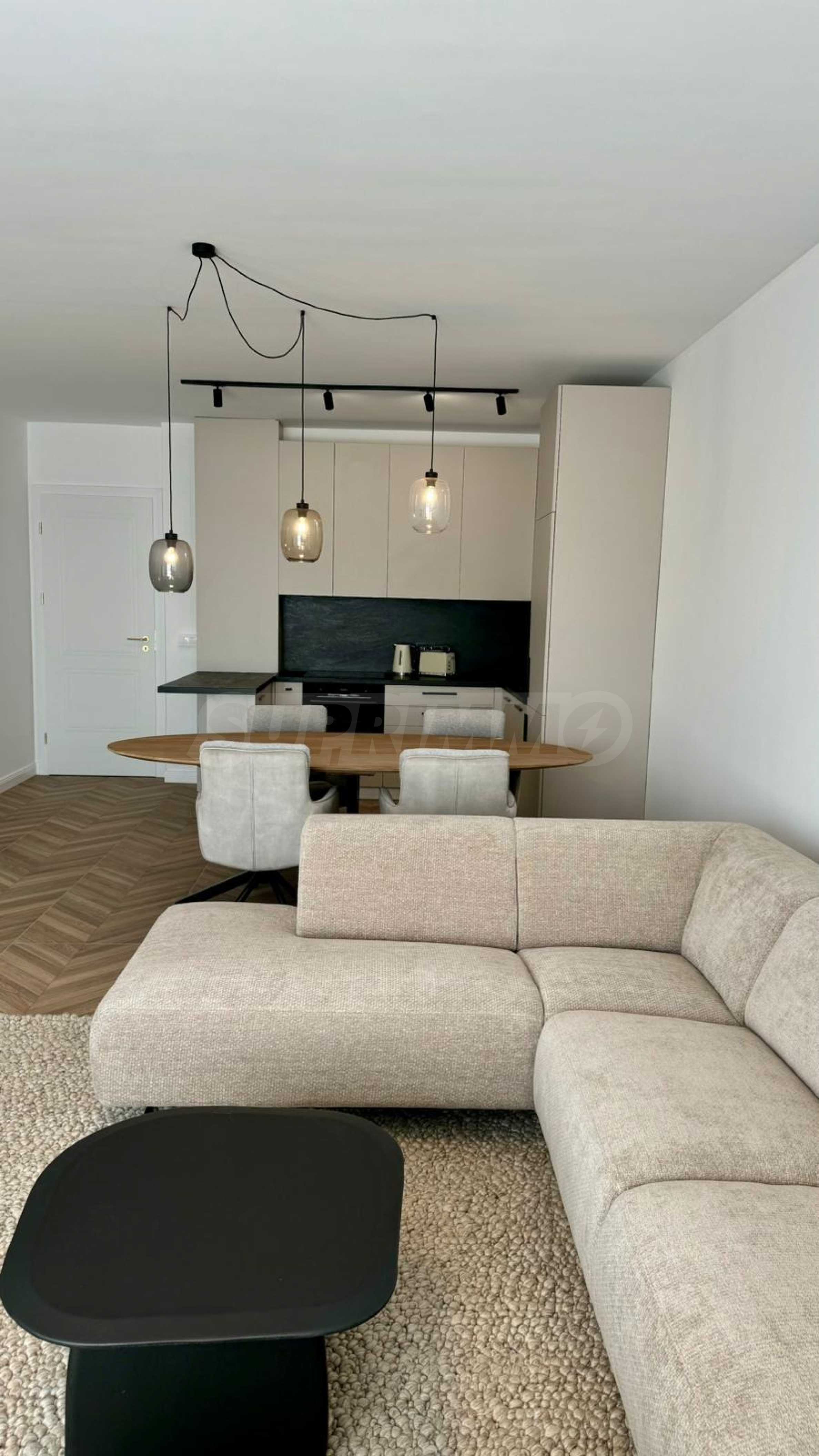 - Елегантна дневна зона с кухня и трапезария, обзаведена с дизайнерска мека мебел и излаз към просторна тераса;