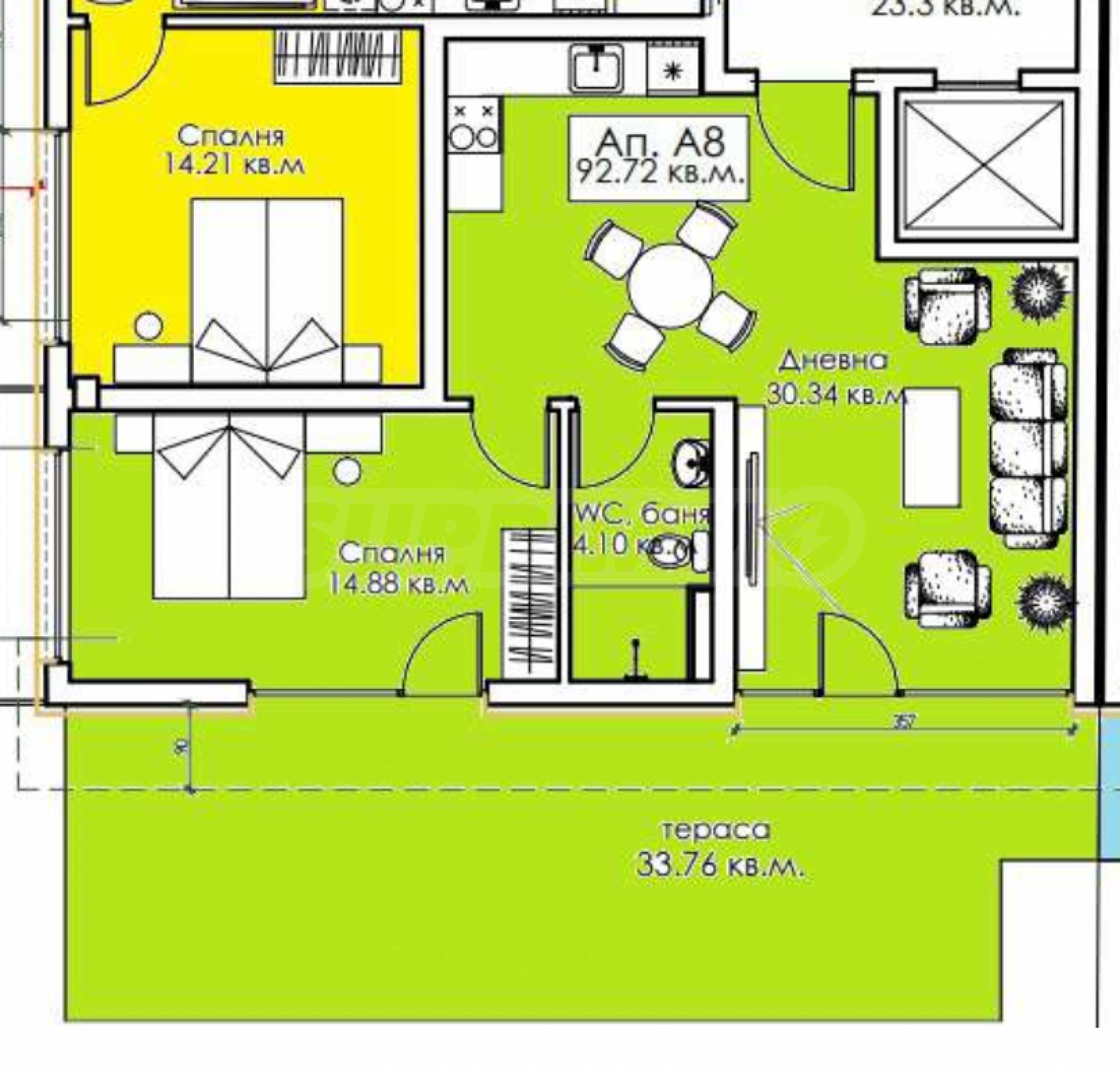 • разпределението включва всекидневна с кухня и трапезария, спалня, баня с тоалетна и голяма тераса с излаз към двете стаи.