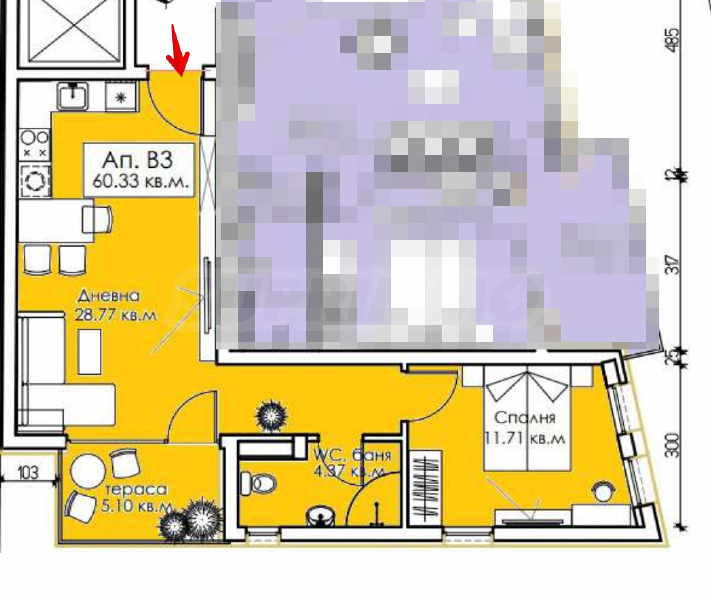 • разпределението включва всекидневна с кухня и трапезария, спалня, баня с тоалетна и голяма тераса с излаз към двете стаи.