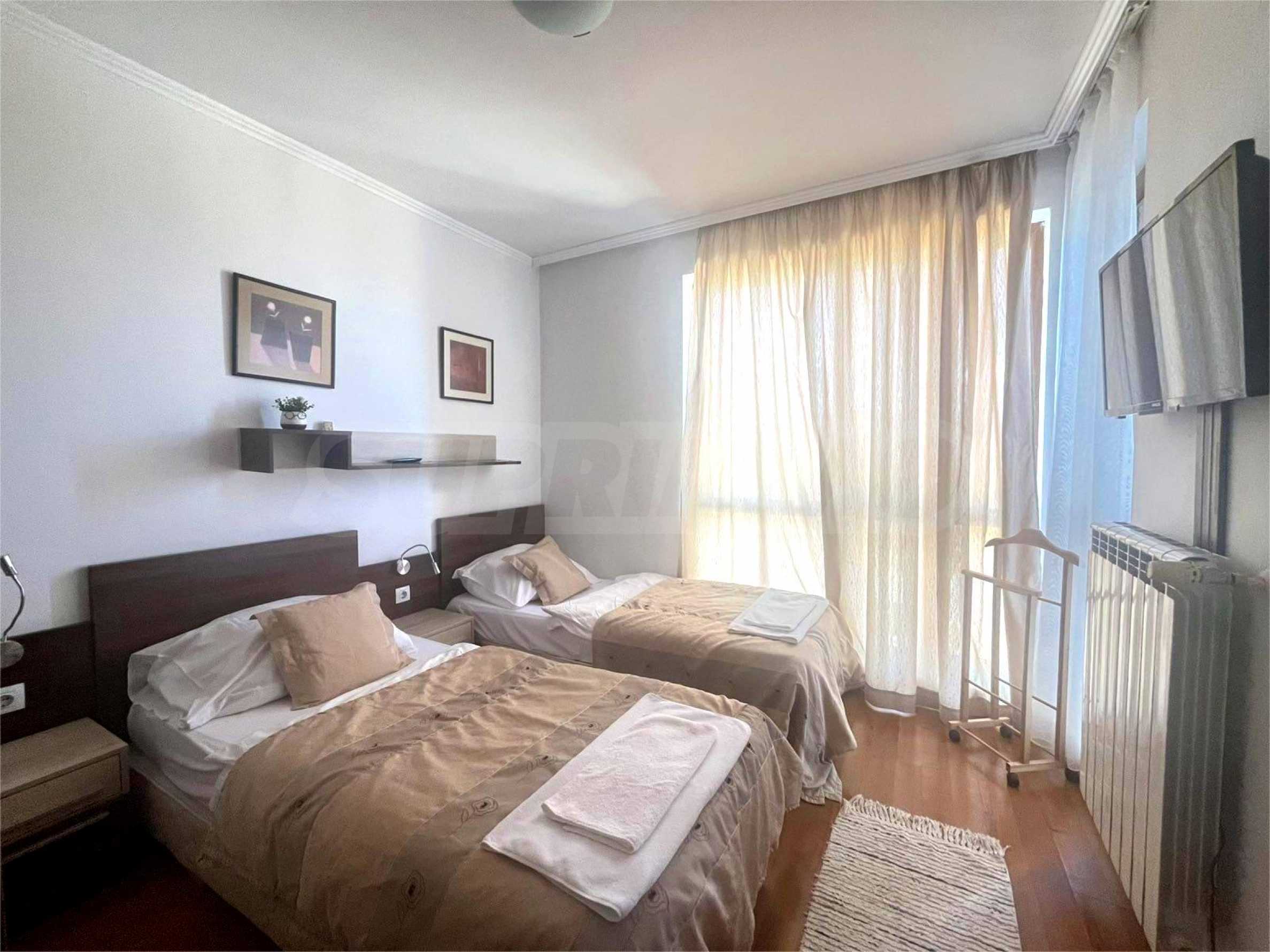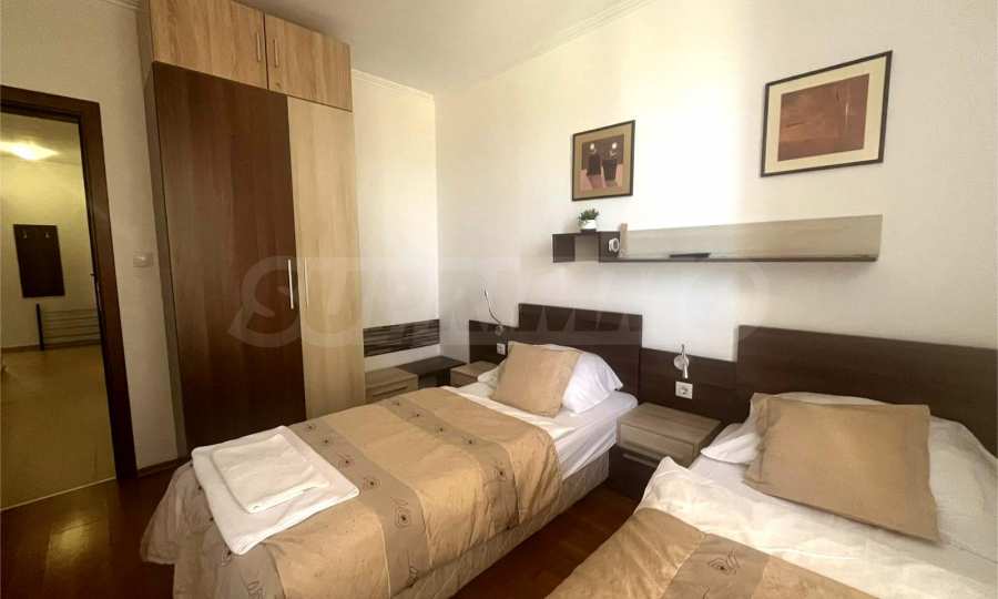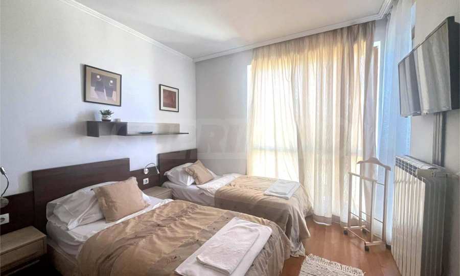 Първата спалня е обзаведена с две единични легла, нощни шкафчета, гардероб, телевизор и балкон;