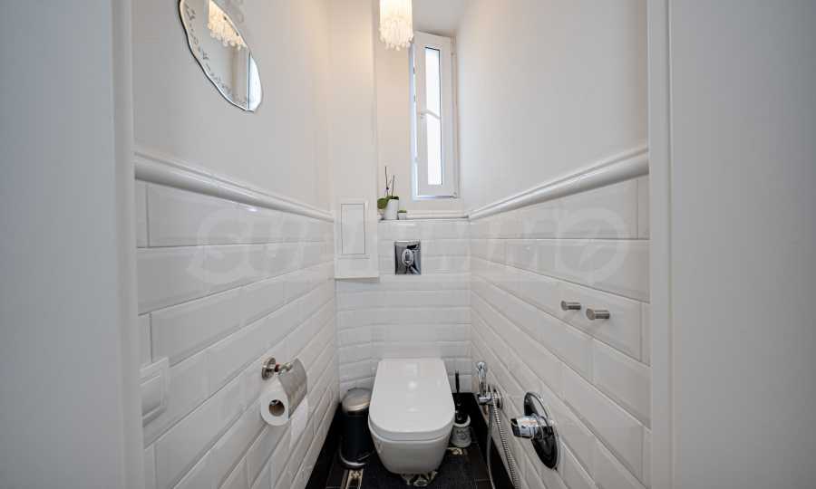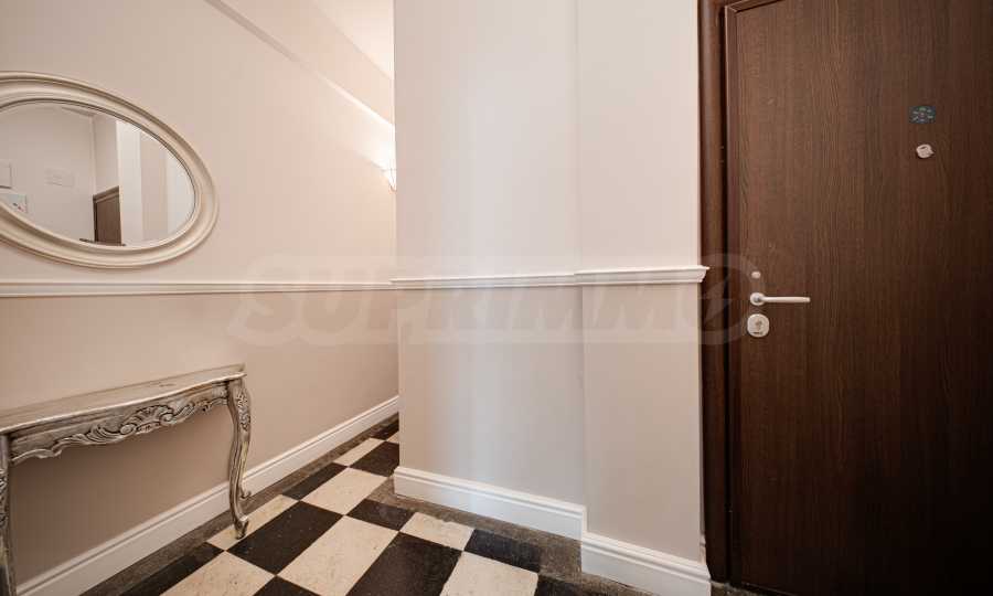 Апартаментът заема пети, предпоследен етаж. Изложението е югозапад/североизток и предоставя гледка към площад Славейков. Изпълнено е със следните довършителни работи:
